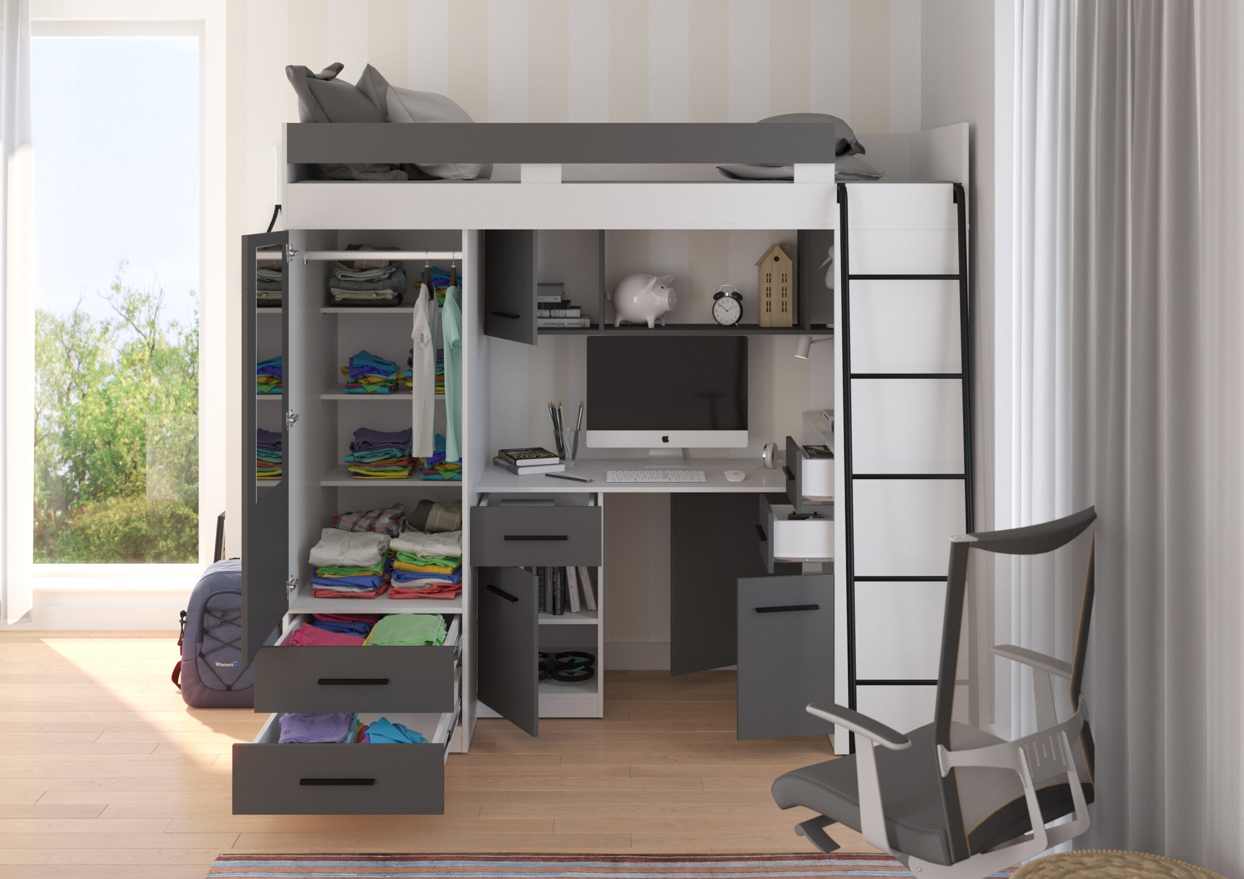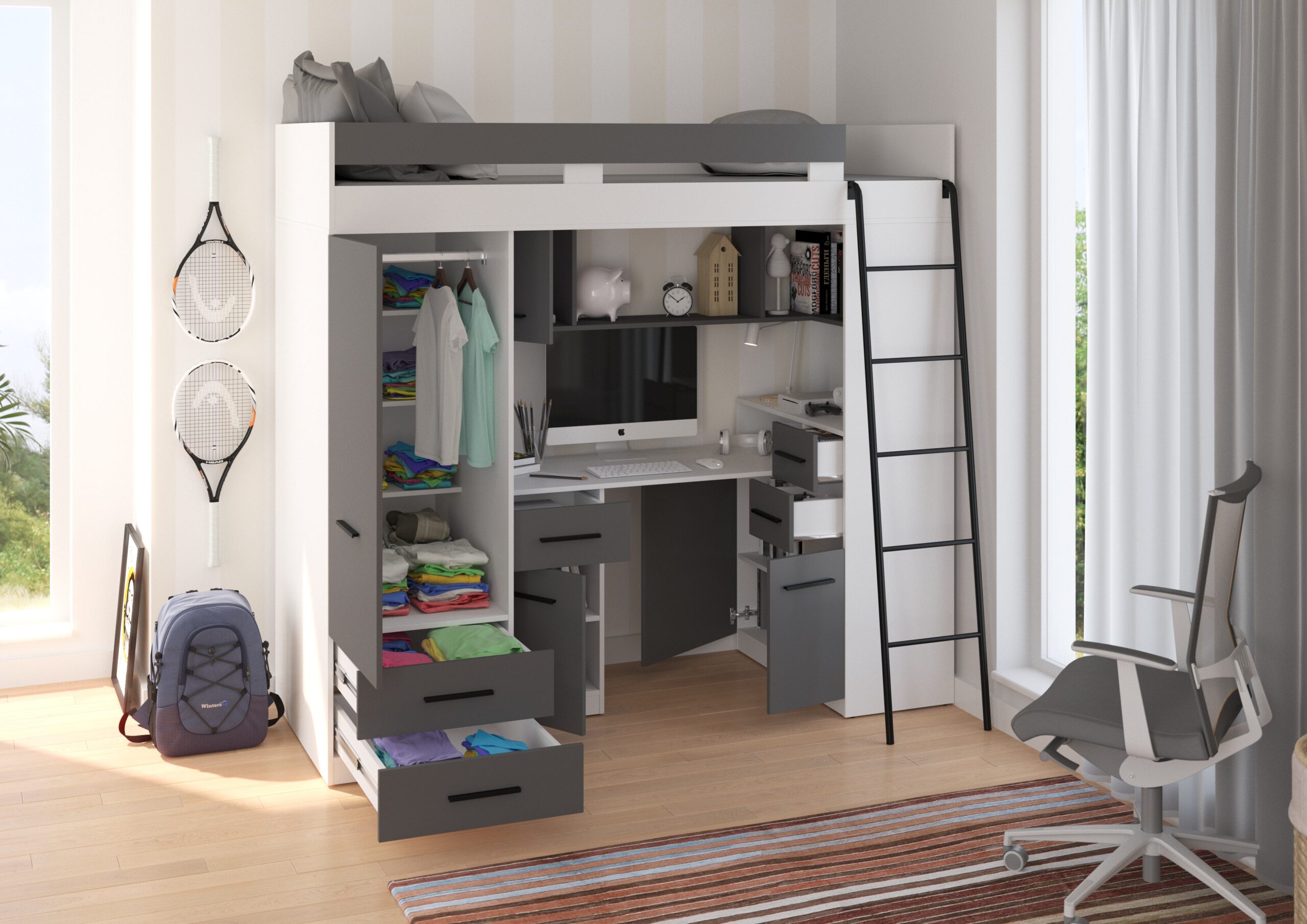 Strefa nauki pod antresolą to przemyślany warsztat młodego odkrywcy. Ergonomiczne biurko z zintegrowaną szufladą i szafką pozwala na swobodną pracę z komputerem lub naukę przy tradycyjnych podręcznikach. Bezpośrednio obok znajduje się regał z zamykanymi frontami, który ułatwia segregację dokumentów, książek czy sprzętu elektronicznego, chroniąc je przed kurzem. Białe fronty rozświetlają wnękę biurka, a grafitowe korpusy wprowadzają elegancką głębię, tworząc klimat sprzyjający skupieniu i twórczej pracy.