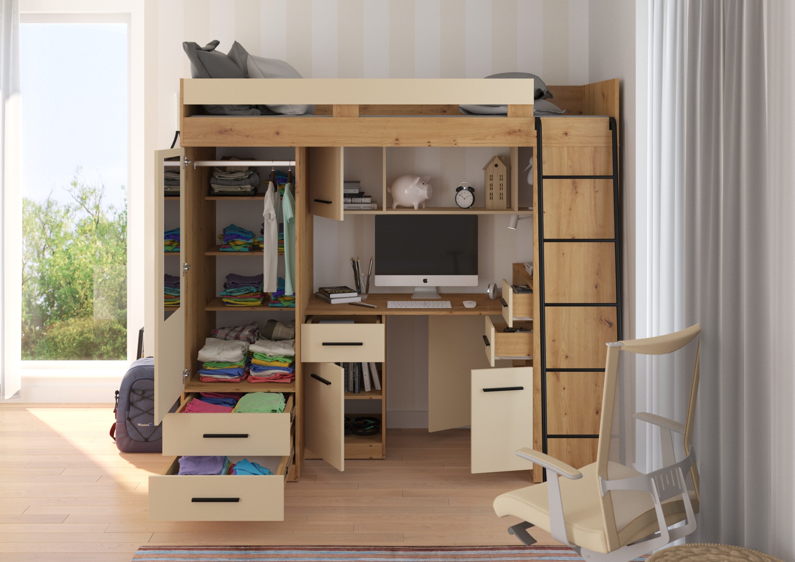 Zaprojektowanie pokoju, który ma być jednocześnie sypialnią, biurem i garderobą, to wyzwanie, na które antresola SMYK odpowiada w sposób mistrzowski. Zastosowanie dekoru dąb artisan z jego charakterystycznym usłojeniem w zestawieniu z gładkimi, kremowymi frontami sprawia, że mebel prezentuje się niezwykle stylowo i przytulnie. Wysoka konstrukcja (188 cm) pozwala na pionowe zagospodarowanie pokoju, co jest zbawienne w niewielkich metrażach – tam, gdzie tradycyjnie zmieściłoby się tylko łóżko, SMYK oferuje kompletnie wyposażone królestwo dla Twojego dziecka.