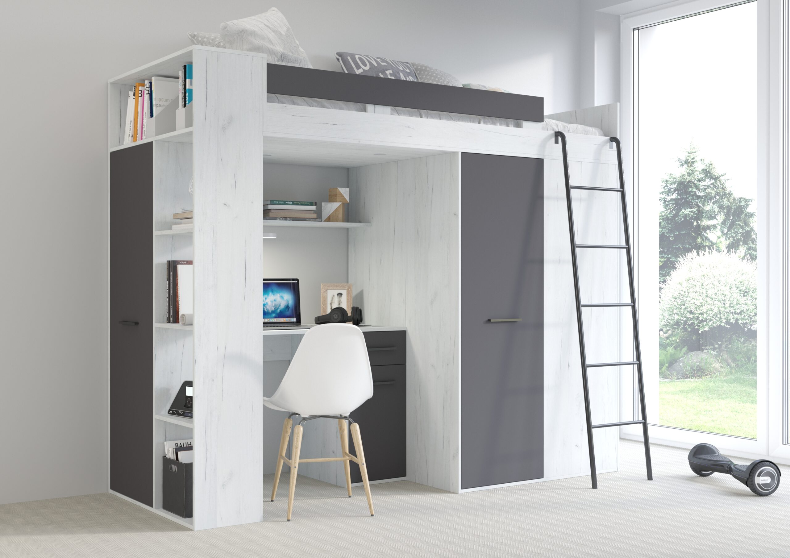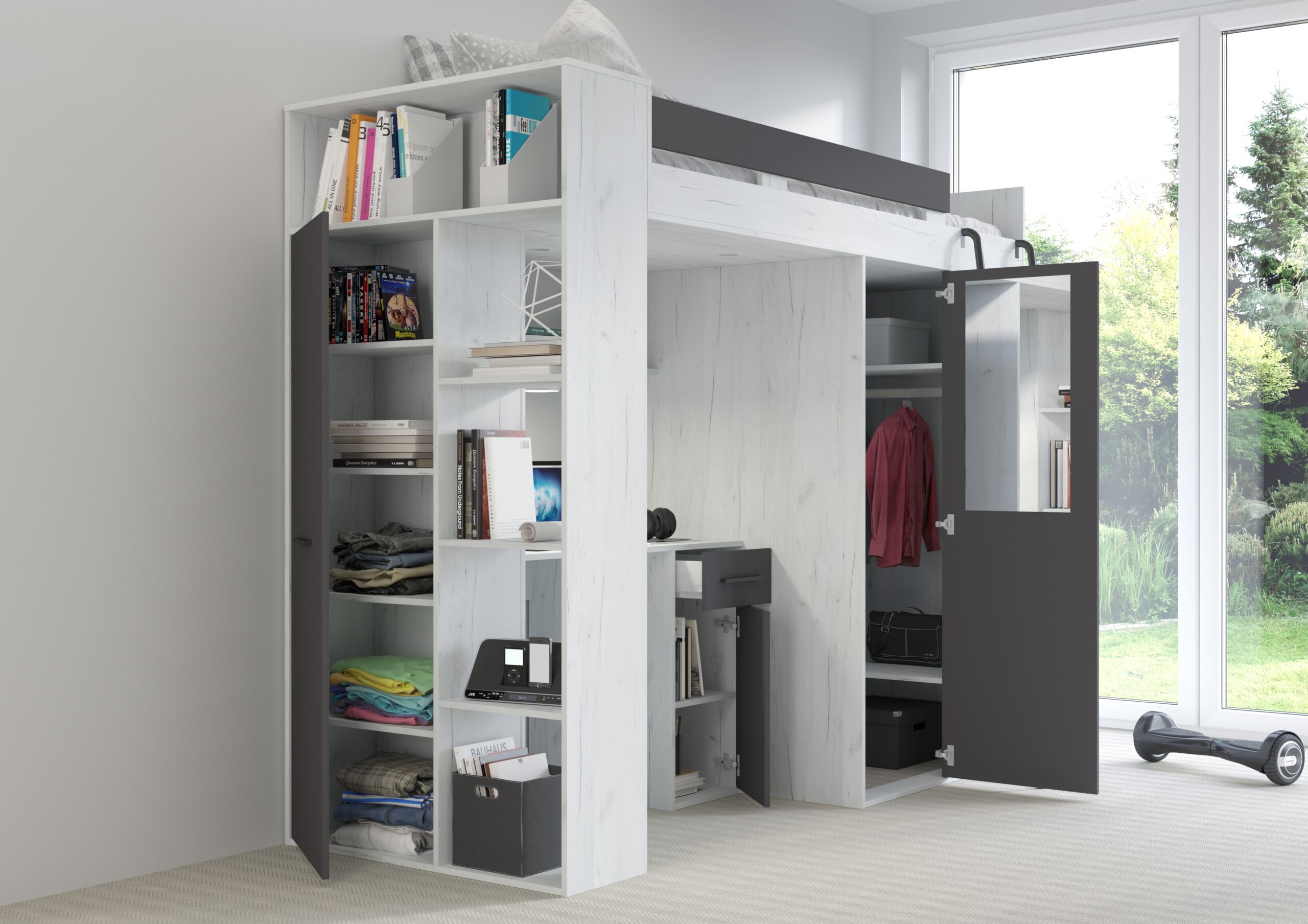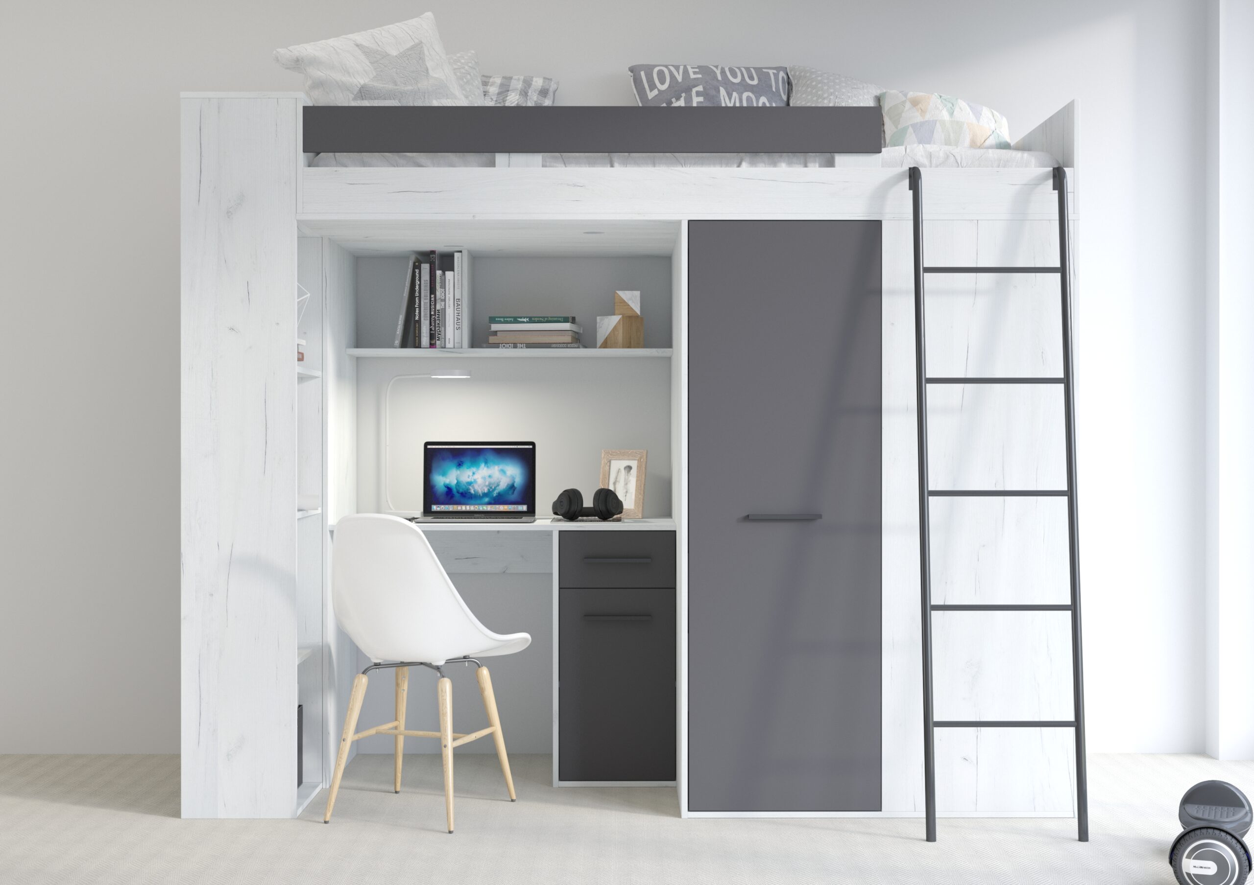 Zyskujesz nieprawdopodobną oszczędność miejsca bez utraty funkcjonalności. Pod bezpiecznym łóżkiem znajduje się pełnowymiarowe centrum dowodzenia: szerokie biurko stworzone do pracy przy komputerze oraz zintegrowany system przechowywania. Pojemna szafa i regał pozwalają na perfekcyjną organizację ubrań i podręczników, co pomaga utrzymać porządek w pokoju bez wysiłku. Wszystko jest pod ręką, co skraca czas potrzebny na przygotowanie się do szkoły i zostawia więcej miejsca na podłodze na rozwijanie pasji czy spotkania z przyjaciółmi.
