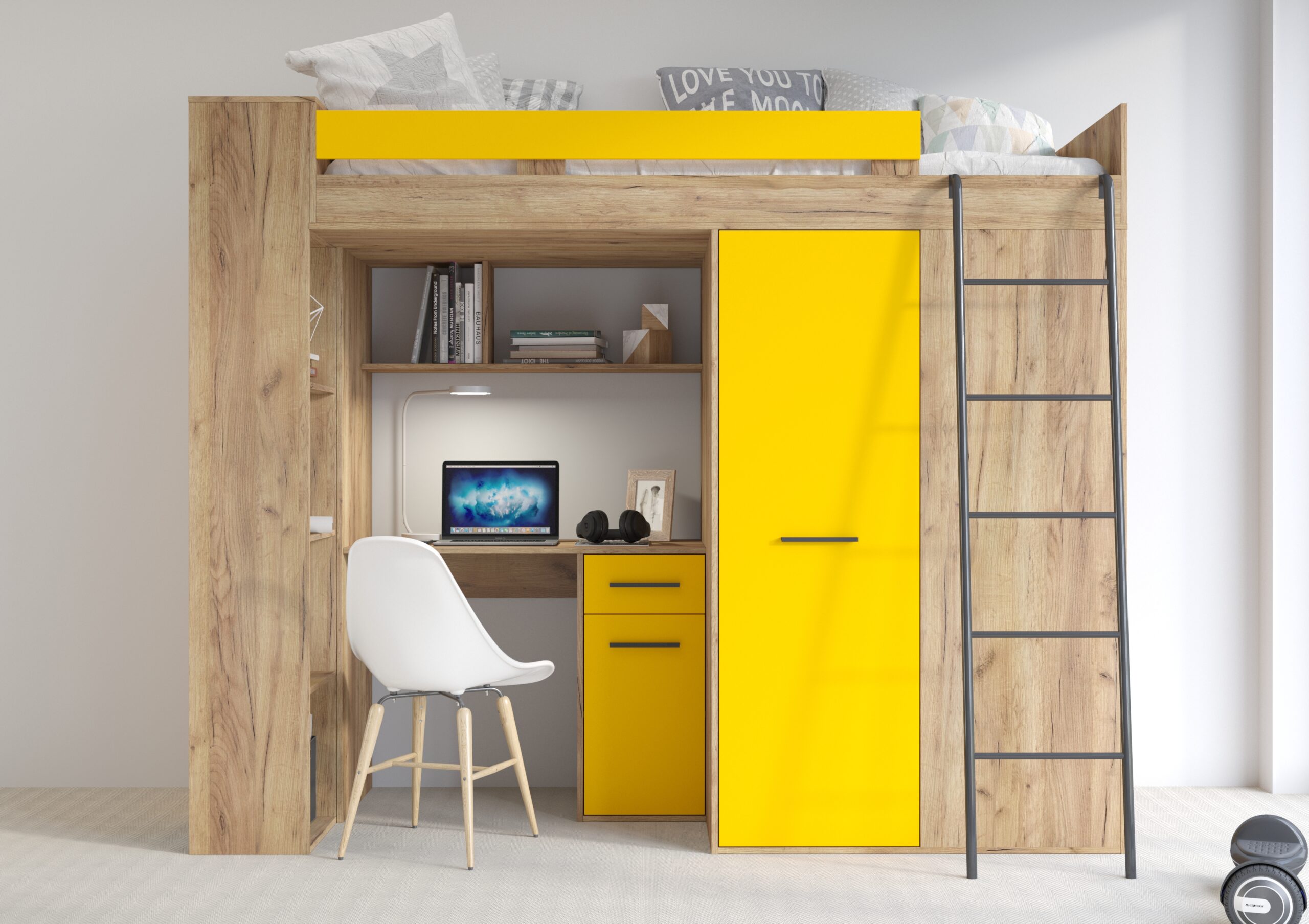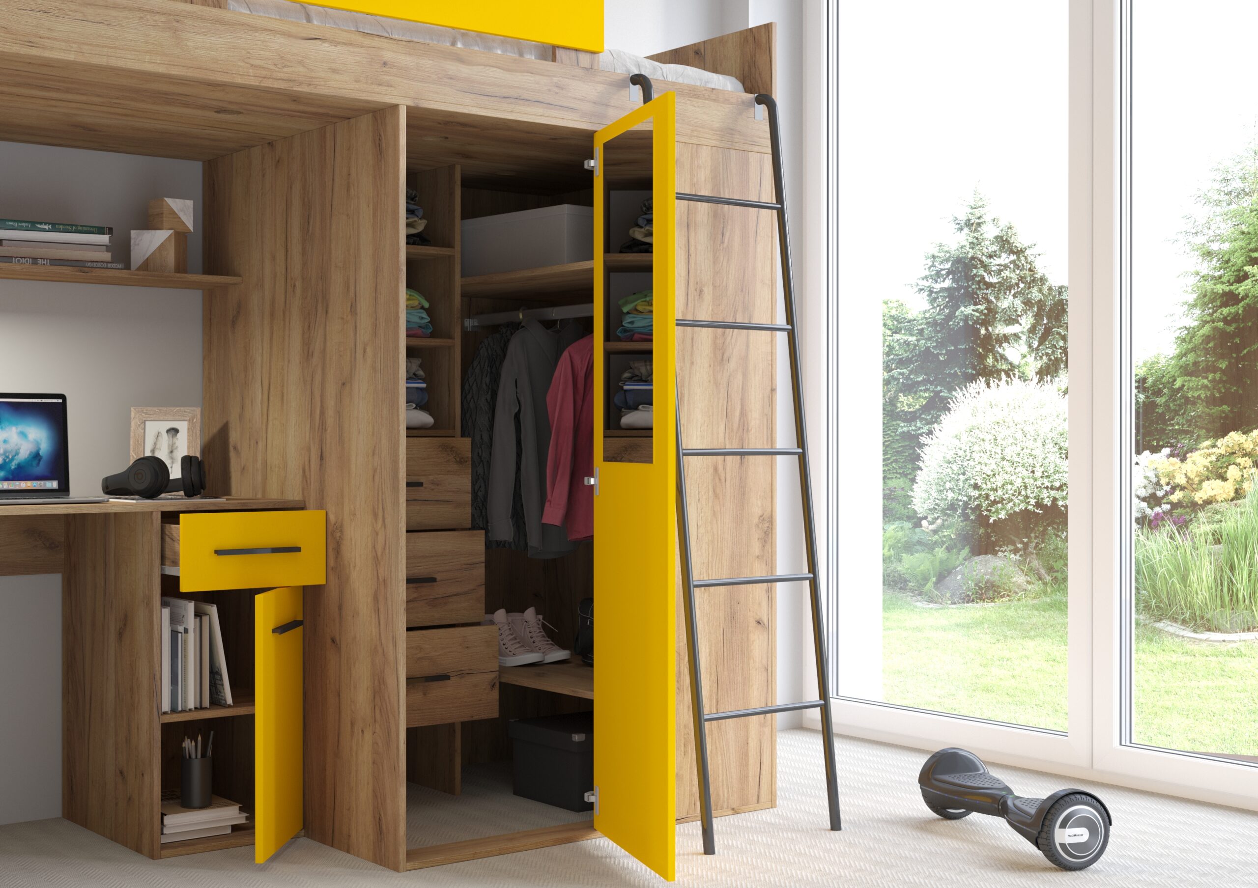 Antresola Verana w duecie złotego dębu i soczystej żółci to zastrzyk pozytywnej energii dla każdego wnętrza. Ten niezwykle praktyczny mebel 4w1 integruje komfortowe łóżko, biurko, szafę oraz regał, tworząc spójną strefę nauki i relaksu na minimalnej przestrzeni. Ciepła struktura drewna Craft Złoty w połączeniu z radosnymi frontami wprowadza do pokoju przytulność i nowoczesny styl. Dzięki polskiej produkcji oraz certyfikatom bezpieczeństwa zyskujesz trwałe i bezpieczne centrum dowodzenia, które pobudza wyobraźnię i ułatwia codzienną organizację Twojemu dziecku.