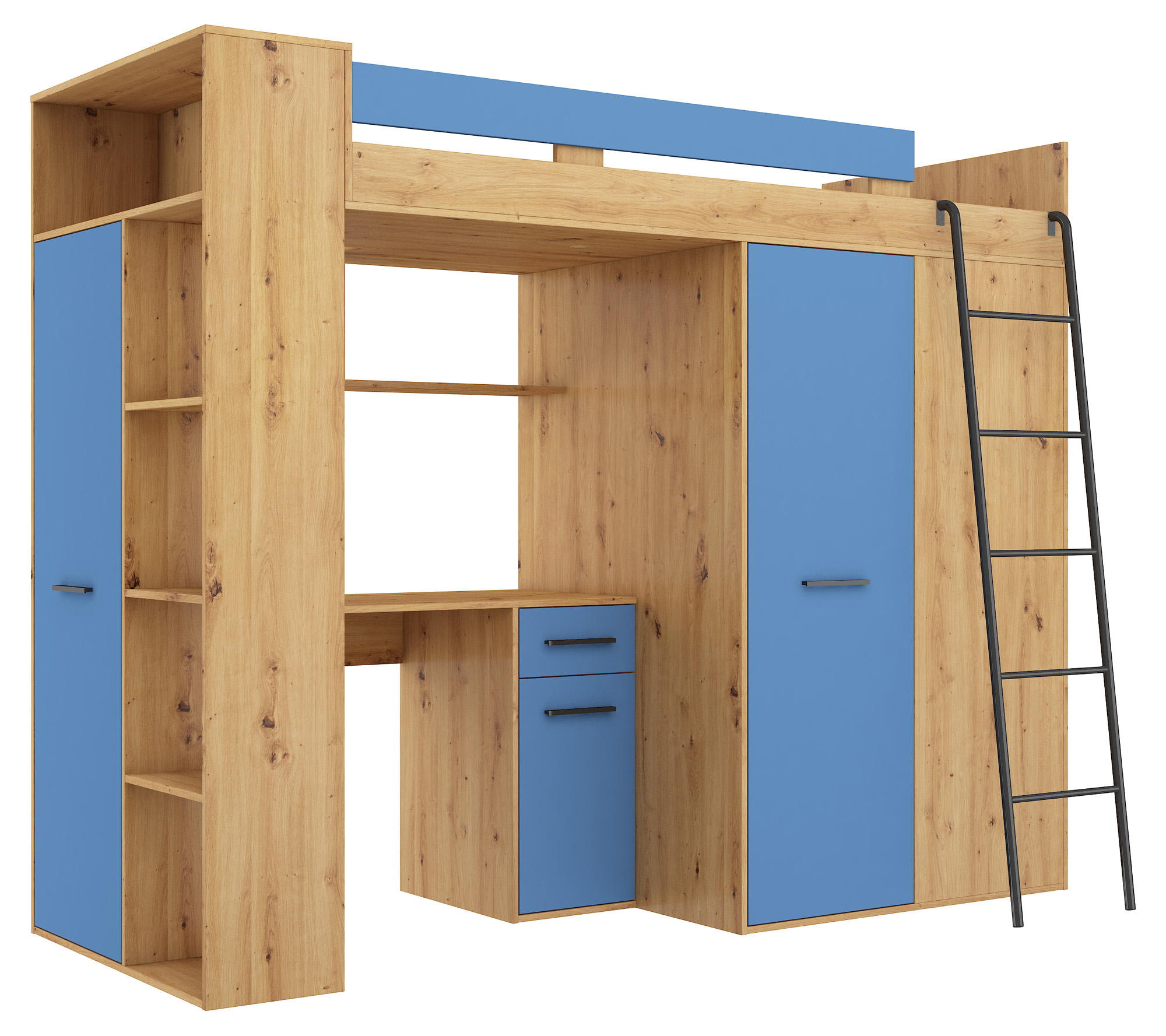 Pokój dziecka lub nastolatka musi być elastyczny – rano to biuro, po południu miejsce spotkań, a nocą azyl do wypoczynku. Antresola Verana w kolorystyce dąb artisan i niebieski idealnie wpisuje się w ten rytm. Połączenie dębowego korpusu o wyraźnym usłojeniu z intensywnymi, niebieskimi frontami tworzy przestrzeń pełną charakteru i świeżości. Niebieski kolor sprzyja wyciszeniu emocji, a jednocześnie stymuluje umysł do pracy, co czyni dolną część mebla idealnym stanowiskiem do odrabiania lekcji czy rozwijania pasji przy komputerze.
