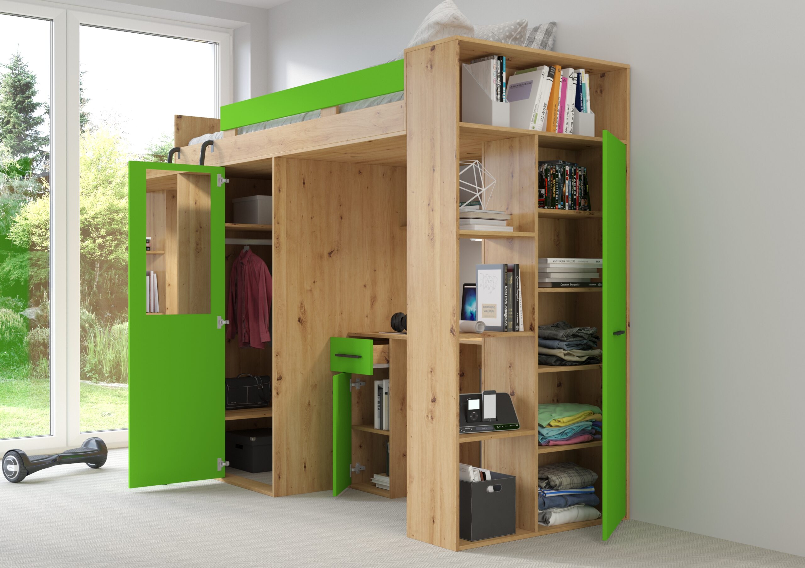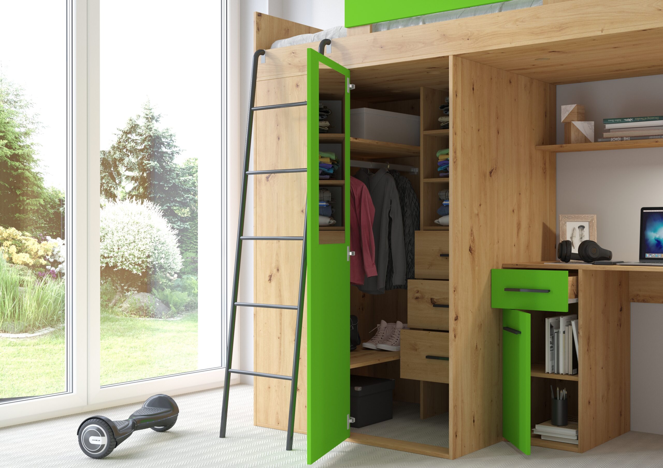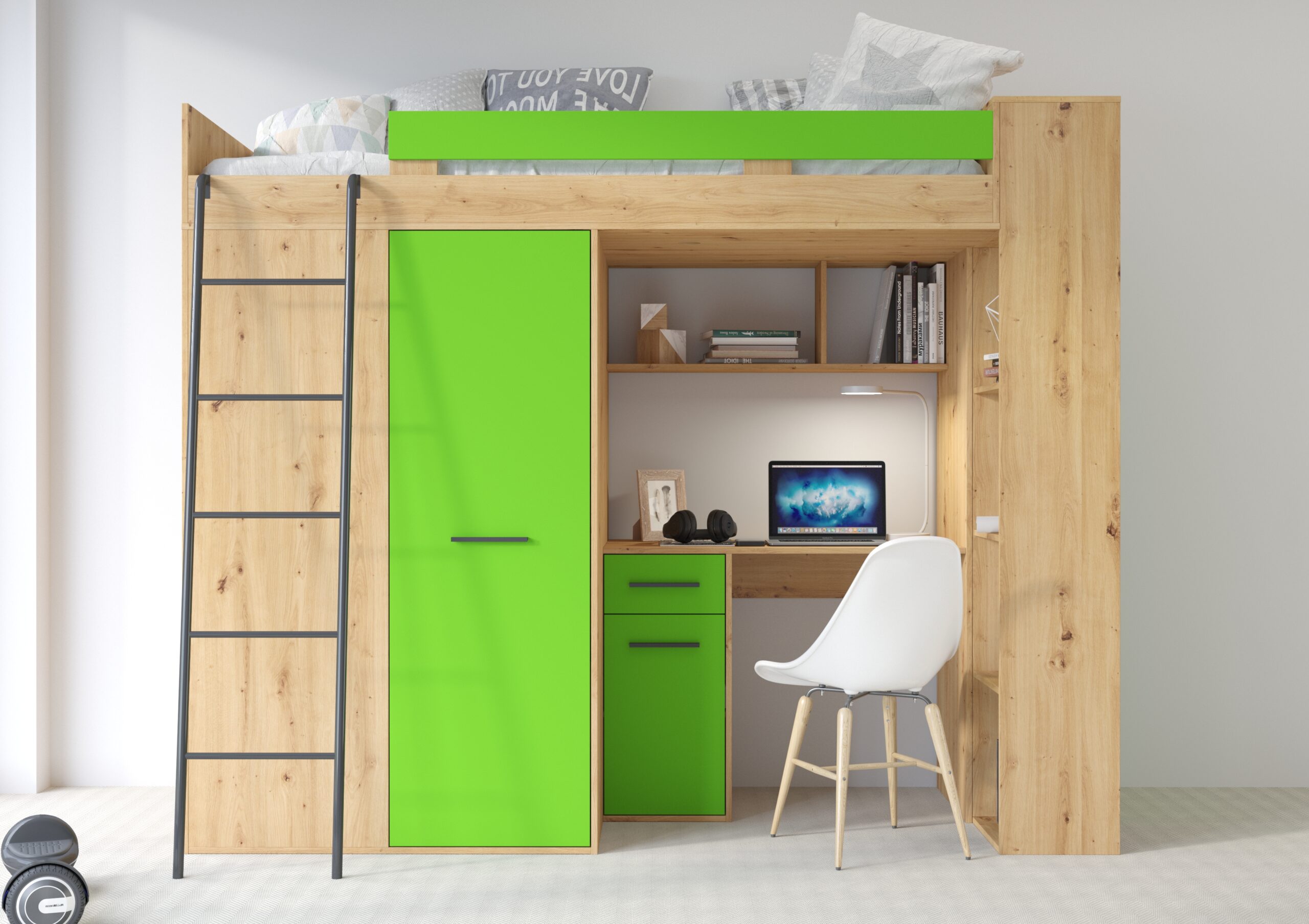 Wybierając antresolę VERANA w kolorze dębu Artisan z zielenią, stawiasz na mebel, który inspiruje do lepszej organizacji i harmonijnego stylu życia. To nie tylko miejsce do spania, ale kompletne centrum dowodzenia młodego człowieka, które ułatwia utrzymanie porządku i nadaje wnętrzu unikalnego, nowoczesnego charakteru.