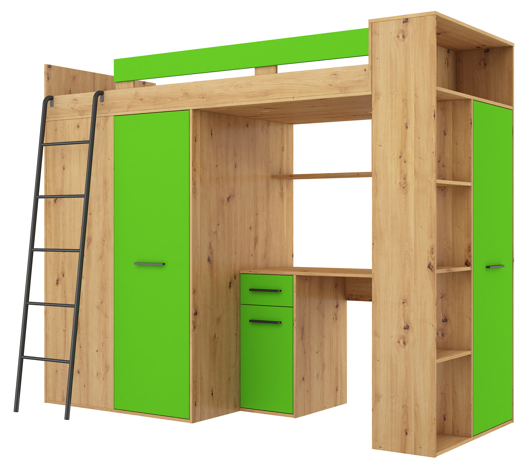 Antresola łóżko piętrowe VERANA strona LEWA dąb artisan / zielony