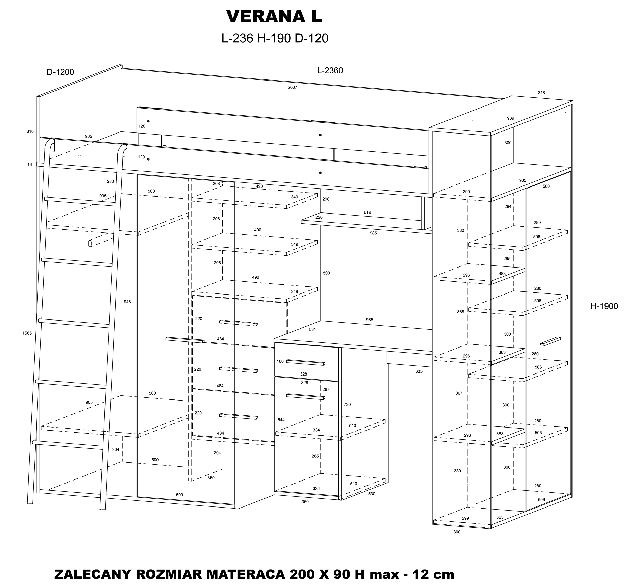 Projekt VERANY kładzie nacisk na absolutną użyteczność każdego centymetra. Górny poziom to bezpieczne miejsce snu o powierzchni 90×200 cm, natomiast dół został zagospodarowany jako kompletne stanowisko do pracy i przechowywania. Biurko zapewnia wygodną przestrzeń pod laptopa i notatki, a zintegrowany regał pozwala mieć podręczniki zawsze pod ręką. Niezwykle praktycznym rozwiązaniem jest szafa ubraniowa z systemem cichego domyku – mechanizm ten eliminuje hałas przy zamykaniu drzwi, co jest kluczowe w pokoju współdzielonym lub podczas wieczornej ciszy, a jednocześnie chroni fronty przed uszkodzeniami.