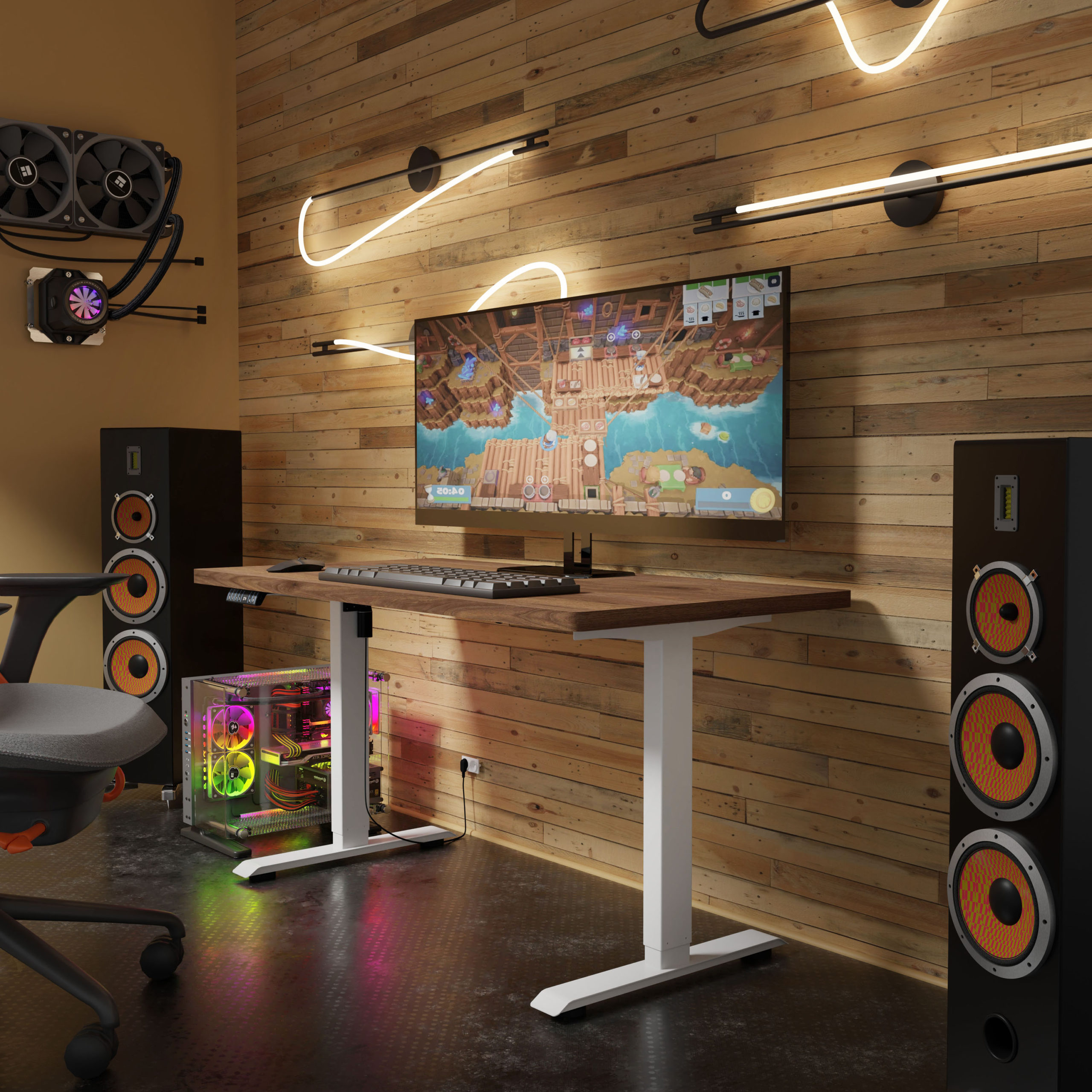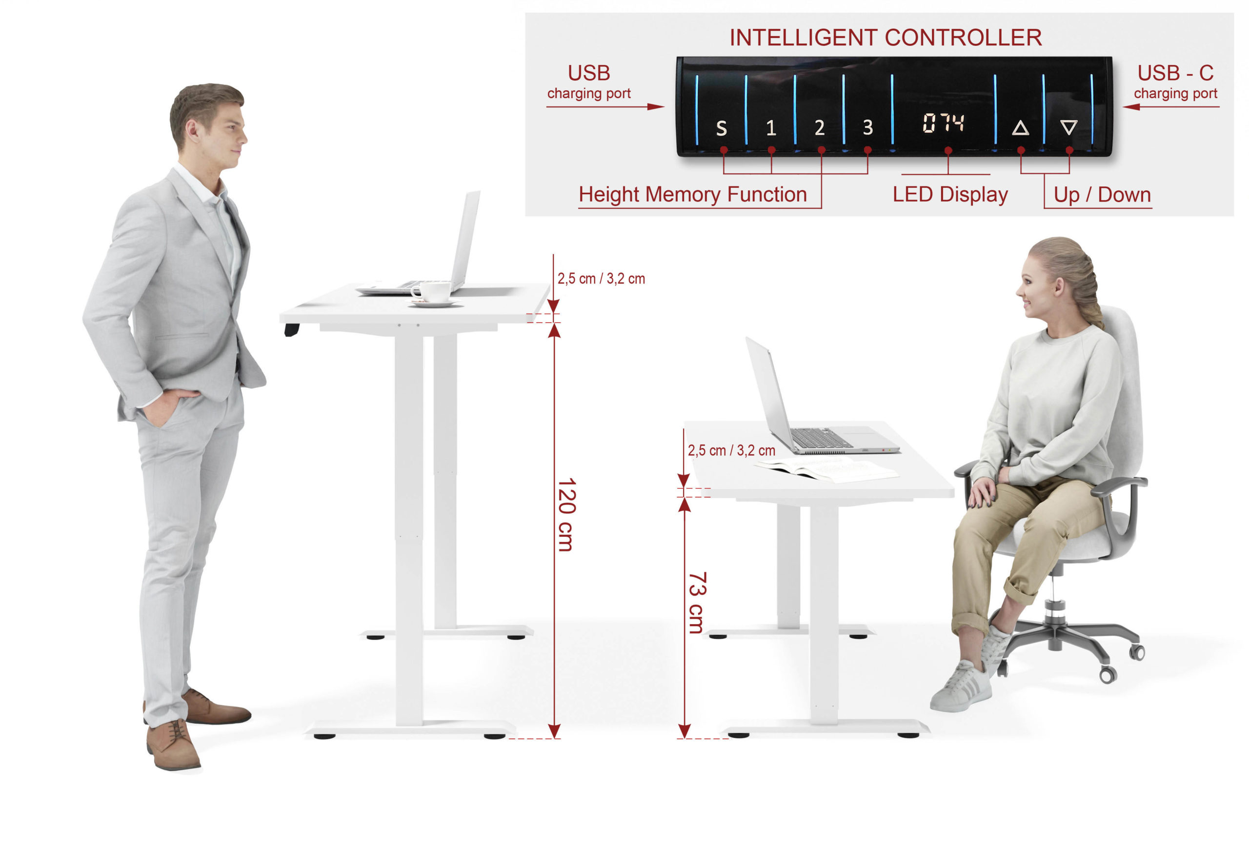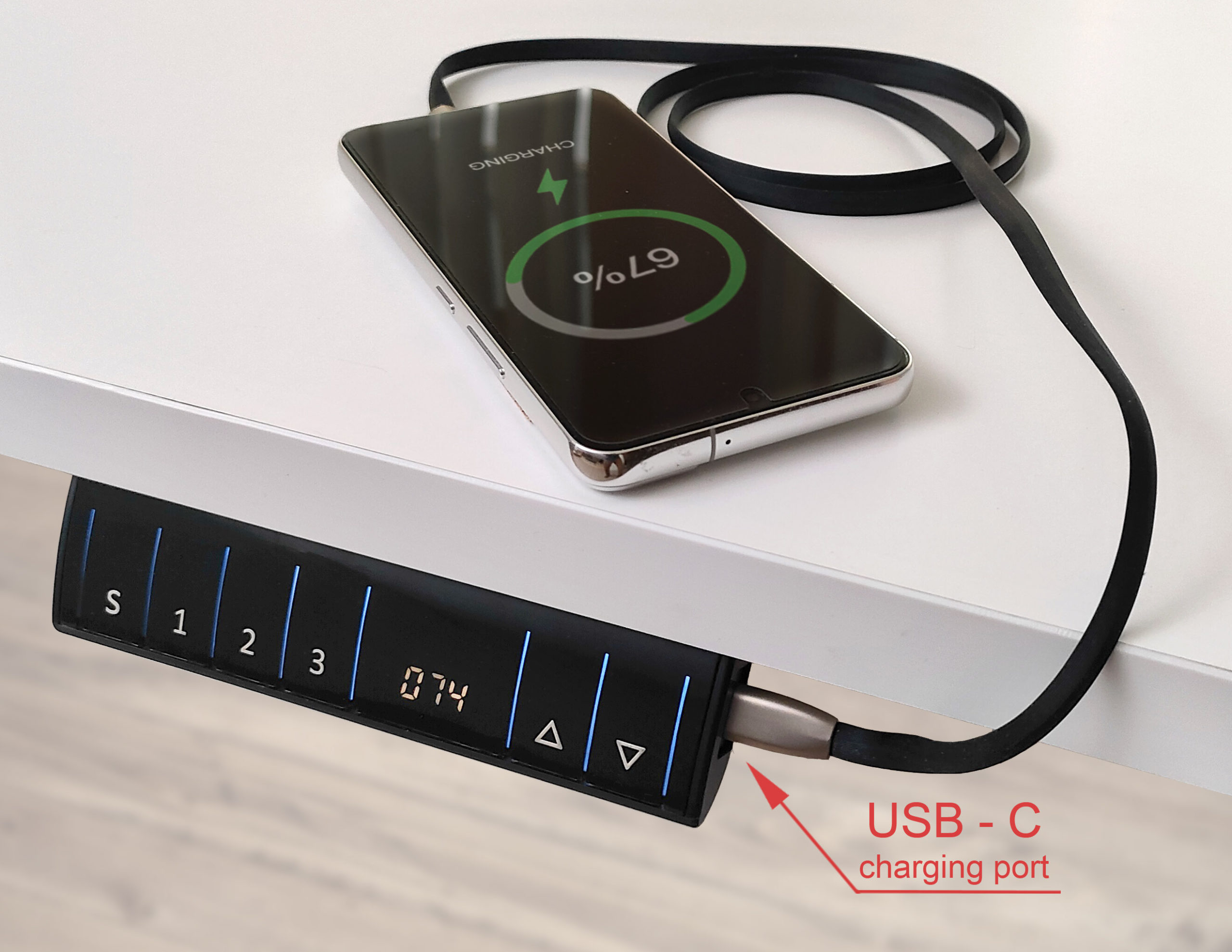 Inteligentne rozwiązania techniczne dbają o Twój spokój i porządek. Nowoczesny panel sterowania LED został wyposażony w funkcjonalne porty USB i USB-C, co pozwala na ładowanie urządzeń bezpośrednio przy stanowisku pracy – bez zbędnych kabli zwisających z krawędzi blatu. O bezpieczeństwo Twojego sprzętu i otoczenia dba system antykolizyjny, który zatrzyma proces regulacji w momencie wykrycia przeszkody, oraz blokada rodzicielska. Możesz w pełni oddać się projektom, wiedząc, że mechanizm działa precyzyjnie, cicho i bezpiecznie.