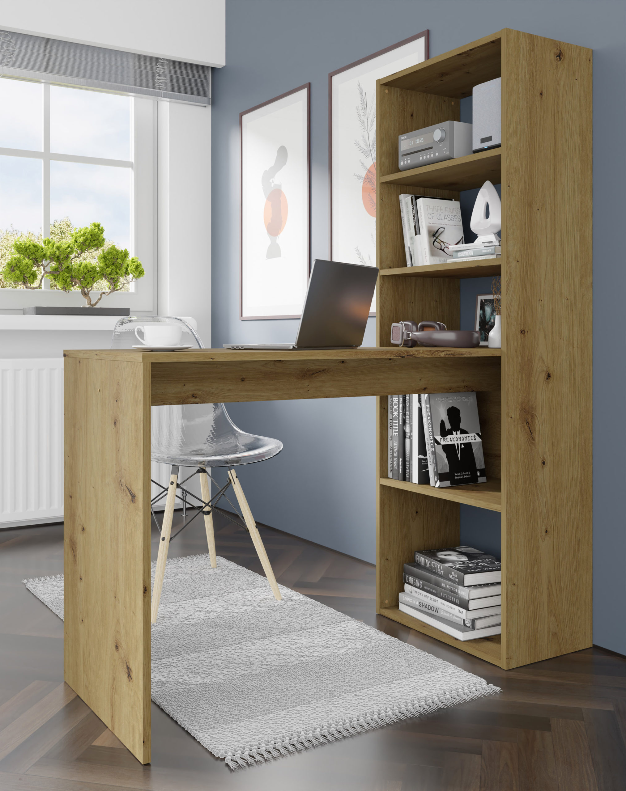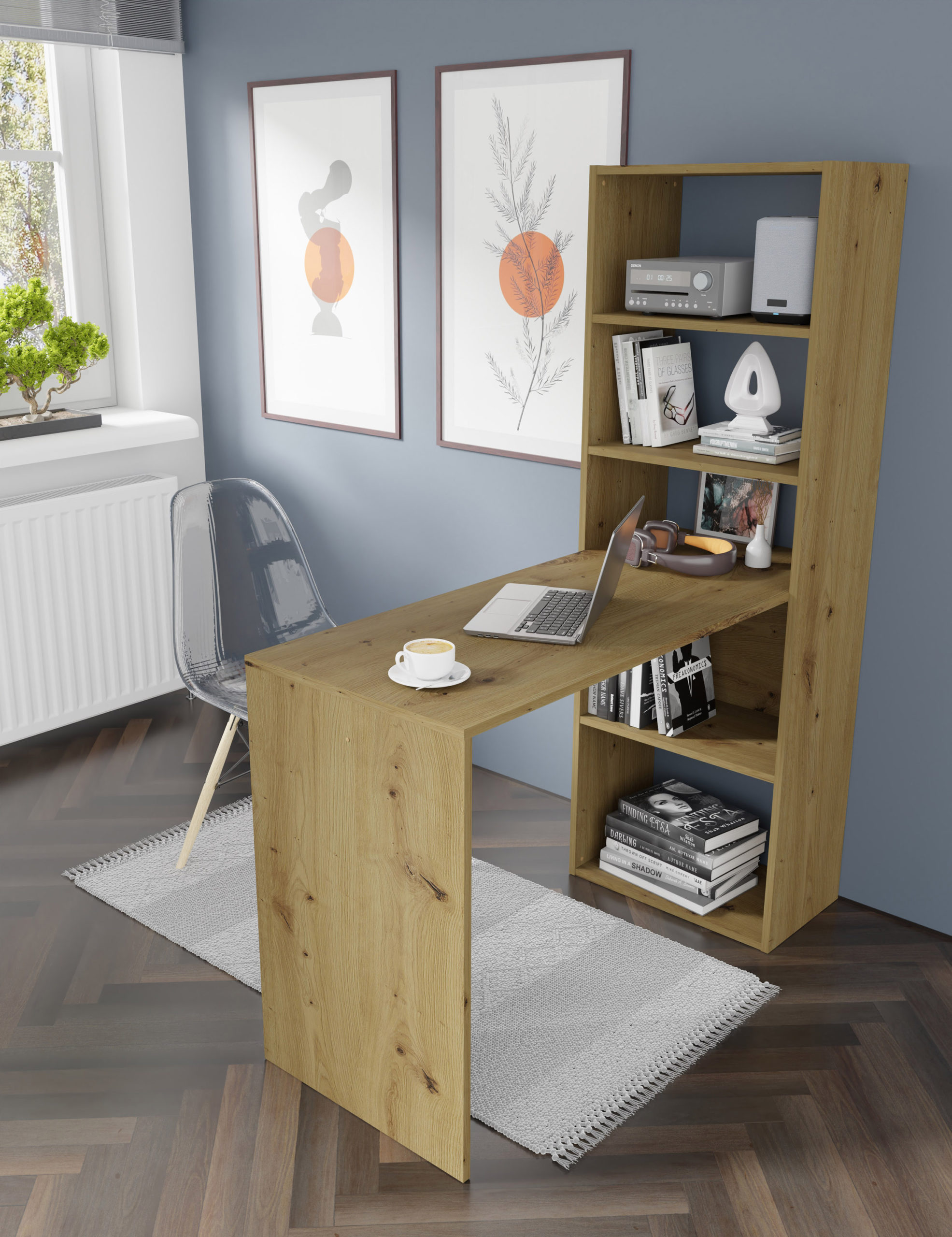 Biurko HARMONY w ciepłym odcieniu dębu artisan to idealne połączenie funkcjonalności regału i wygody klasycznego biurka. Zaprojektowane z myślą o miłośnikach naturalnego stylu, oferuje przestronny blat oraz cztery zintegrowane półki, które pomieszczą wszystkie Twoje segregatory i akcesoria. To polskiej produkcji mebel, który wprowadza do domowego biura ład i harmonię, nie zajmując przy tym wiele miejsca. Dzięki prostej konstrukcji i czytelnej instrukcji, Twoje nowe centrum dowodzenia będzie gotowe do pracy w kilka chwil. Postaw na ergonomię w przytulnym wydaniu.