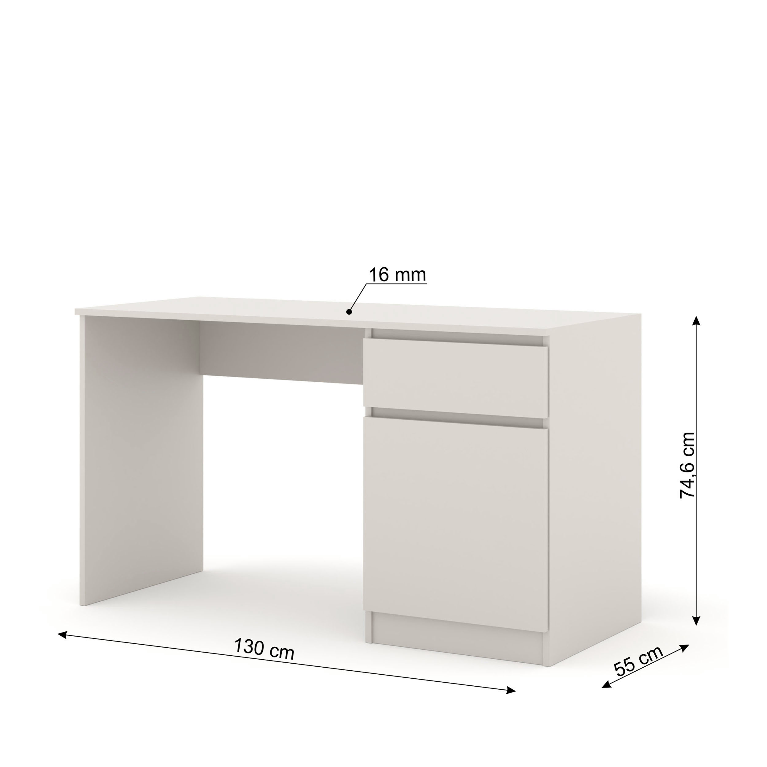 Biurko MAJA w subtelnym odcieniu kaszmiru to połączenie luksusowego designu z bezkompromisową wygodą pracy. Królewski blat o szerokości 130 cm oferuje przestrzeń, która swobodnie pomieści kompletny zestaw komputerowy i dokumenty, podczas gdy bezuchwytowe fronty szafki i szuflady podkreślają nowoczesny minimalizm mebla. Wykonane z trwałej płyty laminowanej, zapewnia stabilność i odporność na codzienne użytkowanie. To idealny wybór dla osób, które chcą stworzyć eleganckie i uporządkowane stanowisko pracy w domowym zaciszu. Odkryj nowy wymiar profesjonalizmu.