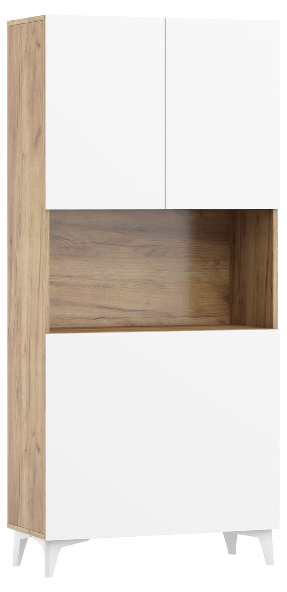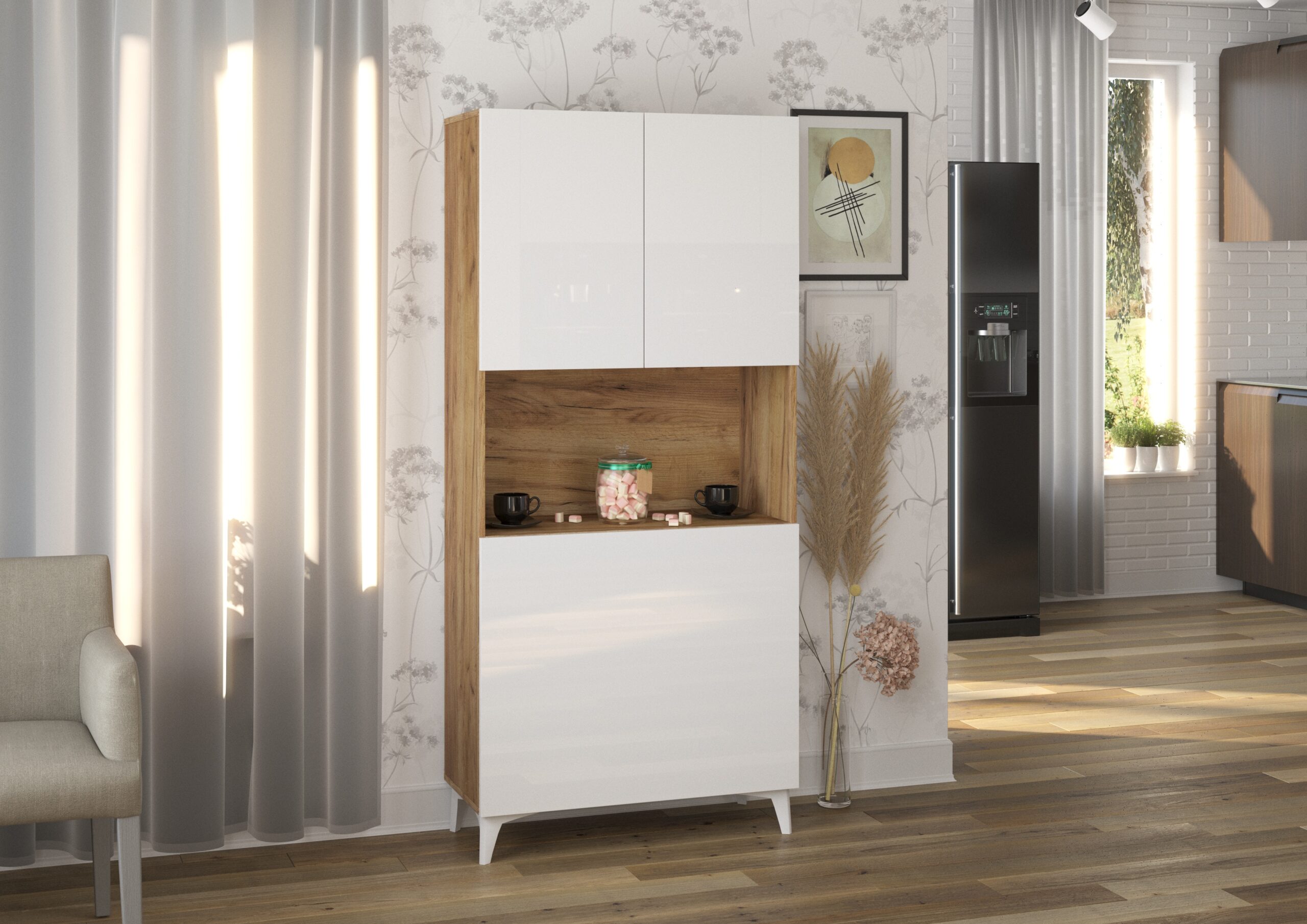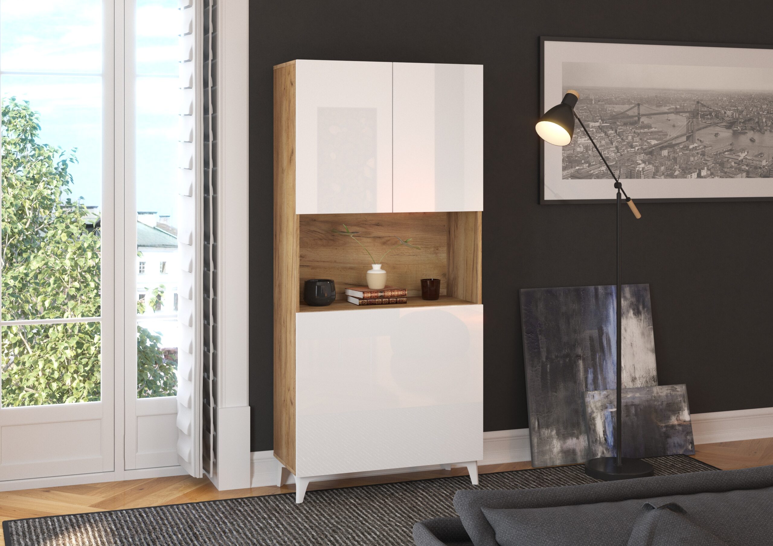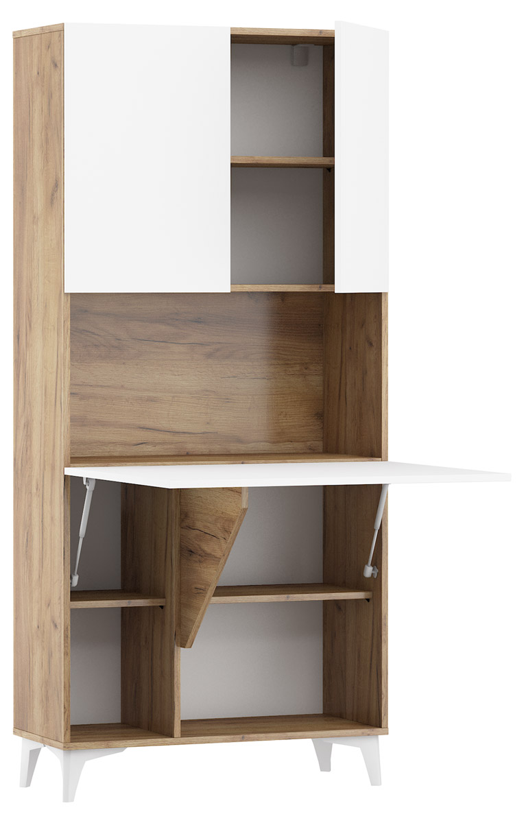 Biurko z kolekcji MEGAN to odpowiedź na wyzwania nowoczesnego stylu życia, w którym przestrzeń mieszkalna często musi pełnić wiele funkcji jednocześnie. Dzięki innowacyjnej, rozkładanej konstrukcji, w kilka sekund przekształcisz stylowy regał w wygodne stanowisko do pracy lub nauki. To mebel, który rozumie Twoje potrzeby – po skończonych obowiązkach możesz po prostu złożyć blat, przywracając pomieszczeniu ład i zyskując cenne miejsce do odpoczynku. Elegancja białych frontów w połysku połączona z ciepłym odcieniem złotego rzemieślniczego dębu sprawia, że biurko staje się centralnym punktem dekoracyjnym salonu czy sypialni.