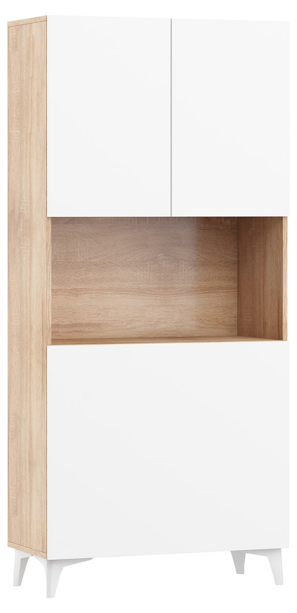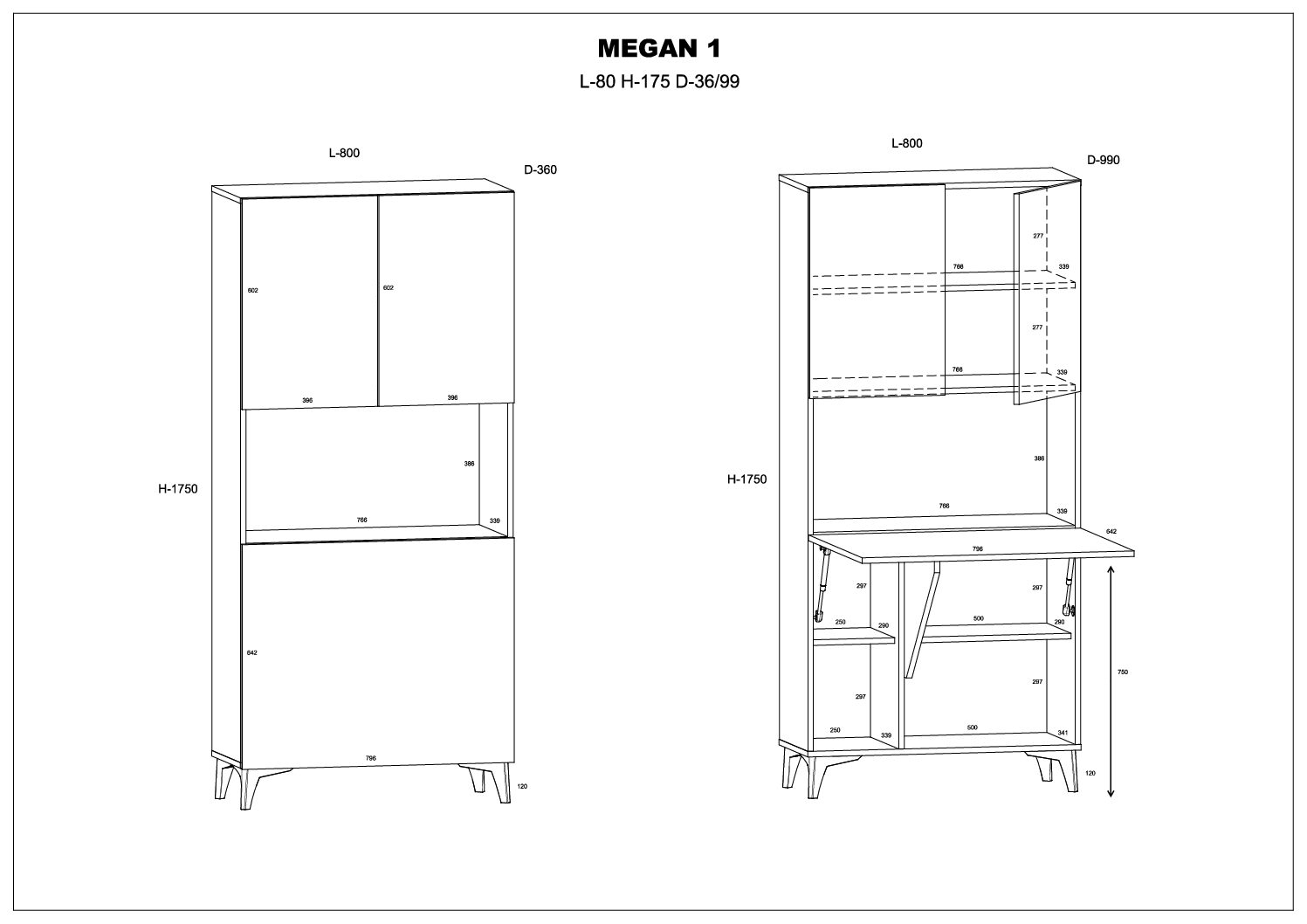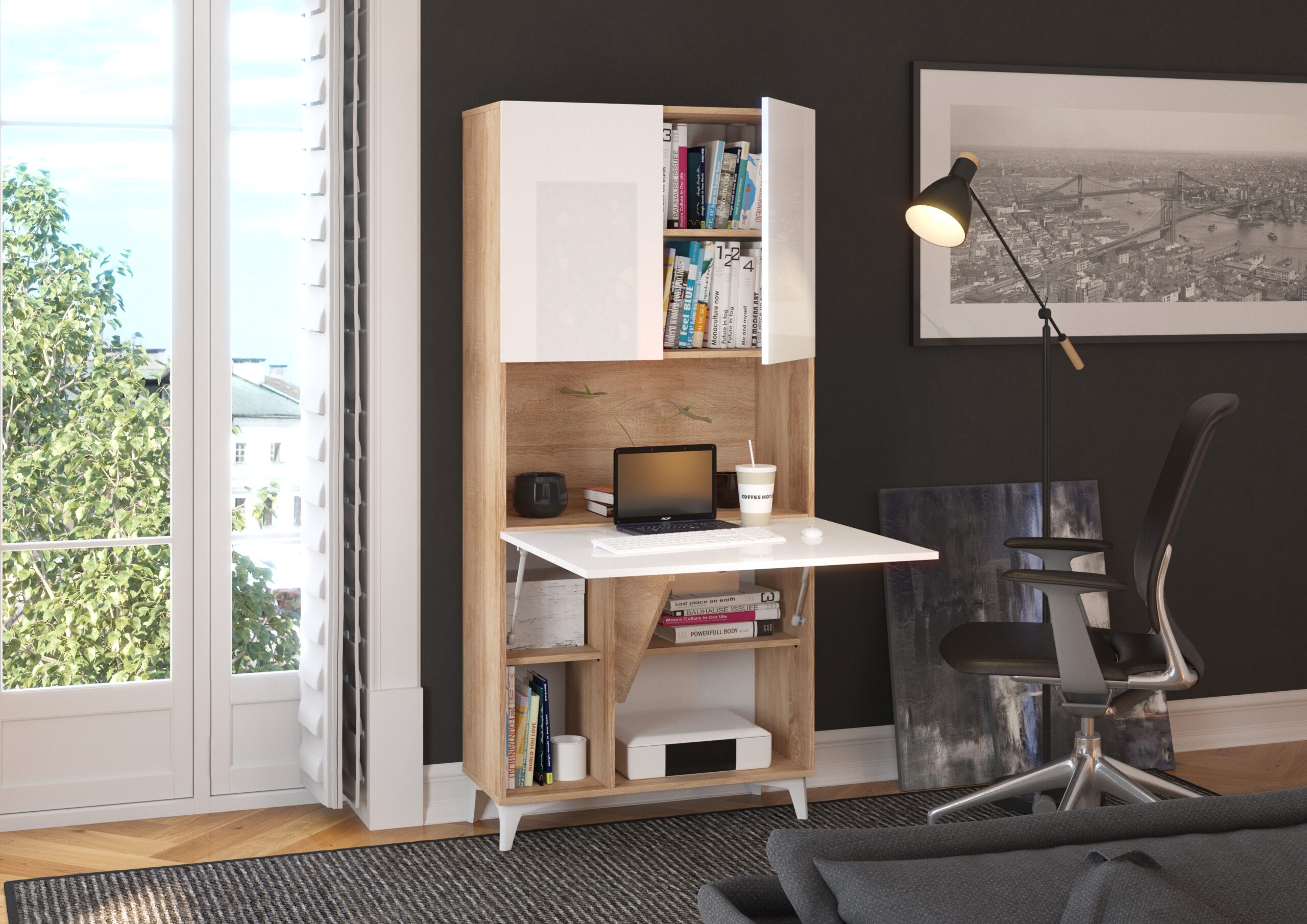 Funkcjonalność biurka MEGAN opiera się na sprytnym wykorzystaniu pionowej przestrzeni. Górna część to zamykana szafka z półką – idealne miejsce na bezpieczne przechowywanie dokumentacji lub sprzętu elektronicznego. Centralnym punktem jest solidny, rozkładany blat roboczy o wymiarach blisko 80×64 cm, który po rozłożeniu tworzy komfortowe miejsce do pracy z laptopem. Co więcej, dolna sekcja skrywa aż cztery dodatkowe półki. Dzięki temu wszystkie przybory biurowe, książki czy akcesoria są zawsze pod ręką podczas pracy, a po jej zakończeniu zostają estetycznie ukryte za podniesionym blatem, przywracając w pokoju ład i wizualny porządek.