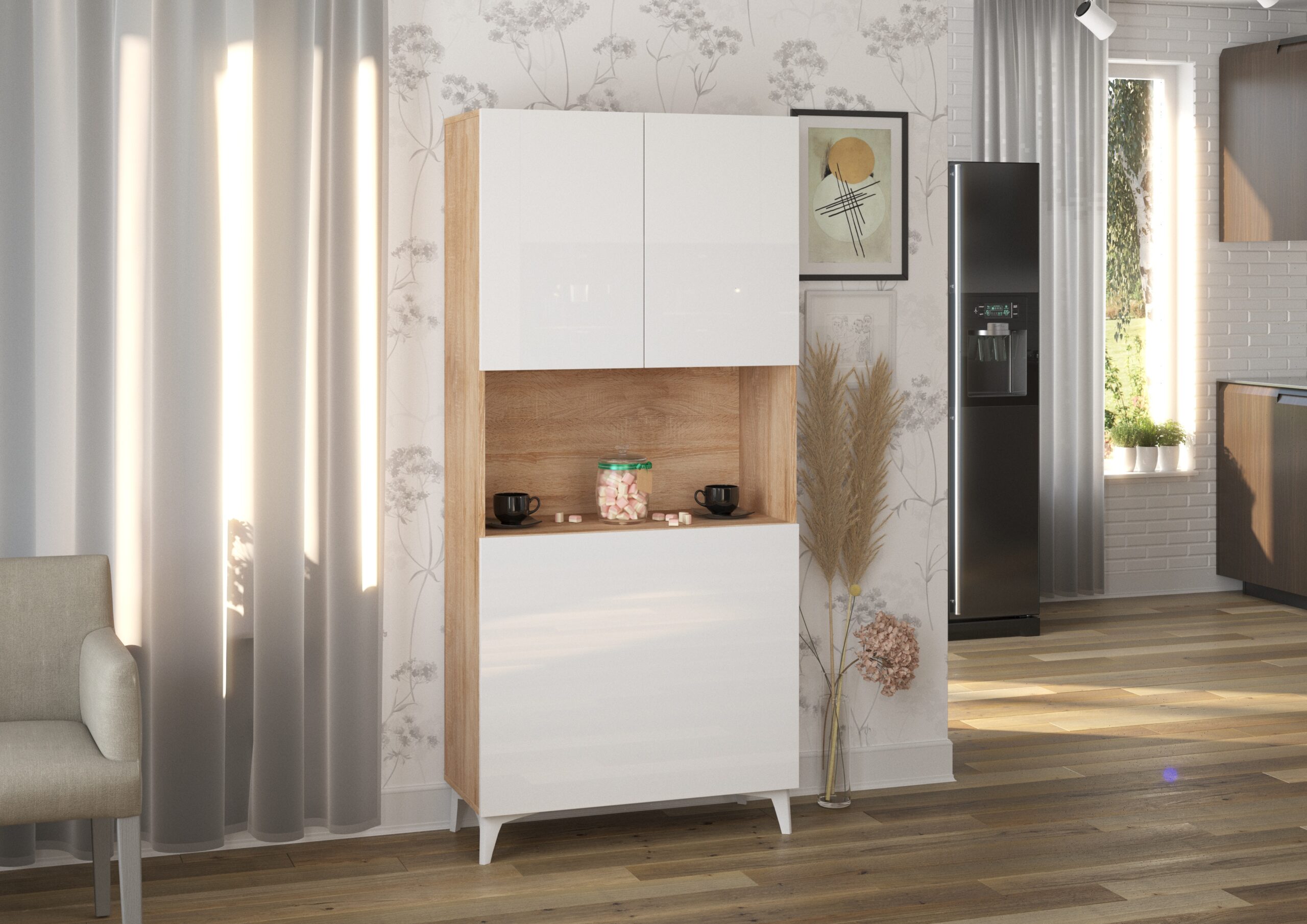 Biurko rozkładane z regałem MEGAN w kolorystyce Dąb Sonoma / Biały Połysk to propozycja dla tych, którzy nie chcą wybierać między przytulnością a nowoczesnym blaskiem. Ten innowacyjny mebel został zaprojektowany z myślą o dynamicznym stylu życia, w którym salon czy sypialnia często muszą pełnić rolę domowego biura. Wykorzystanie dekoru Dąb Sonoma nadaje konstrukcji naturalnego charakteru, natomiast fronty w wysokim połysku rozświetlają pomieszczenie i wpisują się w najnowsze trendy wnętrzarskie, tworząc mebel, który zachwyca formą zarówno po rozłożeniu, jak i złożeniu.