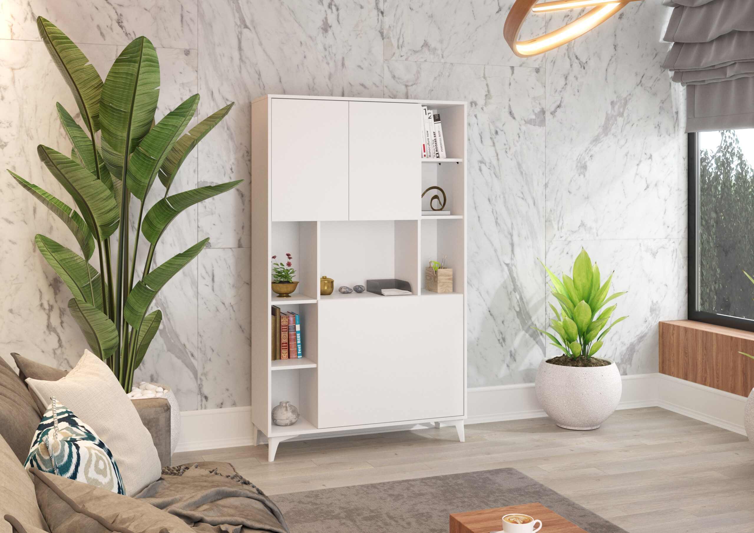Dzięki inteligentnej konstrukcji MEGAN 2 zyskujesz dwa meble w cenie jednego: pojemny regał oraz ergonomiczne biurko. Rozkładany blat został zaprojektowany tak, by zapewnić Ci optymalną przestrzeń do pracy z laptopem i dokumentami, spełniając surowe wymogi nowoczesnego home office. Wszystko, co mogłoby rozpraszać Twoją uwagę, znajdzie swoje miejsce w zamykanej szafce górnej lub na czterech dolnych półkach, które po złożeniu blatu pozostają całkowicie niewidoczne. Taka organizacja sprawia, że po skończonej pracy Twoje biuro „znika”, pozwalając Ci na pełny relaks w estetycznie uporządkowanym otoczeniu.