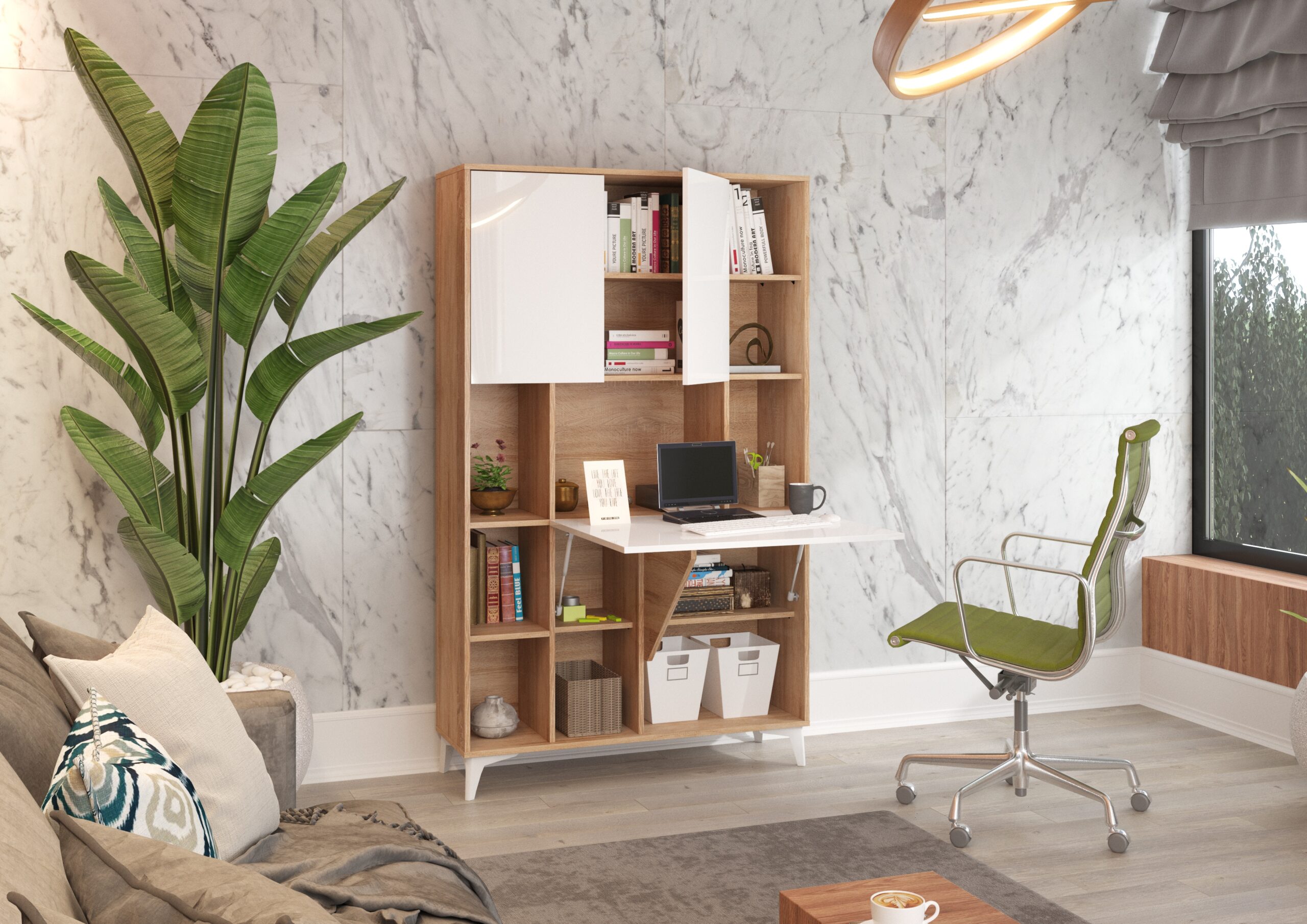 Biurko rozkładane regał MEGAN 2 dąb sonoma / biały połysk