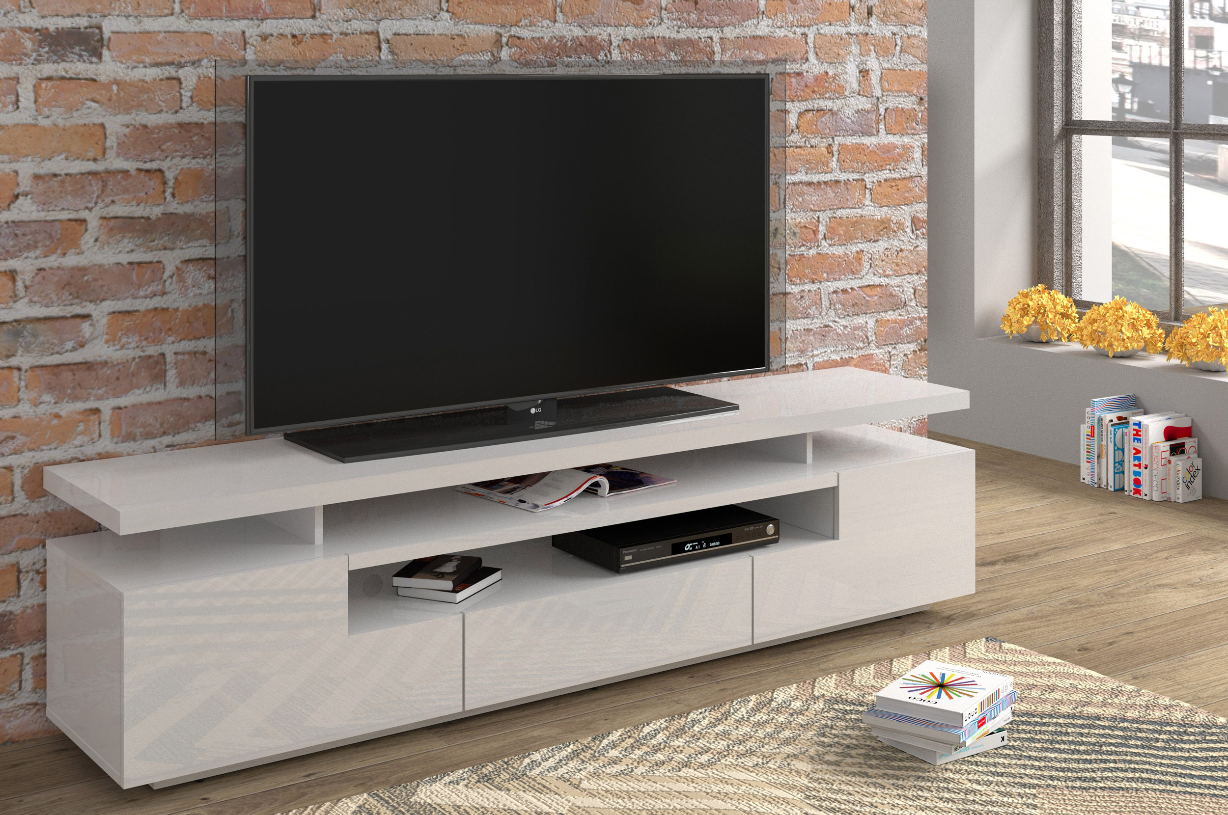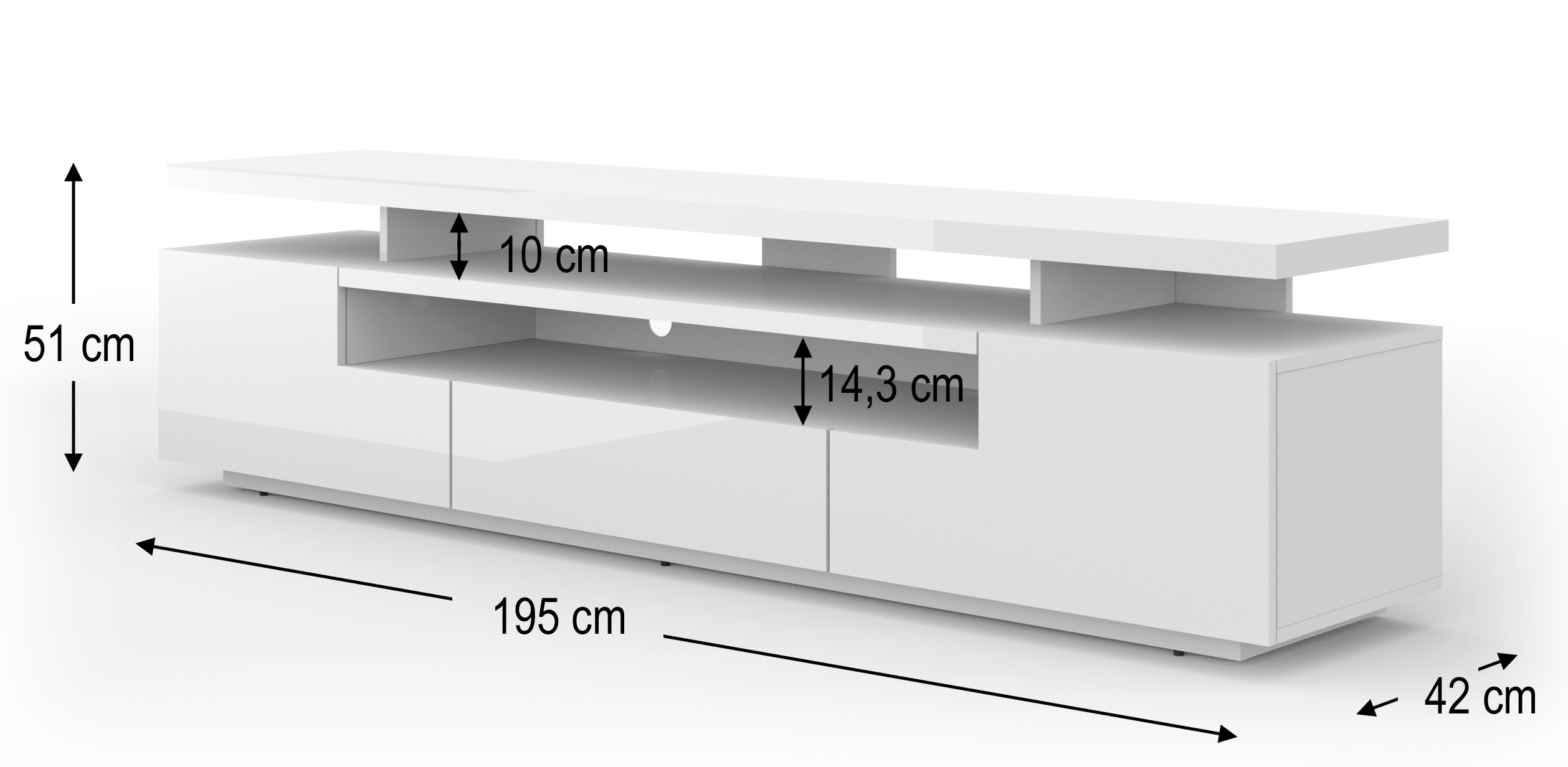 Szafka RTV EVA w wersji 195 cm to propozycja dla posiadaczy przestronnych salonów, w których liczy się rozmach i estetyczna spójność. Śnieżnobiała kolorystyka w połączeniu z frontami w wysokim połysku sprawia, że mebel działa jak zwierciadło – odbija światło i optycznie powiększa pomieszczenie, nadając mu luksusowego sznytu. To projekt, który mimo swoich gabarytów, zachowuje wizualną świeżość, stając się świetlistym fundamentem dla nowoczesnego zestawu multimedialnego.