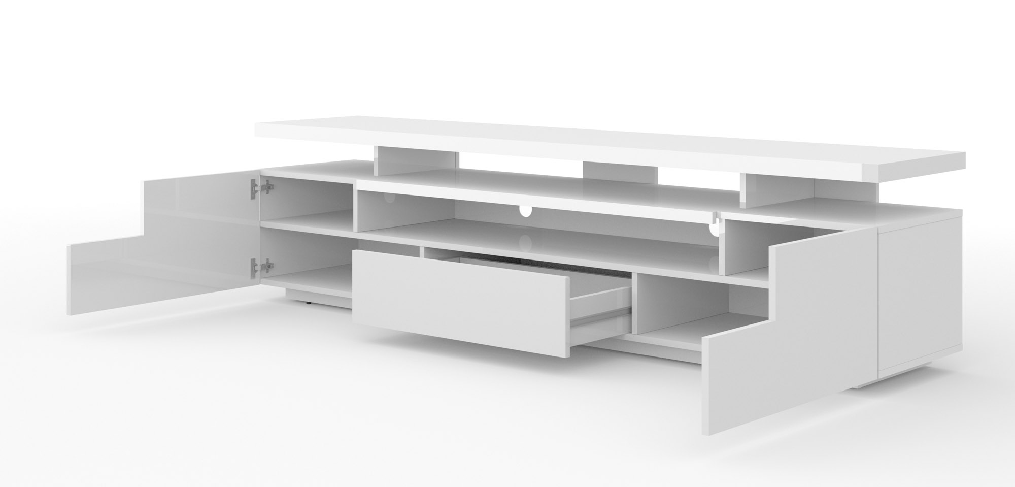 Wybierając model EVA 195 cm, inwestujesz w mebel, który dominuje nad wnętrzem w sposób elegancki i przemyślany. Jej horyzontalna, szeroka linia pozwala na stworzenie reprezentacyjnej ściany multimedialnej, która po zmroku – dzięki magii świateł LED – zmienia się w nastrojową strefę relaksu. To idealny wybór do wnętrz w stylu minimalistycznym, nowoczesnym i glamour, gdzie biały połysk i funkcjonalność idą w parze z luksusem.
