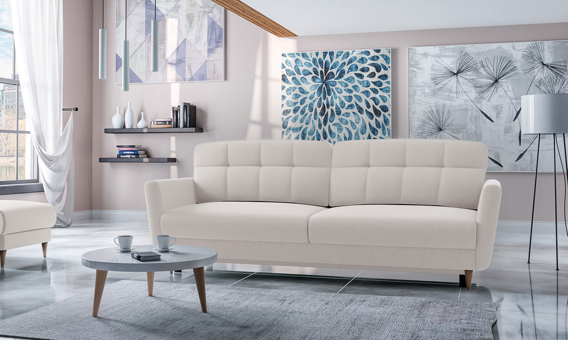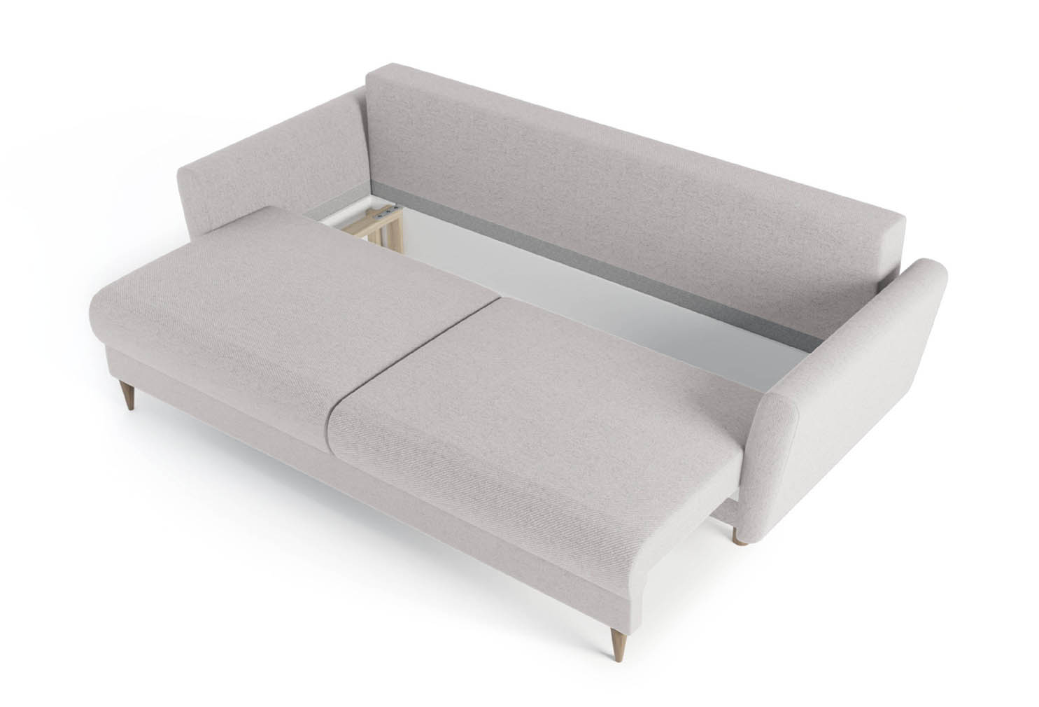 Funkcjonalność kanapy Kristi idzie w parze z jej doskonałym wyglądem. System rozkładania pozwala na błyskawiczne przekształcenie sofy w pełnowymiarowe, dwuosobowe łóżko. Duża powierzchnia spania zapewnia wygodę porównywalną z tradycyjnym materacem, co czyni ją idealnym rozwiązaniem do mniejszych mieszkań lub pokoi gościnnych. Pod siedziskiem ukryty jest praktyczny schowek, w którym z łatwością przechowasz komplet pościeli, koce czy dodatkowe poduszki, dzięki czemu Twoja przestrzeń zawsze będzie wyglądać schludnie i estetycznie.