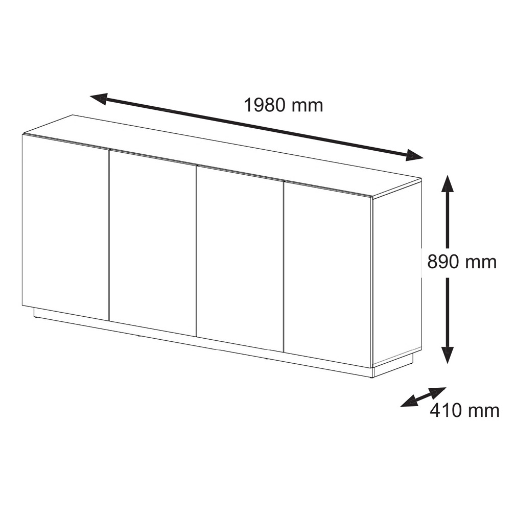 Funkcjonalność modelu Aura 198 cm zadowoli nawet najbardziej wymagających użytkowników. Wnętrze zostało podzielone na cztery niezależne sekcje, skrywające łącznie osiem pojemnych półek. Taki układ pozwala na precyzyjne rozlokowanie przedmiotów o różnych przeznaczeniach – od domowych tekstyliów i ubrań w sypialni, po kompletną zastawę stołową i dokumenty w pokoju dziennym. Głębokość 41 cm sprawia, że komoda jest ustawna i nie zajmuje nadmiernie miejsca w przejściach, oferując jednocześnie optymalną przestrzeń do przechowywania.