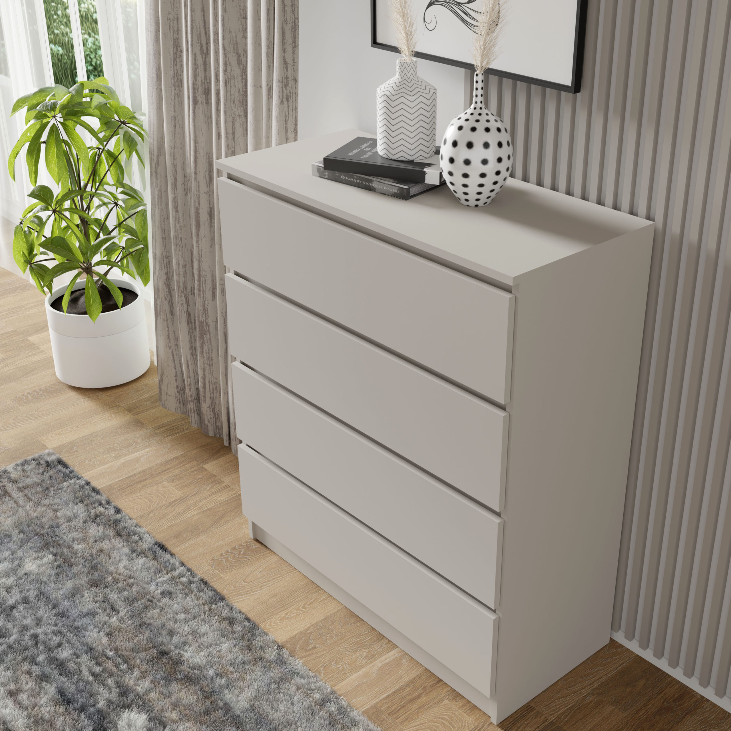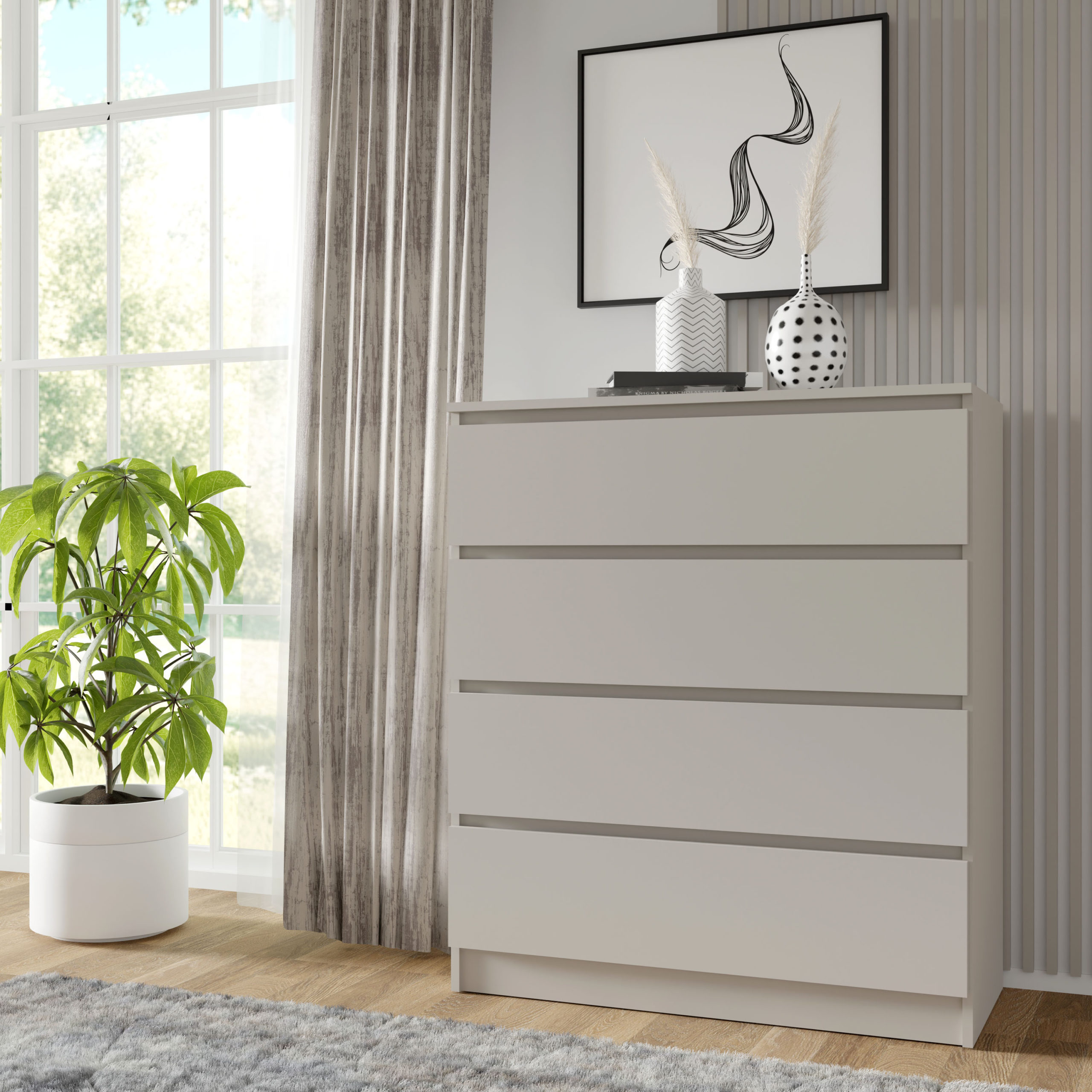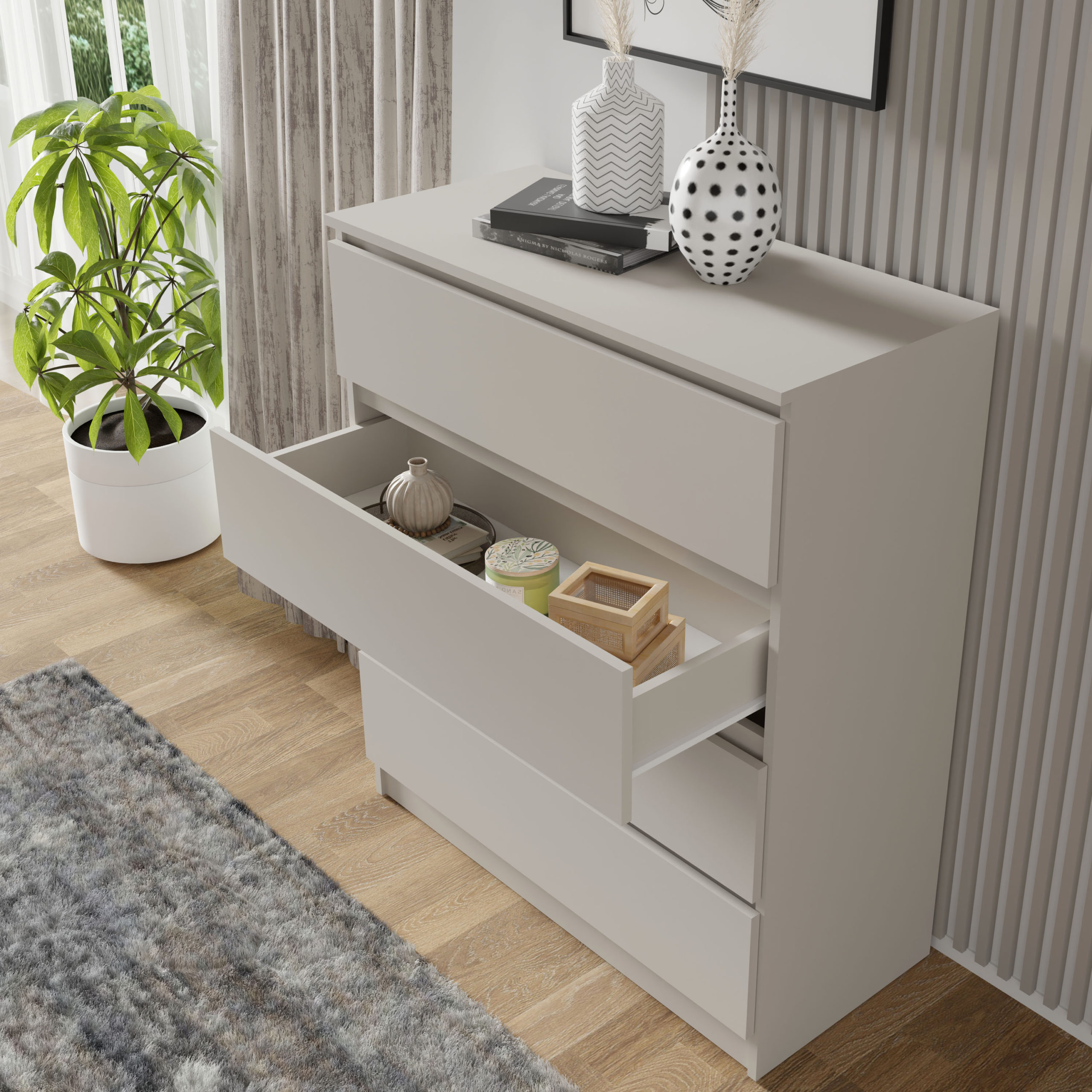 Użytkowy wymiar komody opiera się na czterech niezależnych sekcjach do przechowywania. Szuflady o głębokości 40 cm zostały zaprojektowane tak, by pomieścić zarówno cięższą garderobę, jak i drobne akcesoria, zapewniając do nich łatwy dostęp bez konieczności głębokiego sięgania do szaf. Brak zewnętrznych okuć i uchwytów to nie tylko wyraz estetycznego minimalizmu, ale także ułatwienie w codziennym dbaniu o czystość frontów. Mechanizm otwierania został zintegrowany z krawędzią płyty, co pozwala zachować nienaganną, geometryczną linię mebla.