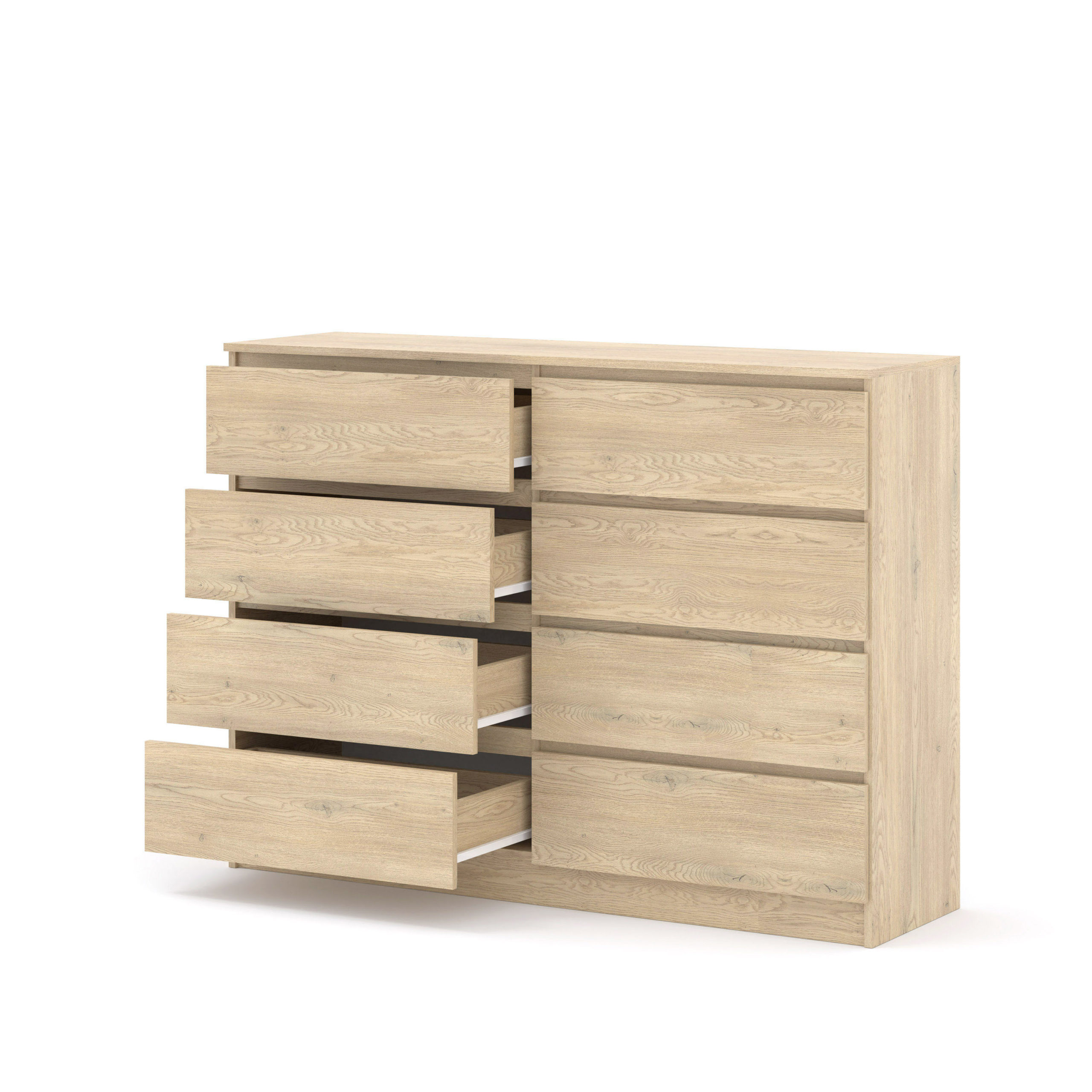 Kiedy priorytetem staje się znalezienie miejsca na każdą, nawet najmniejszą rzecz, komoda Maja w swoim największym wariancie (140 cm) staje się niezastąpionym sprzymierzeńcem. Projektanci odeszli tu od tradycyjnych rozwiązań na rzecz maksymalnej ergonomii – zamiast szafek otrzymujesz osiem głębokich, płynnie działających szuflad. Taki układ radykalnie zmienia sposób segregacji: osobne miejsce na dokumenty, tekstylia, bieliznę czy akcesoria biurowe sprawia, że utrzymanie porządku staje się niemal intuicyjne.