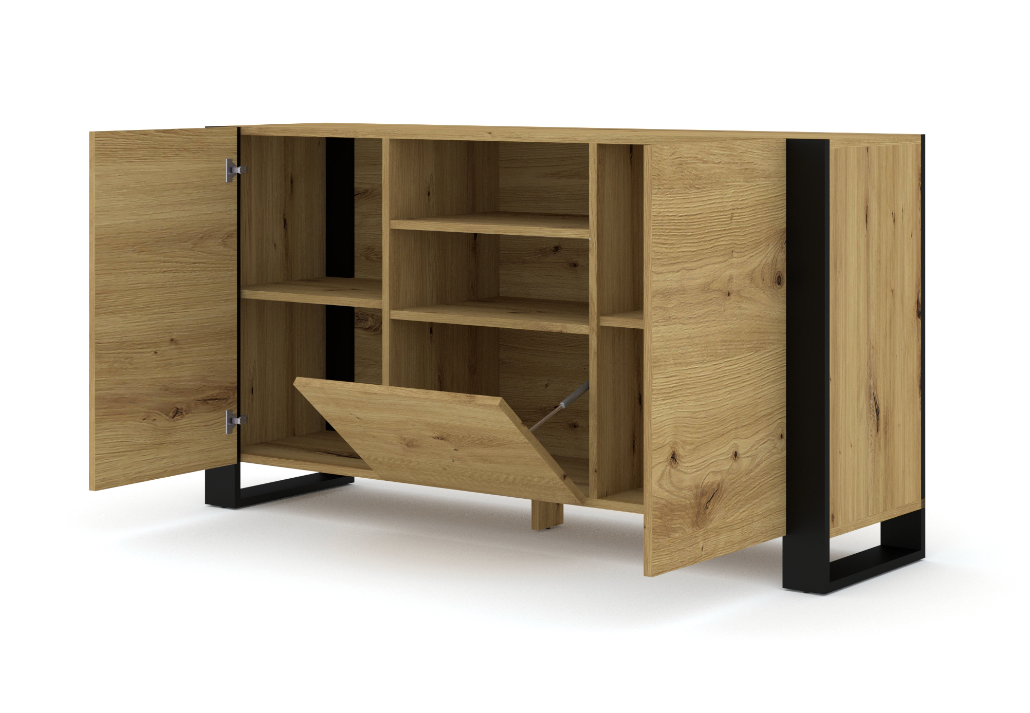 Komoda Mondi to wyrazista propozycja dla osób, które szukają złotego środka między surowym stylem industrialnym a ciepłem naturalnych odcieni drewna. Szeroka na 158 cm bryła w kolorze dąb artisan została osadzona na mocnych, czarnych nogach-ramach, co nadaje jej nowoczesnej lekkości i stabilności. Dzięki przemyślanemu podziałowi na trzy zamykane szafki oraz dwie otwarte wnęki, mebel ten staje się uniwersalnym organizerem do salonu lub sypialni. To solidny i estetyczny element wyposażenia, który porządkuje przestrzeń, jednocześnie pełniąc rolę stylowej dekoracji wnętrza.