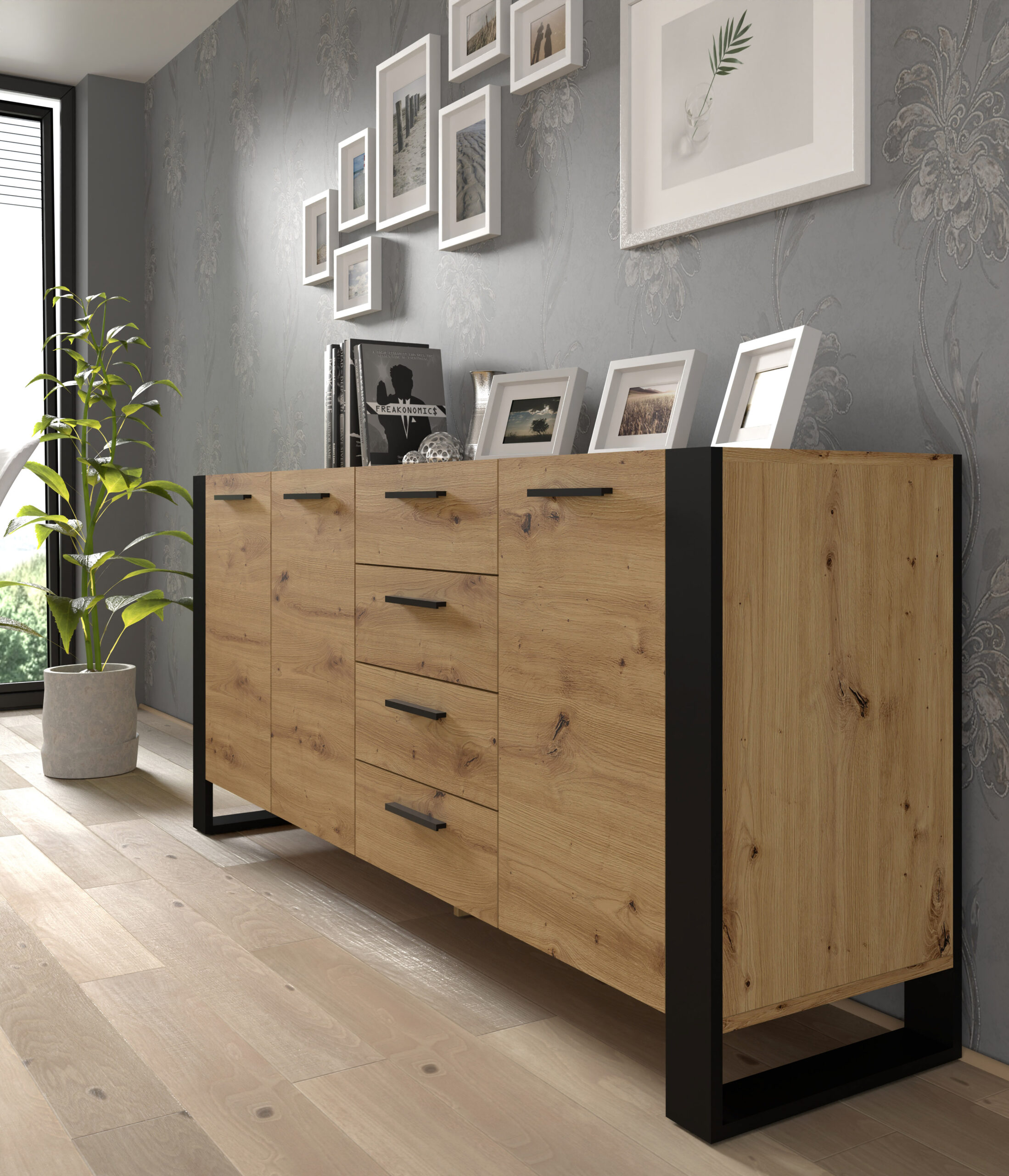 Odkryj potęgę organizacji w najlepszym wydaniu z szeroką komodą Nuka K. Ten monumentalny mebel o długości niemal 200 cm to prawdziwe centrum przechowywania, które łączy ciepło dębu artisan z loftową surowością czarnych ram. Wyposażona w aż cztery pojemne szuflady oraz dwie obszerne szafki z półkami, komoda ta pozwoli Ci bez trudu zapanować nad domowym chaosem. Nowoczesny design, podkreślony przez charakterystyczne nogi z centralnym wsparciem, gwarantuje, że zyskujesz nie tylko stylowy element dekoracyjny, ale i solidny mebel na lata. Wprowadź ład i profesjonalny design do swojego salonu.