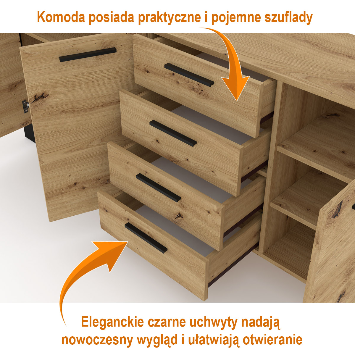 Sercem tej komody jest jej niezwykła funkcjonalność, zaprojektowana z myślą o osobach, które kochają mieć wszystko pod kontrolą. Zamiast szukać miejsca na drobiazgi, masz do dyspozycji aż cztery głębokie szuflady. To idealna przestrzeń na dokumenty, akcesoria czy tekstylia, które od teraz będą miały swoje stałe, łatwo dostępne miejsce. Płynność ich otwierania, zapewniona przez solidne prowadnice i ergonomiczne czarne uchwyty, sprawia, że codzienne korzystanie z mebla staje się małym, przyjemnym rytuałem. Obok szuflad znajdziesz dwie pojemne szafki, które z łatwością ukryją większe przedmioty, pozwalając Ci cieszyć się nienaganną czystością w pomieszczeniu.
