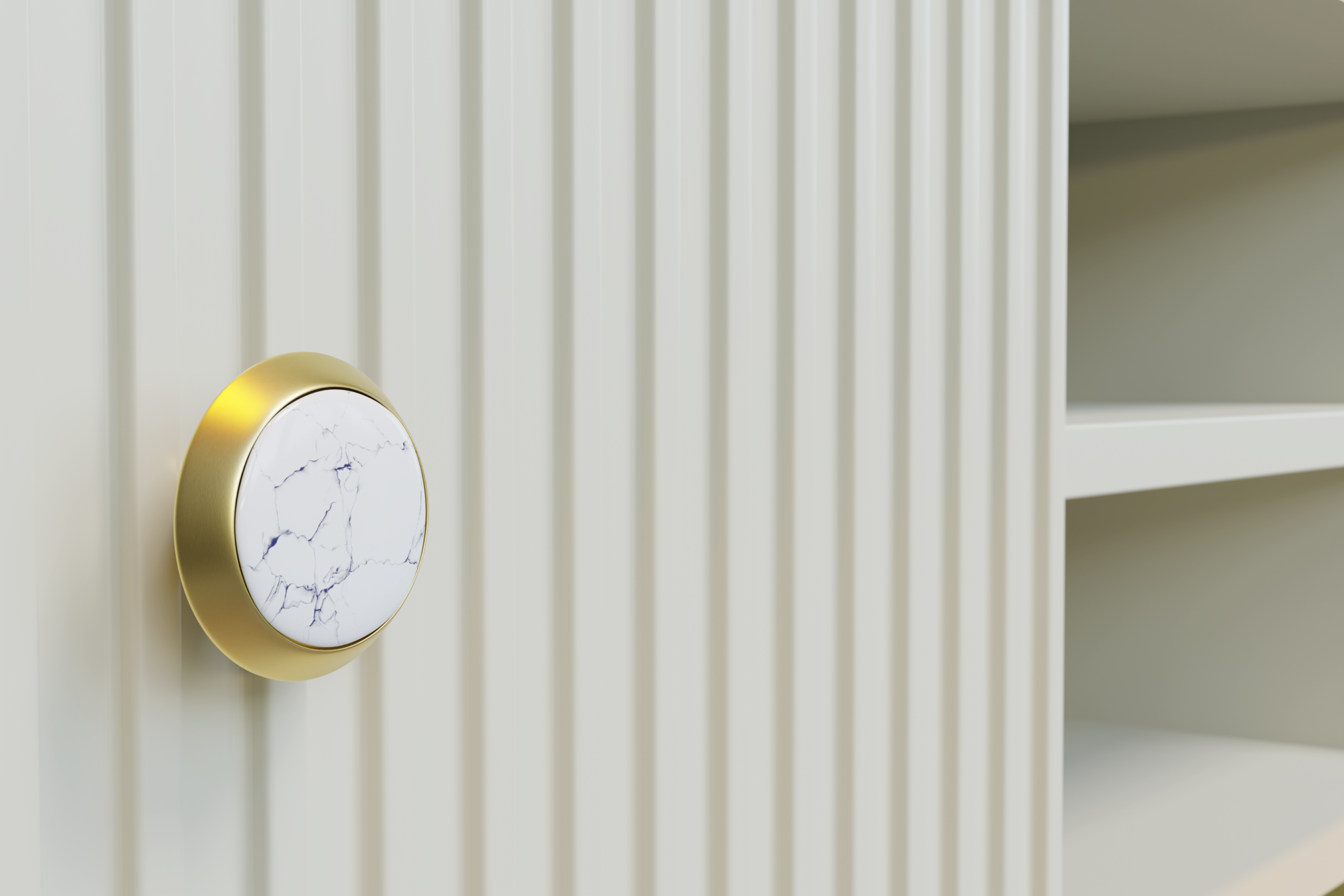 To, co wyróżnia komodę Petra na tle klasycznych rozwiązań, to jej trójwymiarowa, rzeźbiarska forma. Fronty oraz boki mebla, wykonane z wysokogatunkowej płyty MDF, zostały pokryte precyzyjnymi, pionowymi żłobieniami. Dzięki temu zabiegowi mebel zyskuje niesamowitą dynamikę – pionowe linie optycznie wysmuklają bryłę i sprawiają, że matowa powierzchnia kaszmiru przepięknie gra ze światłem wpadającym do pomieszczenia. Ciągłość frezowania na bokach sprawia, że komoda prezentuje się nienagannie pod każdym kątem, co czyni ją idealnym meblem wolnostojącym w reprezentacyjnych częściach domu.