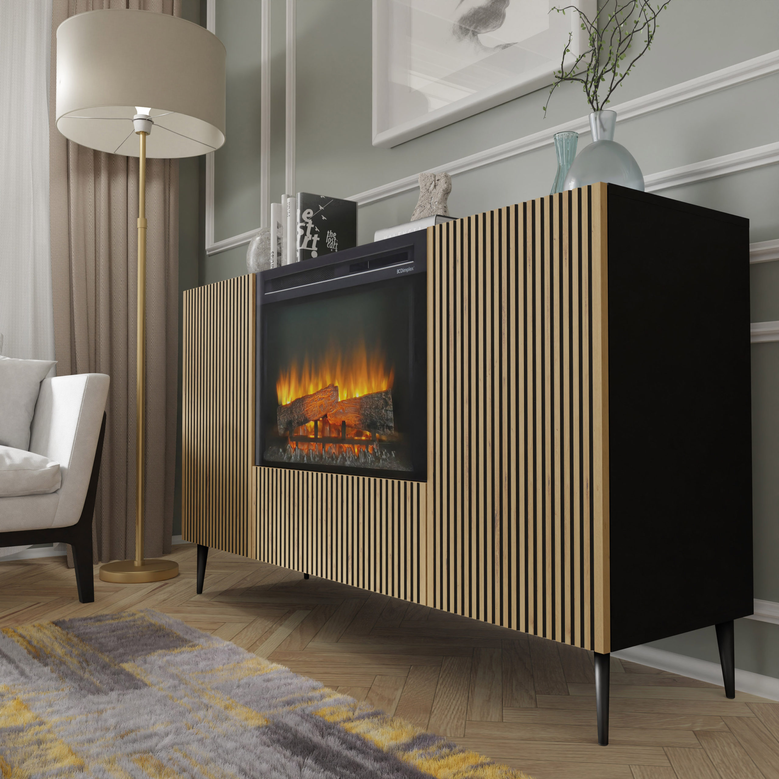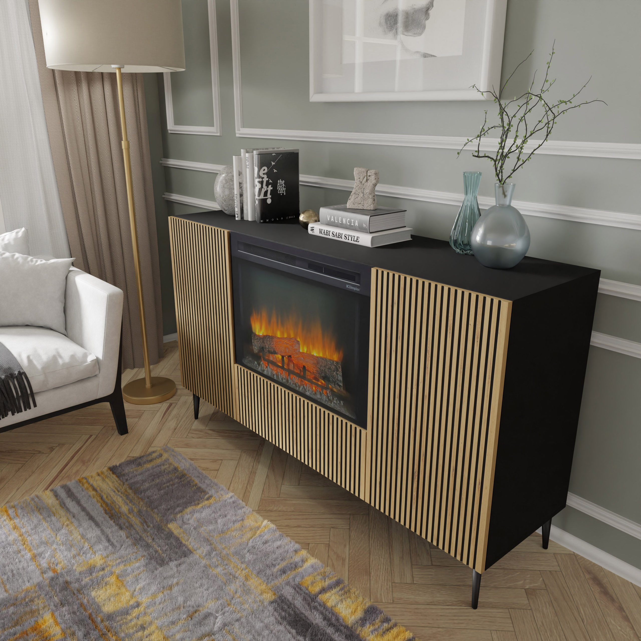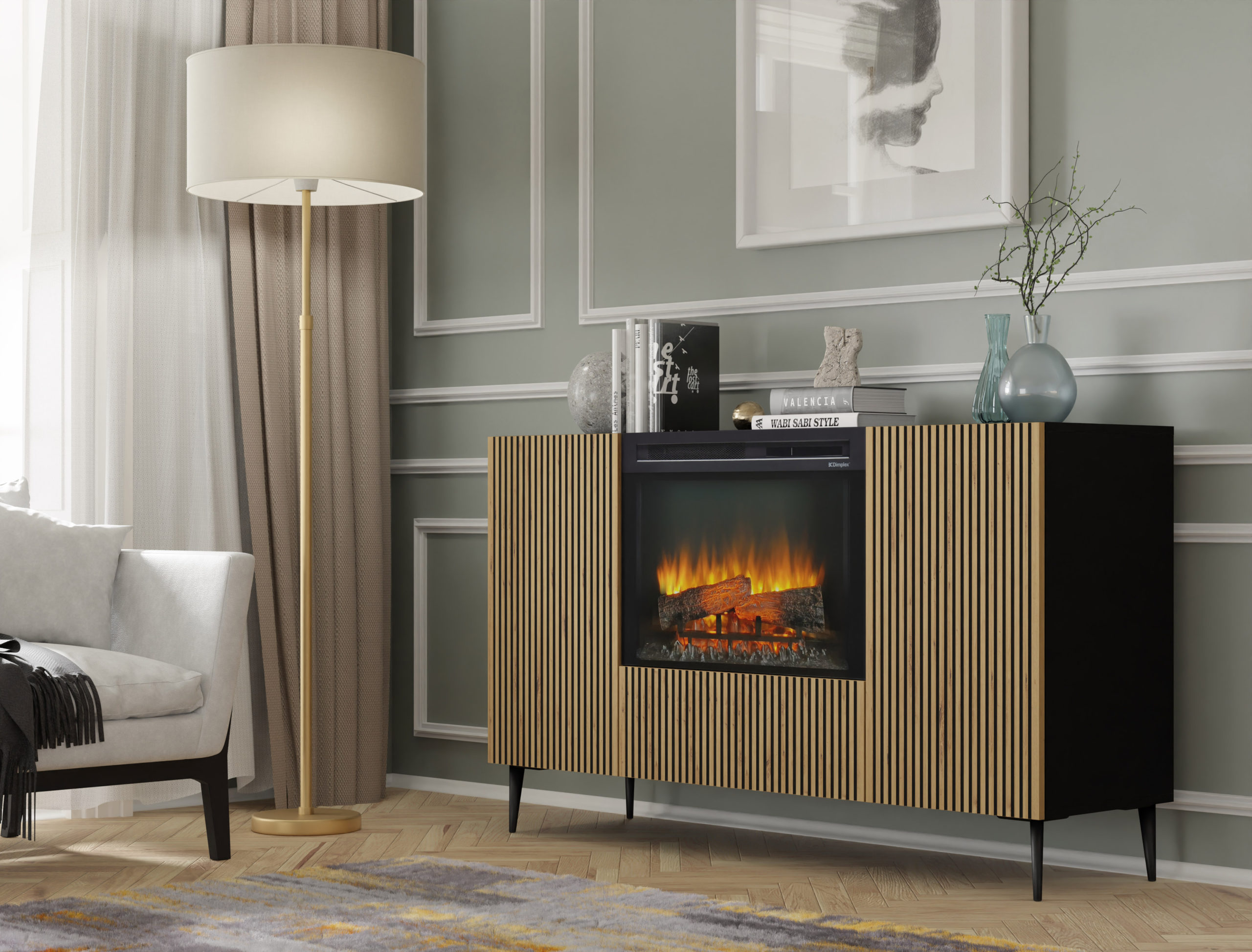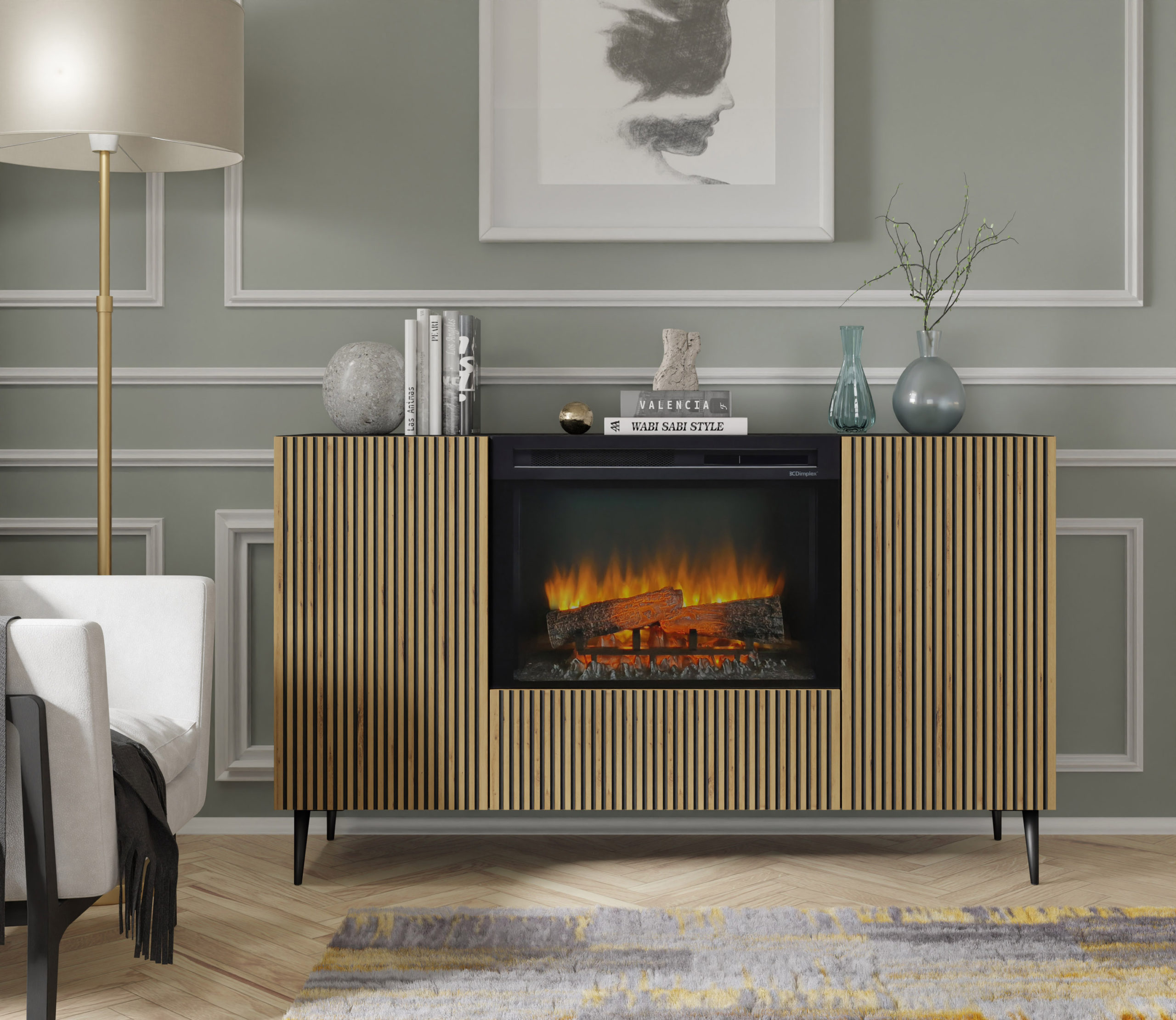 Komoda Ravenna z kominkiem elektrycznym to rewolucyjne połączenie stylowego mebla do przechowywania z nastrojową magią domowego ogniska. Ta unikatowa bryła o szerokości 147 cm zachwyca frontami w kolorze dębu artisan, ozdobionymi precyzyjnym, czarnym frezowaniem, które nadaje całości rzeźbiarskiego wyrazu. Centralnym punktem mebla jest nowoczesny wkład kominkowy z bezramową szybą, oferujący realistyczny widok płonących polan LED w różnych kolorach (pomarańczowym, niebieskim lub czerwonym). Osadzona na smukłych metalowych nóżkach i wyposażona w system push to open, komoda Ravenna z funkcją grzania to idealne rozwiązanie dla osób pragnących luksusowego relaksu i nowoczesnego designu bez konieczności posiadania tradycyjnego komina.