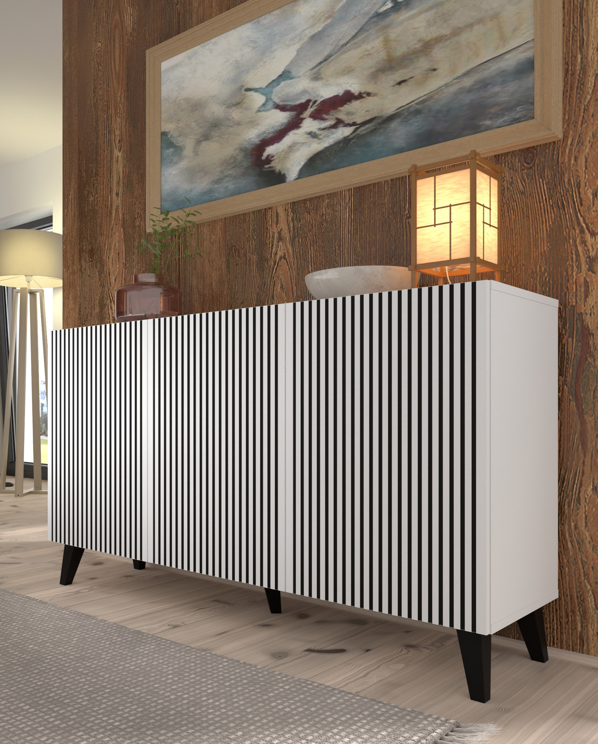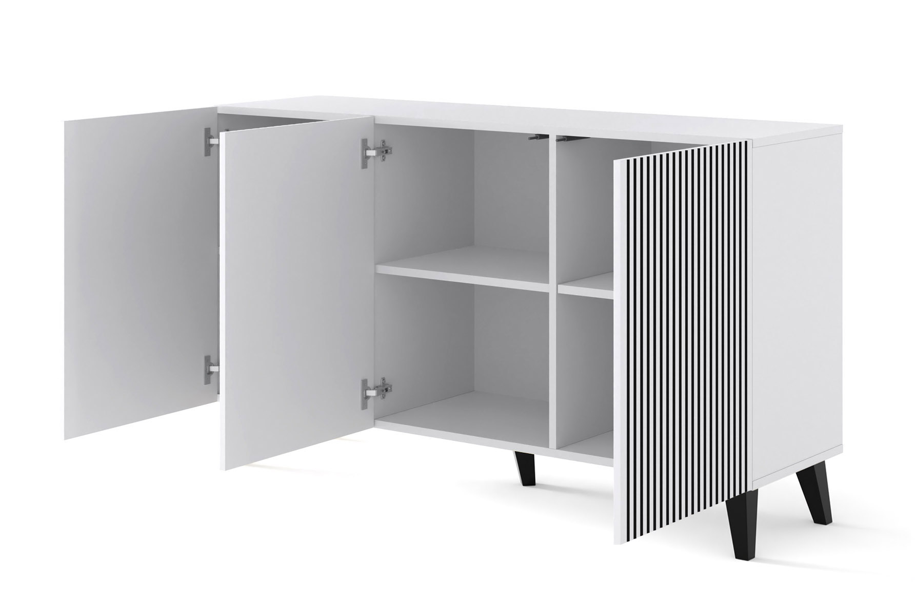 Komoda Ravenna to esencja współczesnego designu, która wprowadza do wnętrza ład, światło i odważny, geometryczny akcent. Biały mat korpusu stanowi idealne tło dla kunsztownie frezowanych frontów, których czarne linie tworzą unikatowy, graficzny wzór. Ta trzydrzwiowa bryła o szerokości 150 cm oferuje przestronne wnętrze z systemem półek, zapewniając mnóstwo miejsca na dokumenty, odzież czy akcesoria domowe. Osadzona na smukłych czarnych nóżkach i wyposażona w mechanizm push to open, komoda Ravenna łączy w sobie biżuteryjną dekoracyjność z najwyższym komfortem użytkowania.