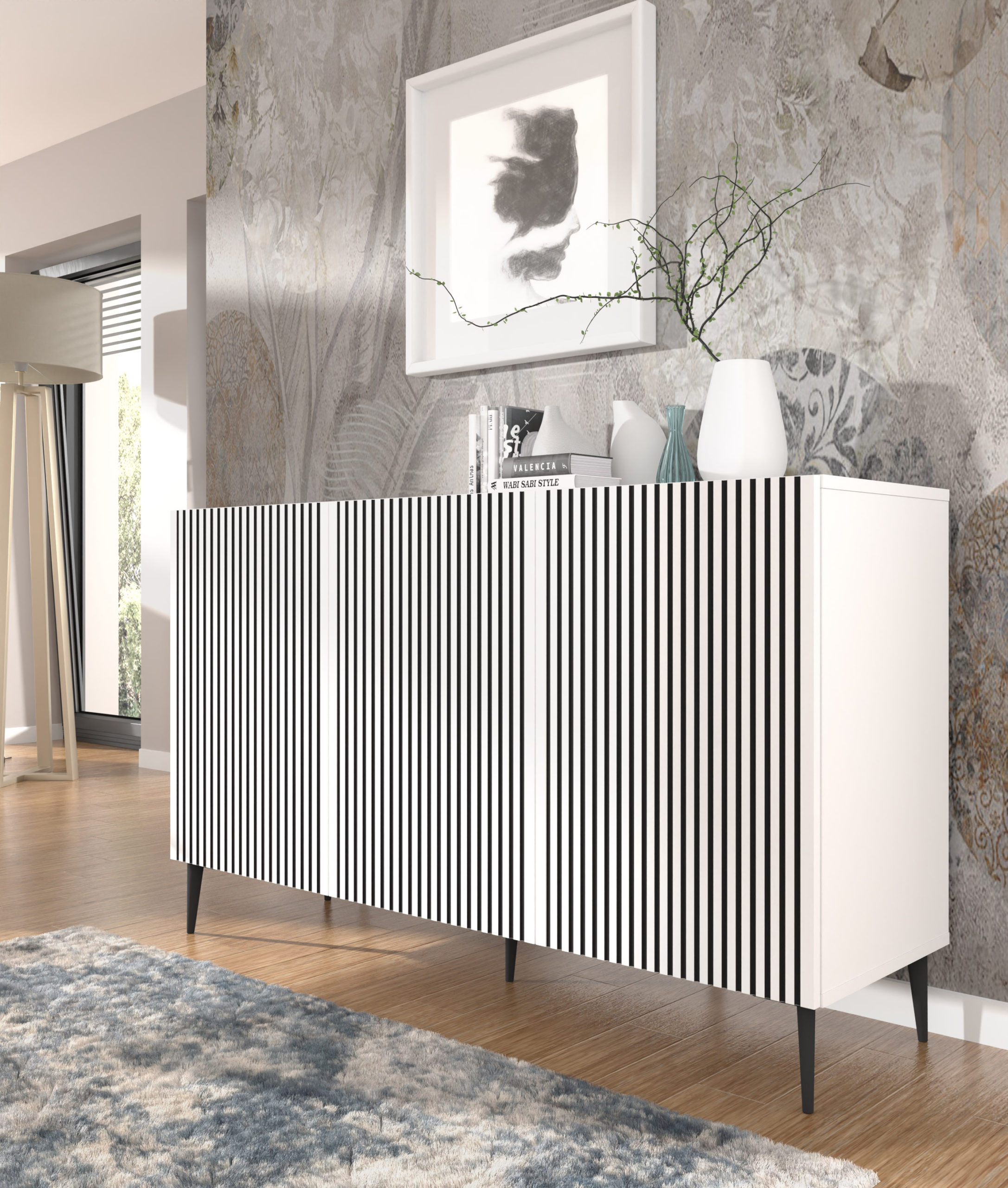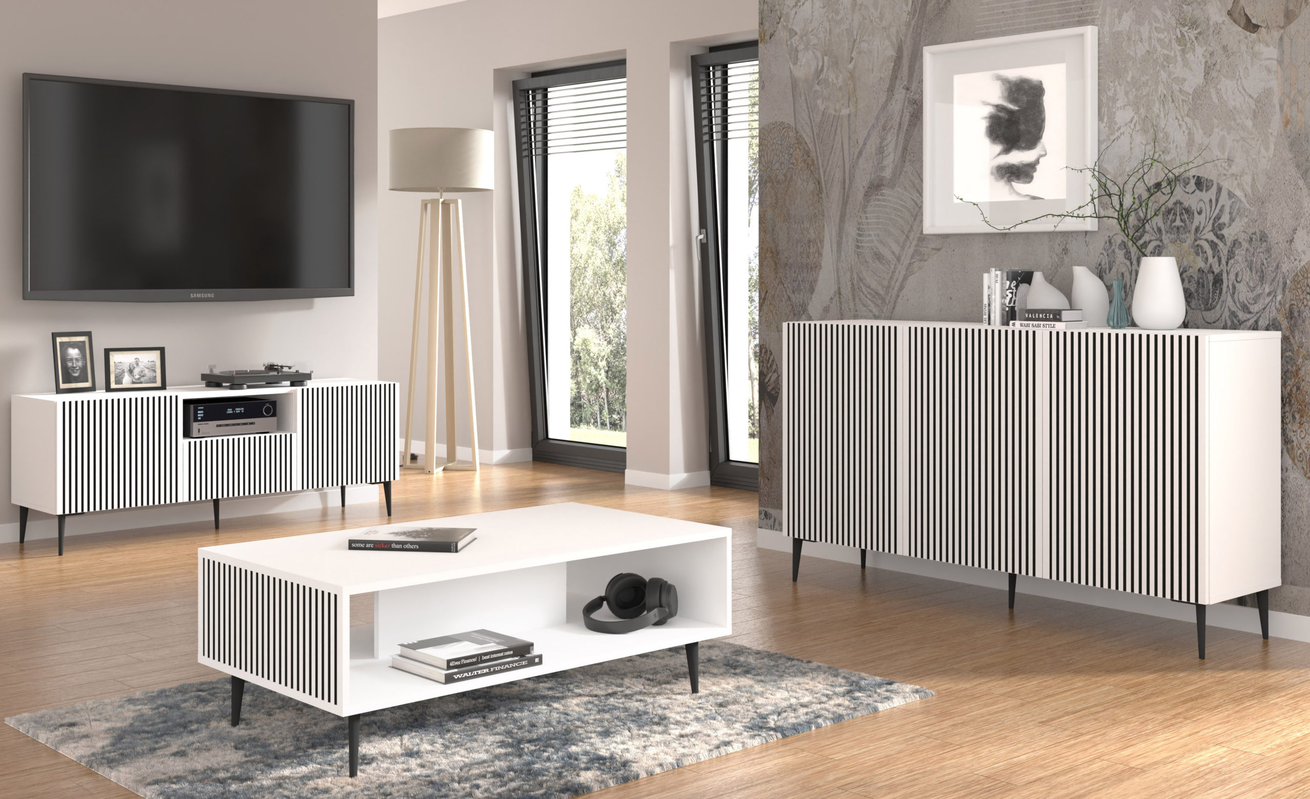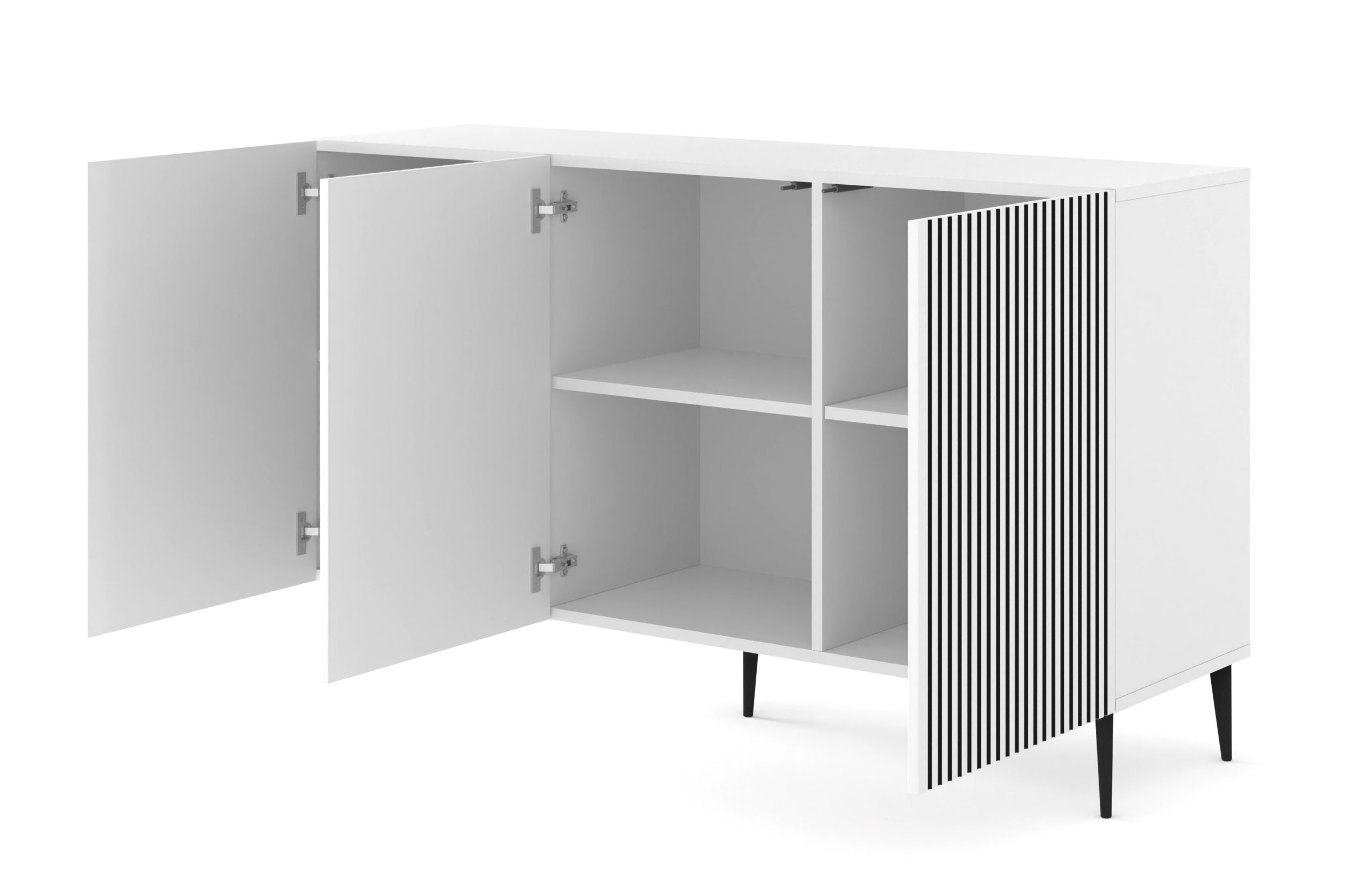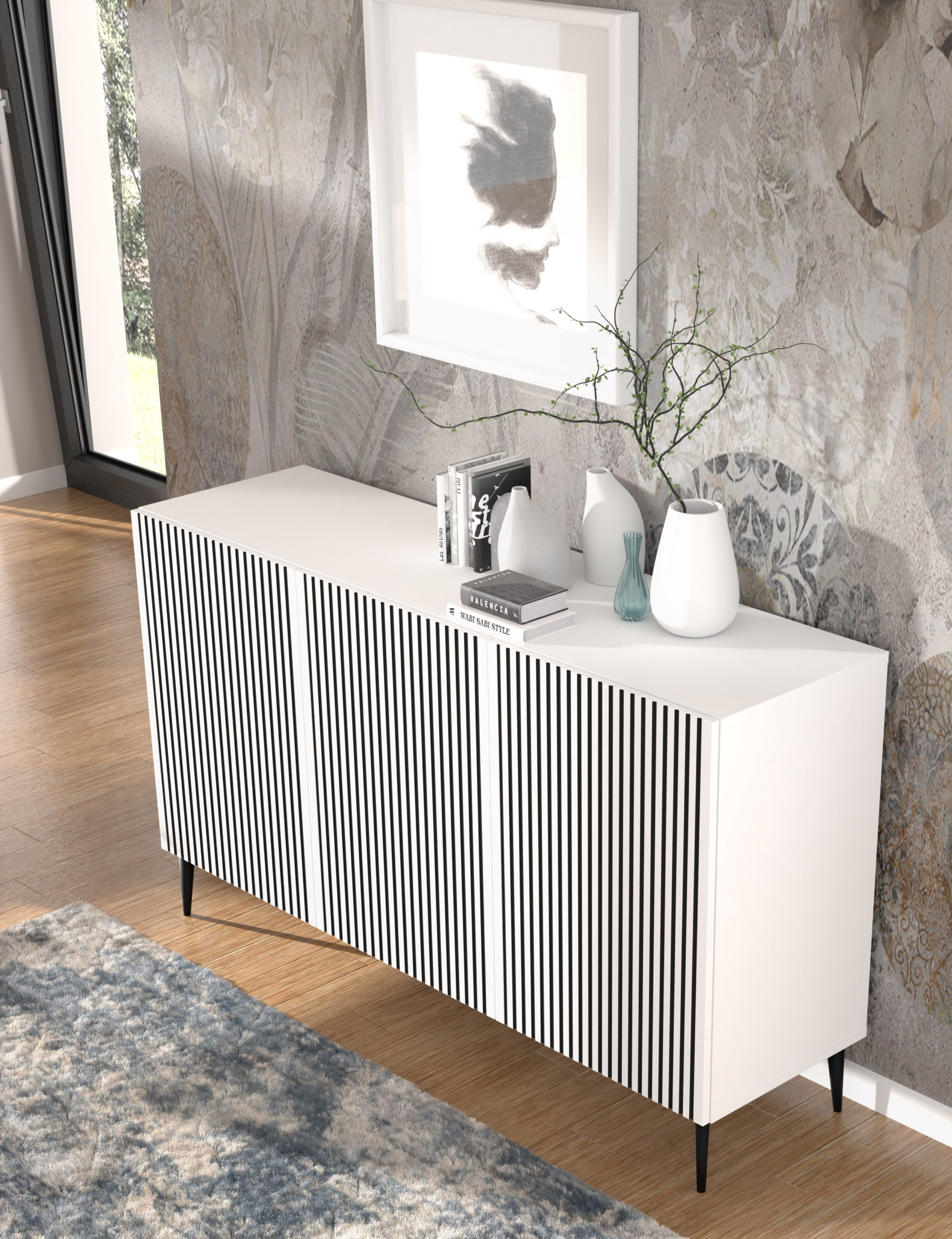 Kolekcja Ravenna to propozycja dla osób, które poszukują we wnętrzach balansu między surowym minimalizmem a wyrafinowaną elegancją. Prezentowana trzydrzwiowa komoda to projekt, który redefiniuje pojęcie nowoczesnego mebla do przechowywania. Największym atutem bryły są fronty wykonane z wysokogatunkowej płyty MDF, zdobione pionowymi, czarnymi frezami. Kontrast czystej bieli z ciemnymi liniami nadaje meblowi graficznego, niemal architektonicznego charakteru, sprawiając, że komoda Ravenna o szerokości niemal 150 cm wygląda niezwykle smukło i stylowo.
