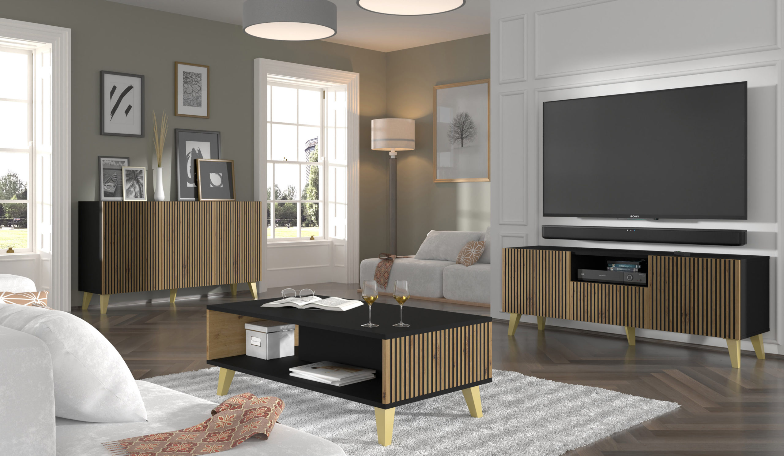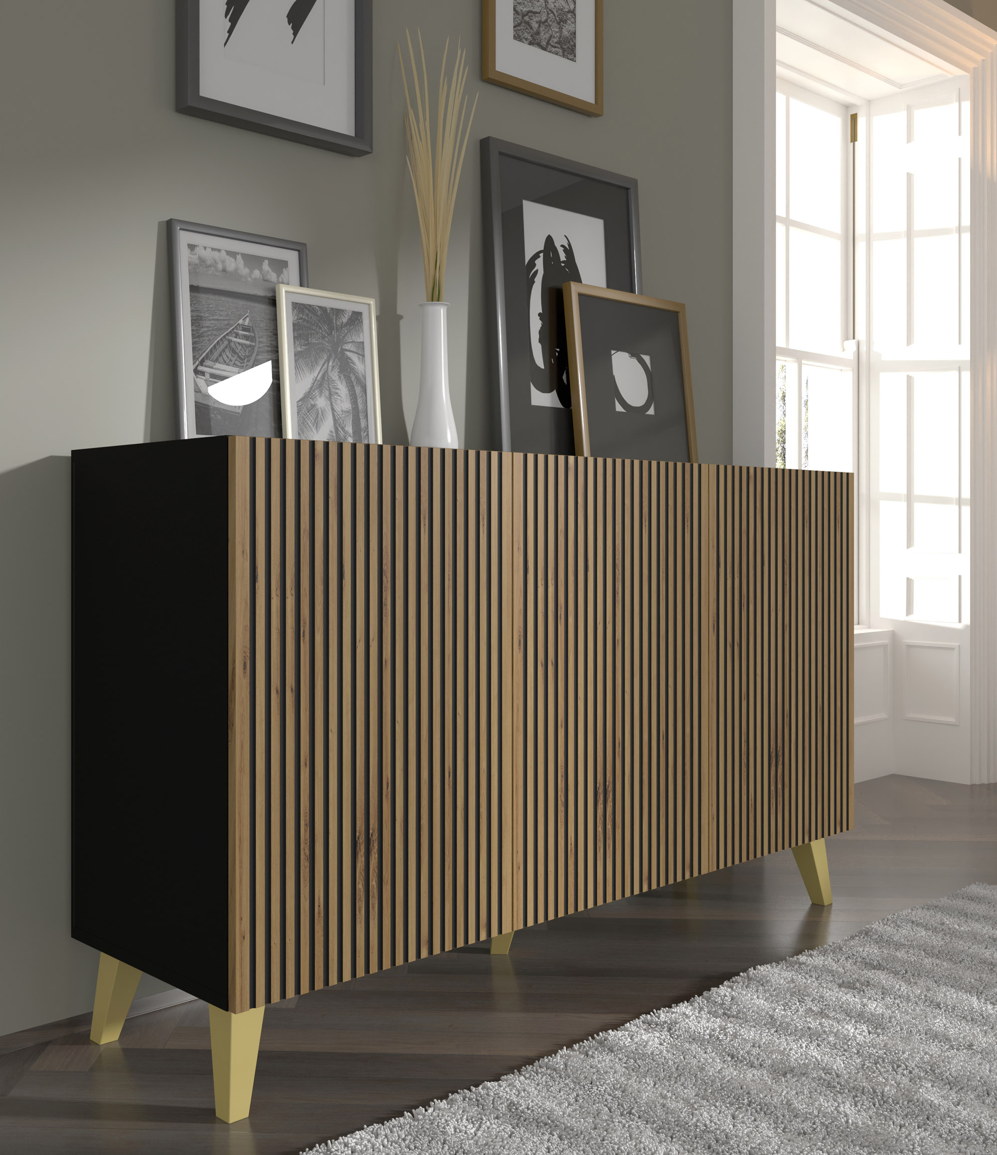 Komoda Ravenna to kwintesencja nowoczesnego stylu, która łączy surową elegancję czarnego matu z ciepłym, naturalnym odcieniem dębu artisan. Jej najbardziej rozpoznawalnym elementem są fronty z precyzyjnym, pionowym frezowaniem, które nadają bryle rzeźbiarskiej głębi i unikalnego sznytu. Ta trzydrzwiowa komoda o szerokości 150 cm oferuje imponującą przestrzeń do przechowywania, ukrytą za bezuchwytowymi frontami z systemem push to open. Osadzona na smukłych, złotych nóżkach, Ravenna zachwyca wizualną lekkością, stając się luksusowym dopełnieniem salonu, sypialni lub eleganckiego przedpokoju.