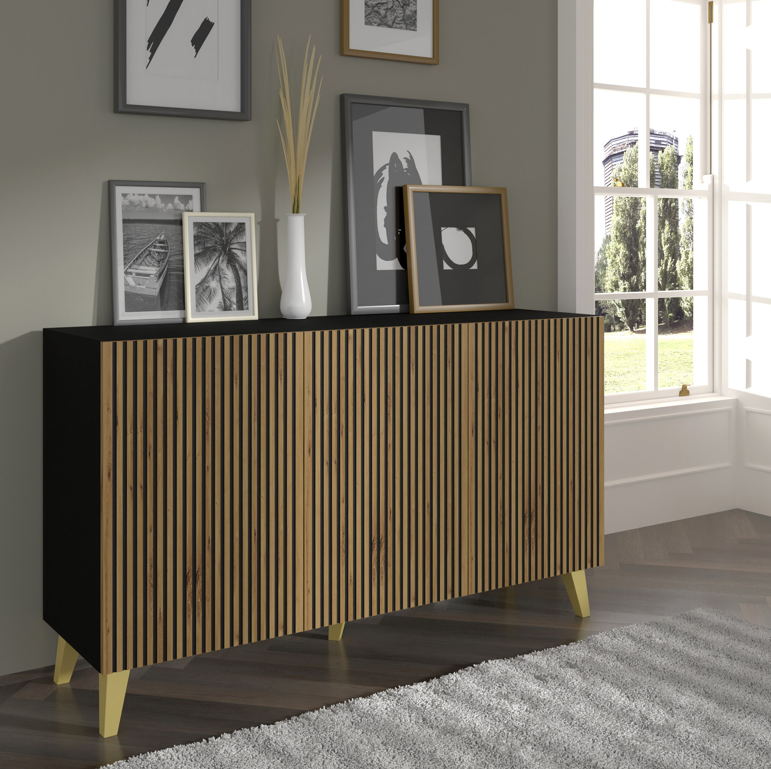 Komoda Ravenna F 150 cm 3D czarny / artisan szpilka złota plastikowa