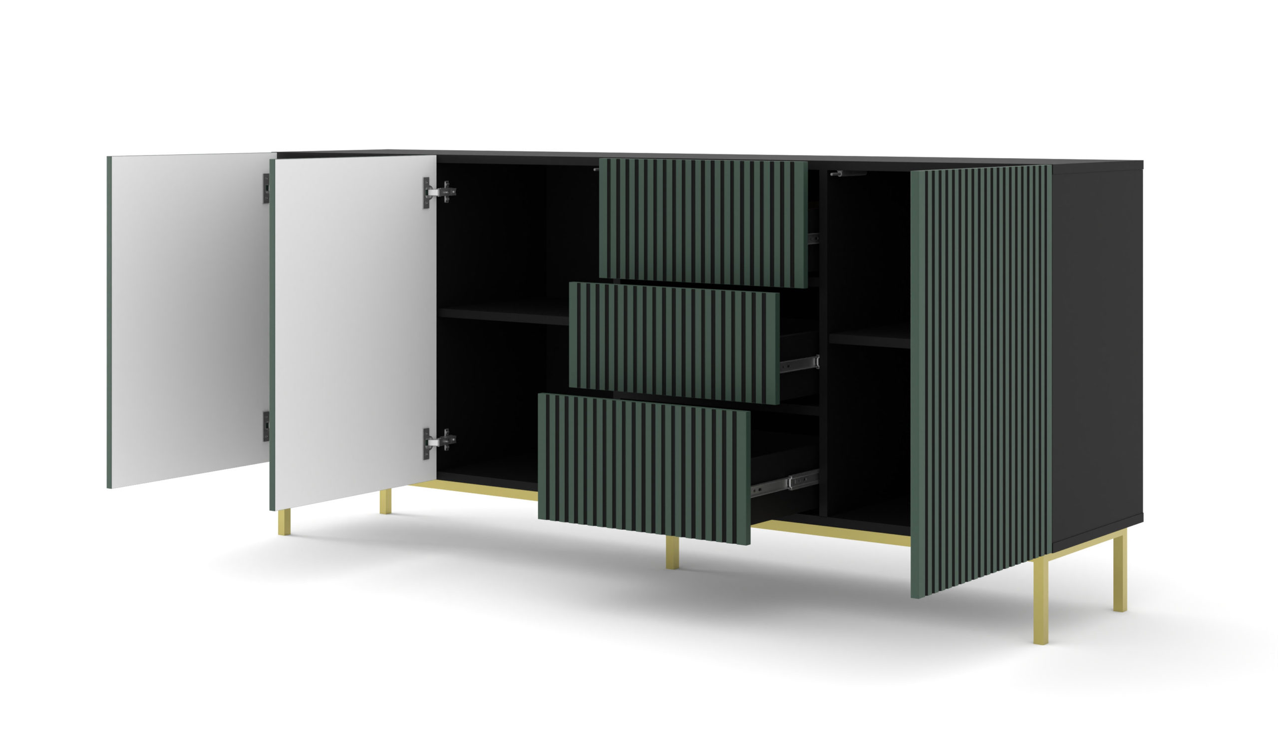 Komoda RAVENNA F 200 cm 3D3S czarny mat / ciemna zieleń rama złota