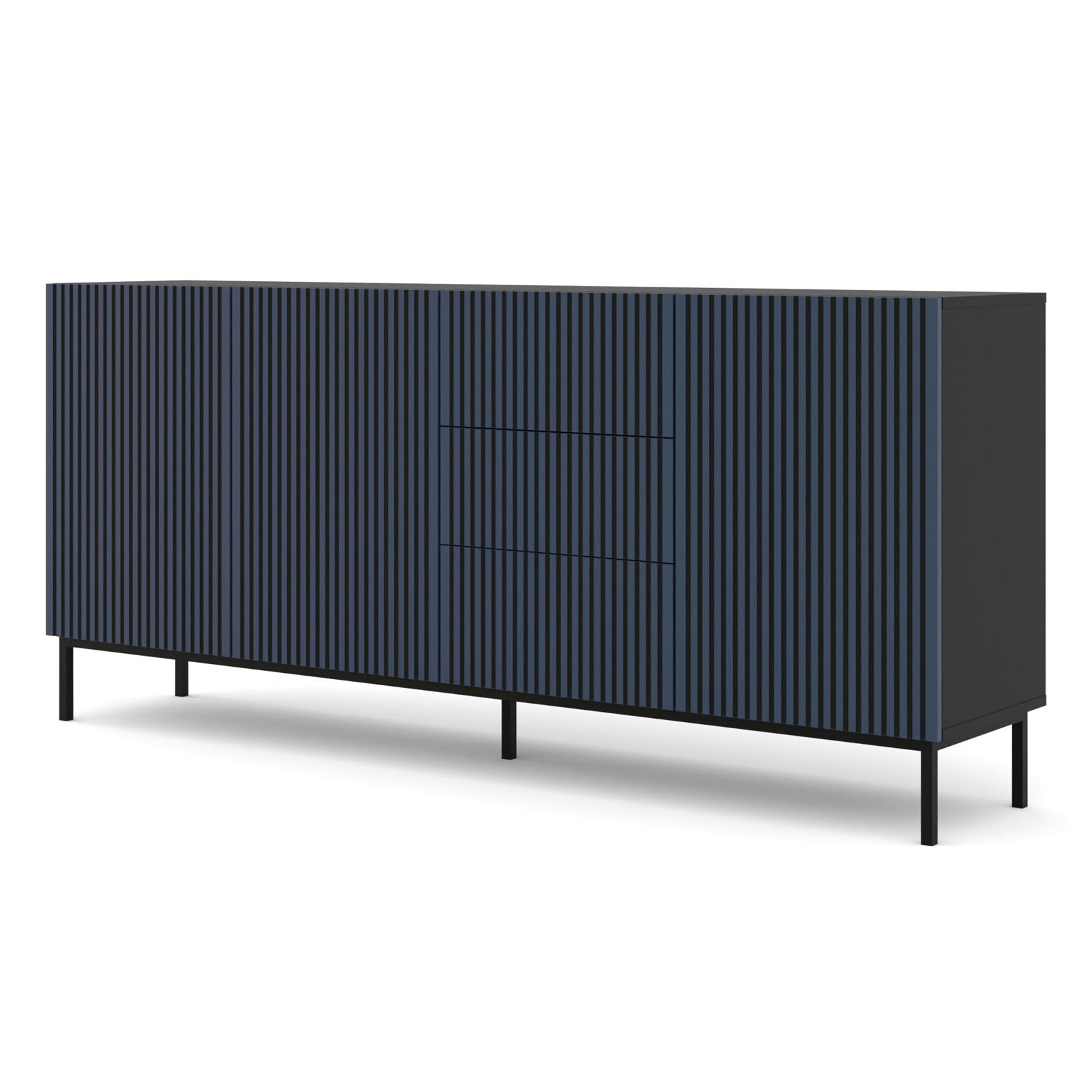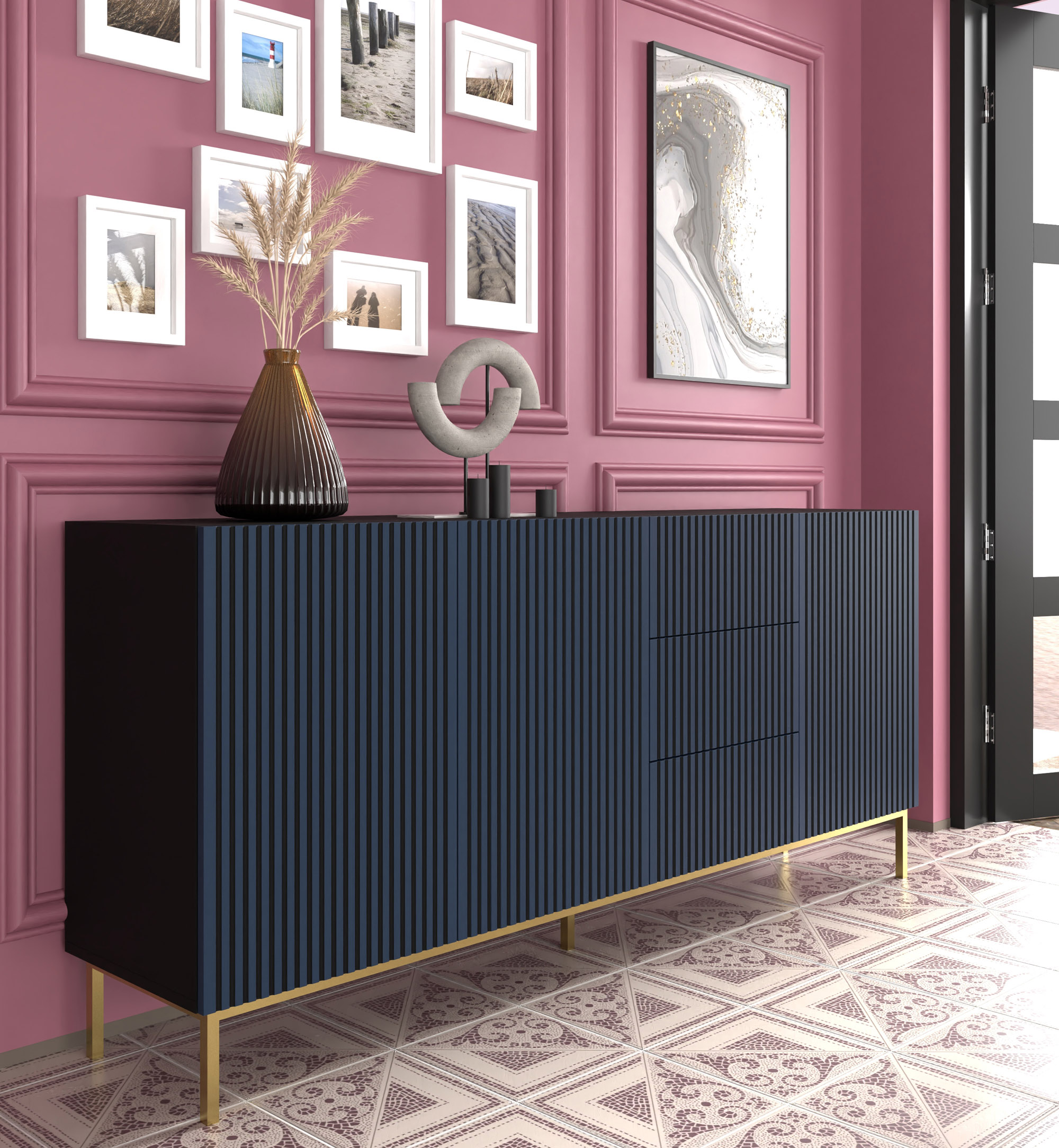 Komoda z kolekcji Ravenna F o szerokości 200 cm to propozycja dla wizjonerów, którzy w projektowaniu wnętrz poszukują emocji i bezkompromisowego stylu. Połączenie czerni z nasyconym granatem to jeden z najsilniejszych trendów współczesnego wzornictwa, wprowadzający do pomieszczenia aurę spokoju, a zarazem luksusowego niedopowiedzenia. Charakterystyczne, czarne żłobienia na granatowych frontach MDF tworzą rytmiczny wzór, który w zależności od oświetlenia wydobywa z mebla architektoniczną głębię i nowoczesną dynamikę.