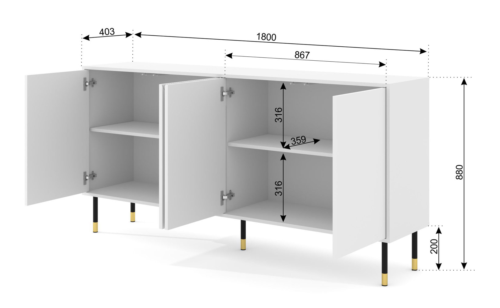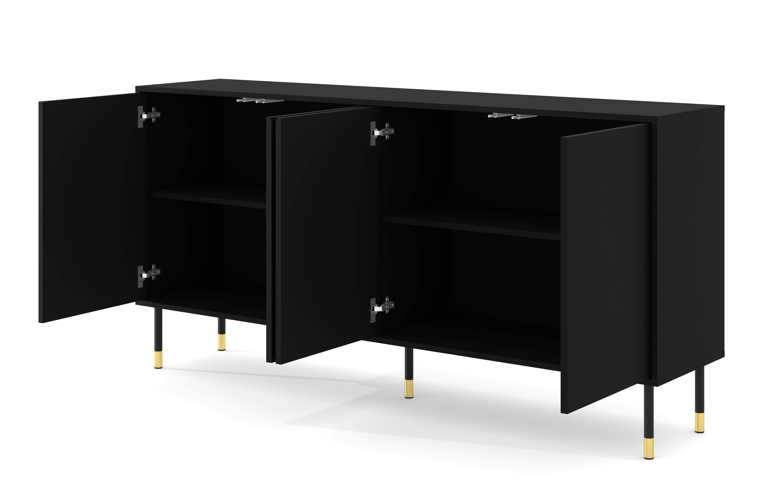Wyjątkowy sznyt mebla potęgują metalowe nóżki o wysokości 20 cm. Ich czarna matowa kolorystyka, zwieńczona szlachetnymi złotymi akcentami na końcach, wprowadza do wnętrza powiew stylu modern glamour. Wysoka podstawa nadaje bryle wizualnej zwiewności, sprawiając, że mimo swojej szerokości komoda nie przytłacza pomieszczenia. Jest to również rozwiązanie niezwykle praktyczne – prześwit pod meblem umożliwia swobodną pracę robotom sprzątającym, ułatwiając zachowanie idealnej czystości bez konieczności przesuwania mebla.