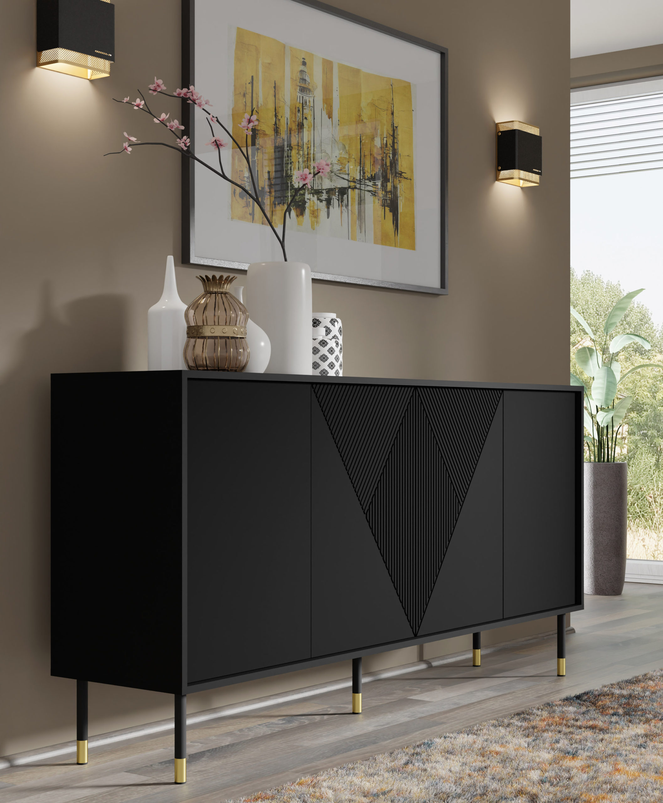 Komoda Woody to deklaracja nowoczesnego luksusu, która zamieni Twój salon lub sypialnię w przestrzeń o architektonicznej precyzji. Ta 180-centymetrowowa bryła w głębokim, czarnym macie wyróżnia się rzeźbiarskimi frontami MDF, ozdobionymi hipnotyzującym motywem geometrycznych trójkątów. Prestiżowy charakter mebla podkreślają smukłe, czarne nóżki ze złotymi detalami, które nadają konstrukcji lekkości i biżuteryjnego blasku. Dzięki systemowi push to open oraz czterem pojemnym szafkom, komoda Woody oferuje potężną przestrzeń do przechowywania, łącząc minimalistyczną formę z odważnym, nowoczesnym designem.
