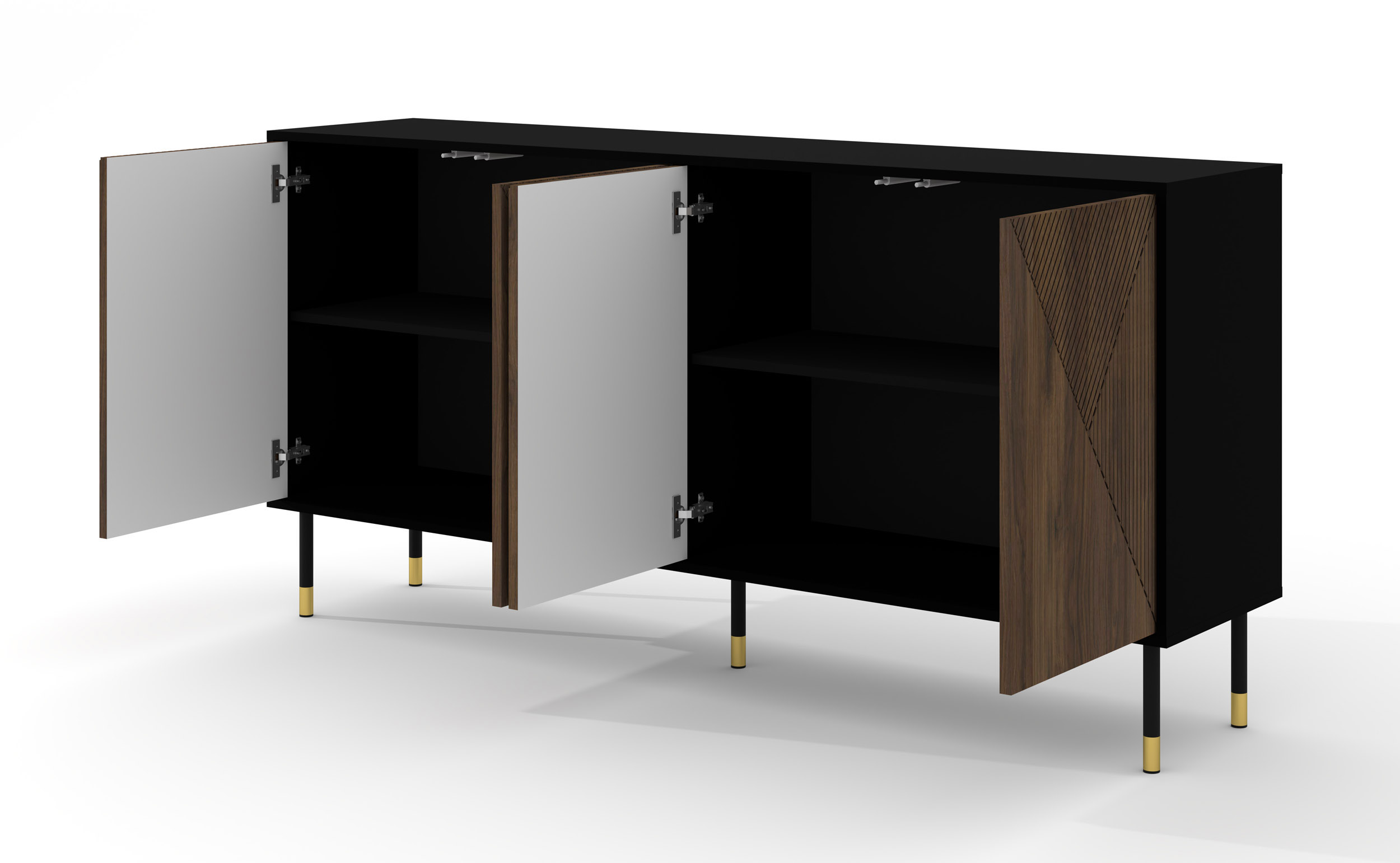 Komoda Woody IV to kwintesencja nowoczesnego luksusu, która wnosi do wnętrza architektoniczną precyzję i naturalne ciepło. Ta monumentalna, 180-centymetrowa bryła zachwyca unikatowymi frontami w kolorze dębu catania, ozdobionymi hipnotyzującym, geometrycznym frezowaniem. Zestawienie głębokiego, matowego czarnego korpusu z biżuteryjnymi nóżkami w odcieniu czerni i złota tworzy prestiżową kompozycję, obok której nie da się przejść obojętnie. Wyposażona w cztery szafki z systemem push to open, komoda Woody IV oferuje potężną przestrzeń do przechowywania, łącząc w sobie duszę rzemieślniczego designu z nowoczesnym minimalizmem.
