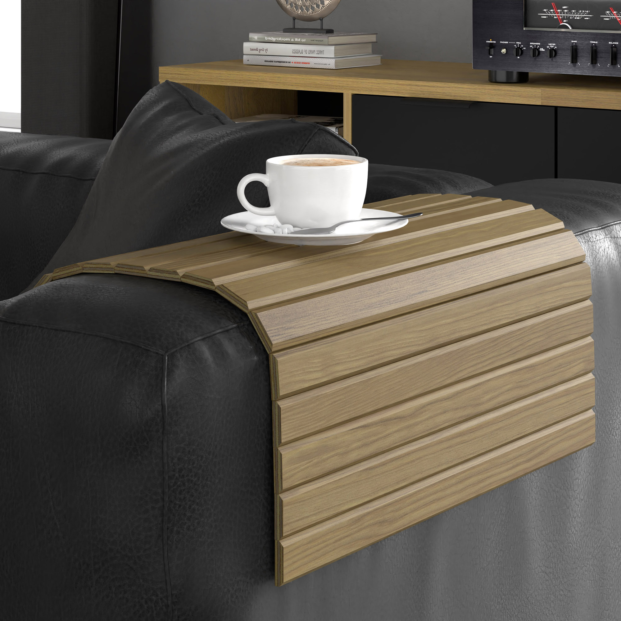 Przekształć bok swojej sofy w funkcjonalny stolik kawowy dzięki tej eleganckiej drewnianej nakładce w odcieniu dębu. To niezwykle praktyczne rozwiązanie tworzy twardą, stabilną powierzchnię na miękkich meblach tapicerowanych, idealną pod kubek gorącej herbaty, kieliszek wina czy laptopa. Wykonana z lakierowanych dębowych listewek podklejonych bawełnianym płótnem, nakładka jest elastyczna i doskonale dopasowuje się do kształtu podłokietnika. Wybierz ten estetyczny dodatek, aby chronić tapicerkę przed zabrudzeniami i cieszyć się komfortem bez konieczności wstawania z ulubionej kanapy.