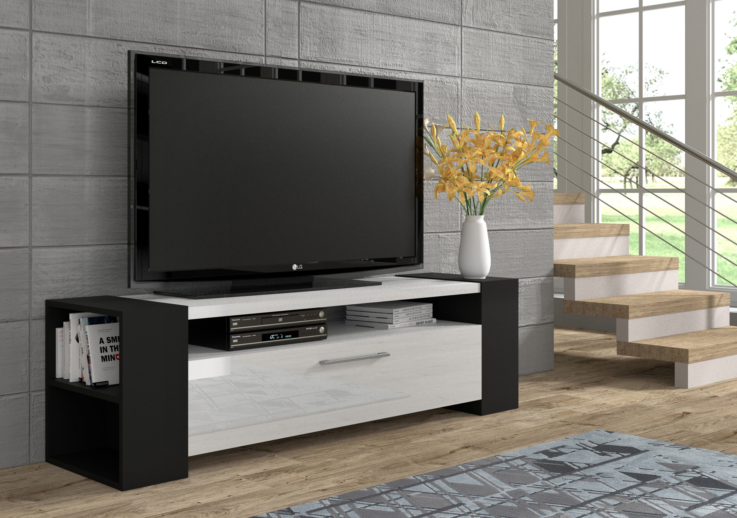 Szafka RTV Livia to wyrafinowane połączenie nowoczesnej estetyki z praktycznym podejściem do organizacji domowego salonu. Jej design opiera się na stylowym kontraście czarnego, matowego korpusu z lśniącymi frontami i blatem w kolorze białego połysku, co nadaje bryle luksusowego charakteru. Mebel oferuje przemyślany układ przestrzeni, obejmujący zarówno otwarte wnęki na sprzęt multimedialny i głośniki, jak i zamykaną szafkę z wewnętrzną przegrodą na przedmioty, które chcemy ukryć przed wzrokiem. Całość osadzono na charakterystycznej podstawie, która nie tylko zapewnia wyjątkową stabilność, ale również podkreśla unikalny i nowoczesny styl tej wyjątkowej szafki.