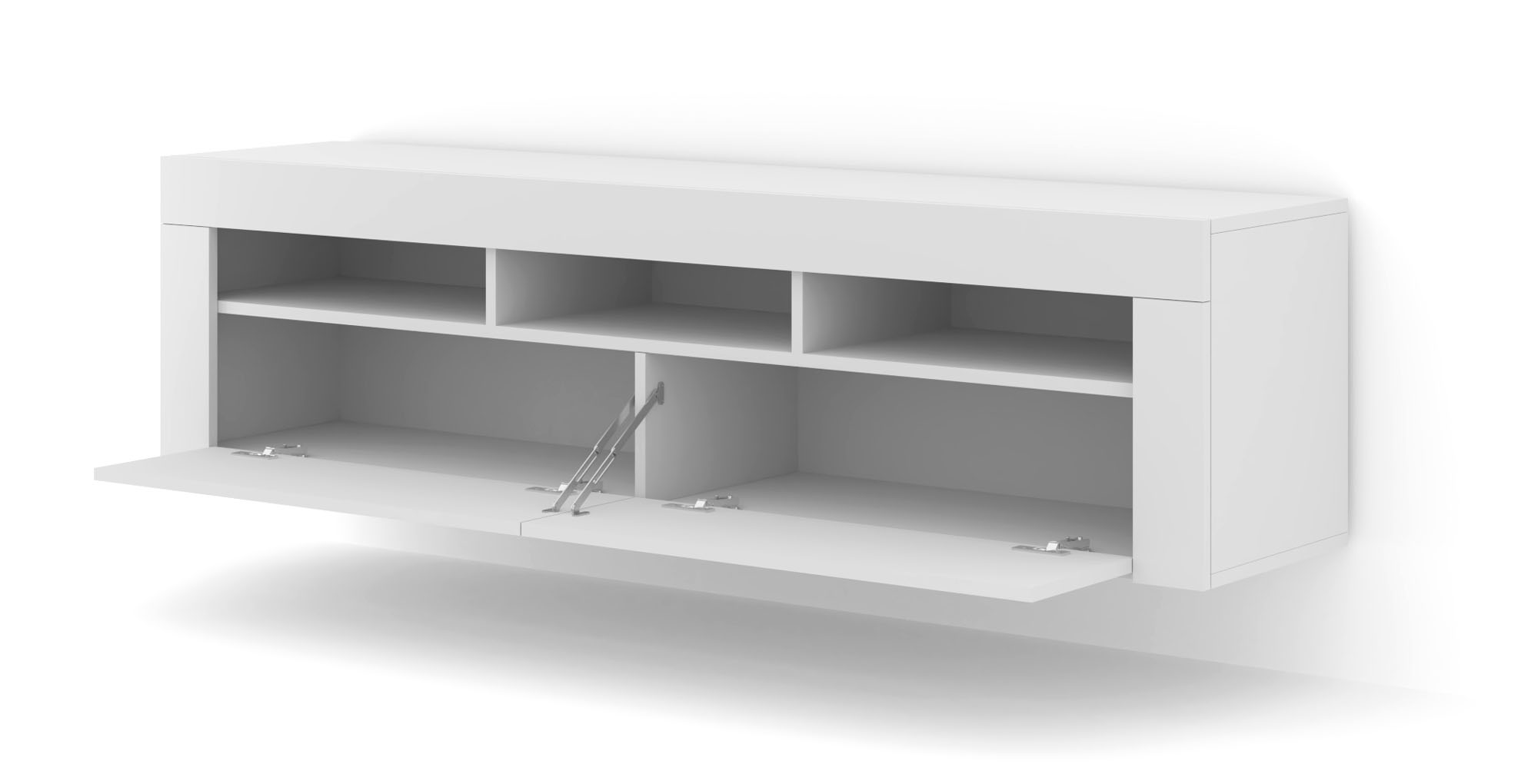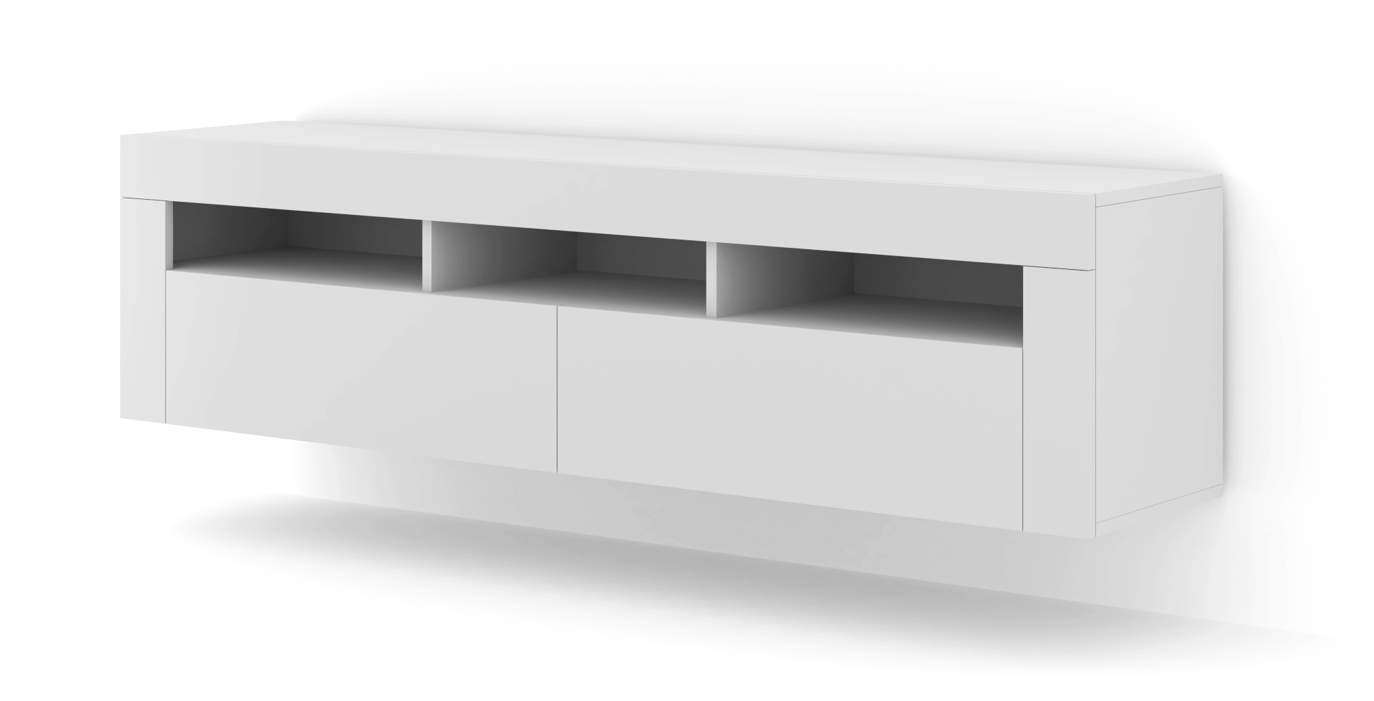 Szafka RTV MORENO w wydaniu biały mat to kwintesencja nowoczesnego minimalizmu i funkcjonalnej czystości. Ta uniwersalna konstrukcja o szerokości 160 cm daje Ci pełną swobodę aranżacyjną – możesz ją zawiesić na ścianie, by nadać salonowi lekkości, lub postawić na opcjonalnych nóżkach. Połączenie otwartych wnęk na multimedia z zamykanymi schowkami sprawia, że MORENO w inteligentny sposób porządkuje przestrzeń, wprowadzając do niej harmonię i jasność. Wybierz mebel, który nie tylko pomieści Twój sprzęt, ale stanie się subtelnym, eleganckim tłem dla Twojego domowego życia.