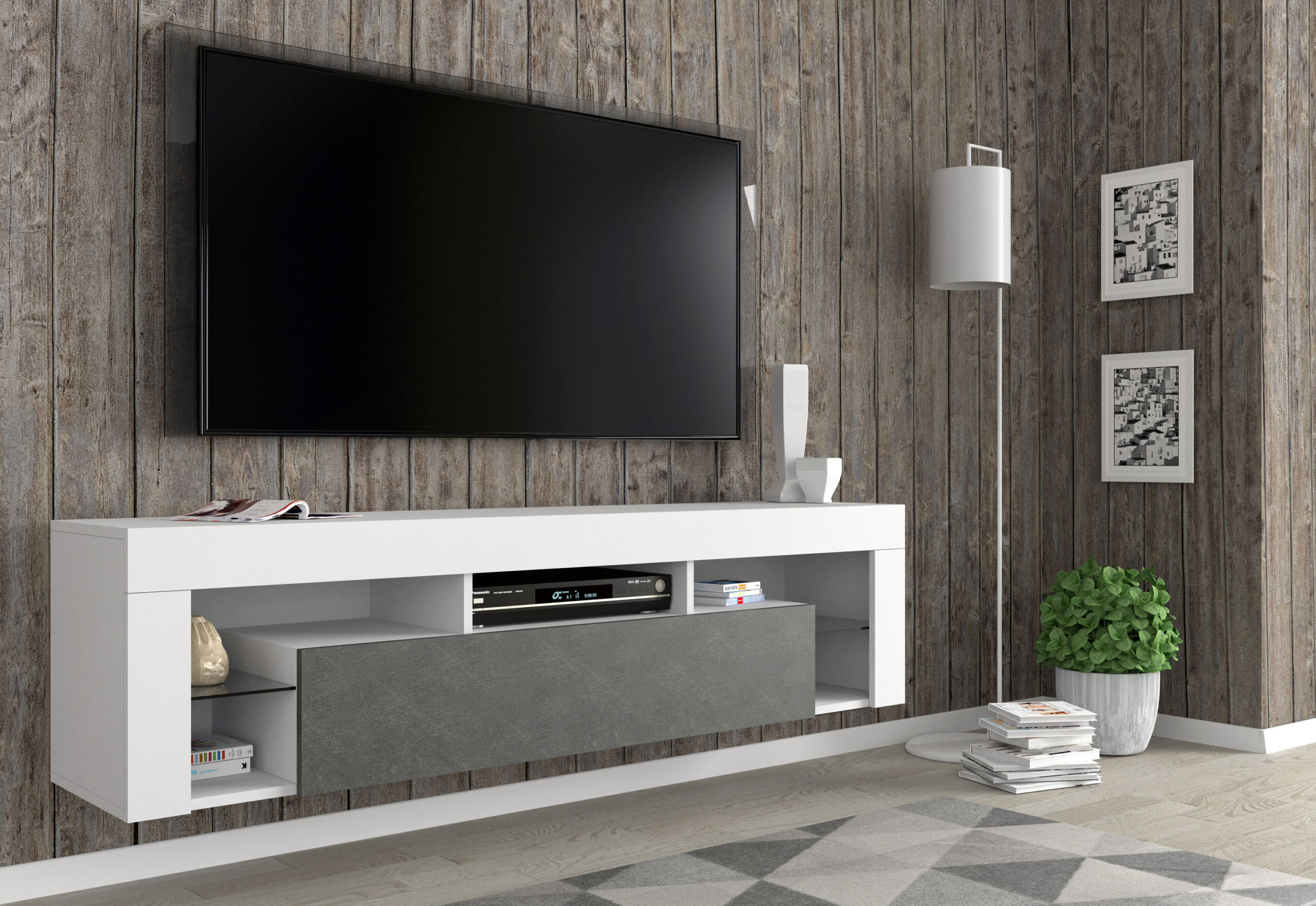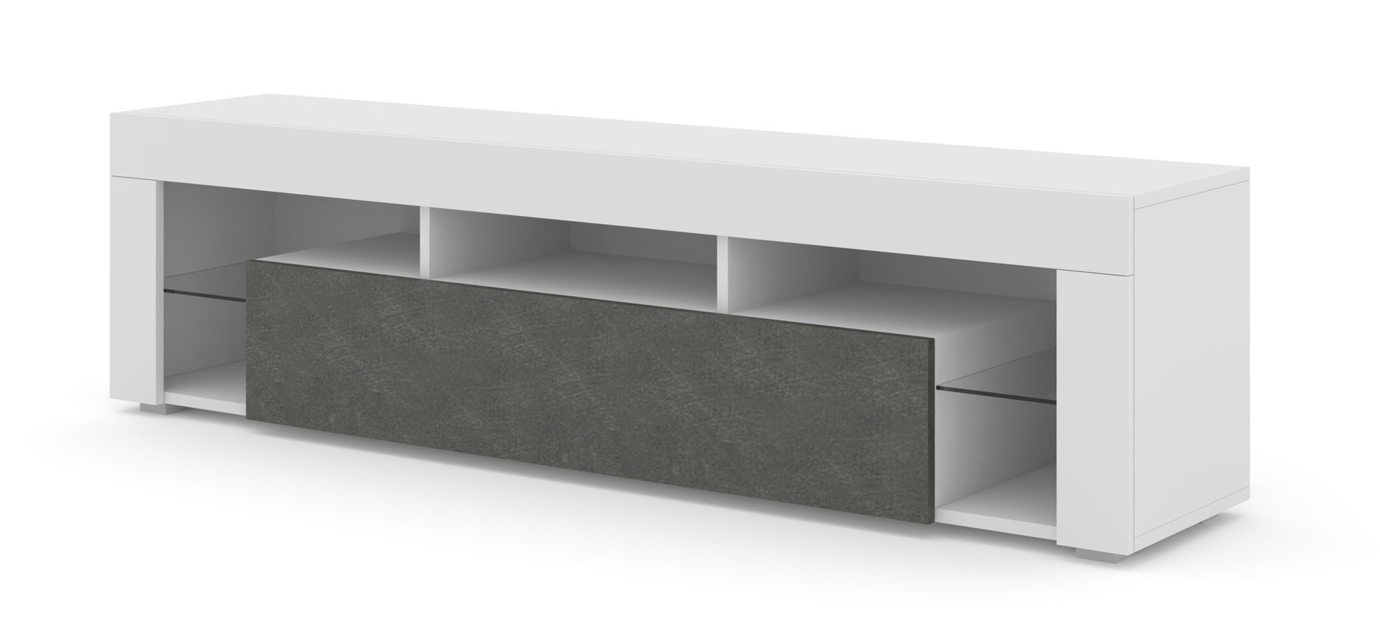 Poszukiwanie idealnego mebla do salonu często kończy się kompromisem między stylem a funkcjonalnością. Szafka RTV KAYA eliminuje ten dylemat, oferując nieszablonowe wzornictwo, które przyciąga wzrok od pierwszego spojrzenia. Zestawienie białego, matowego korpusu z frontem w kolorze Matera – imitującym ciemny, przetarty kamień lub beton – tworzy nowoczesny kontrast, który doskonale odnajdzie się we wnętrzach typu loft, modern oraz tych o bardziej skandynawskim rodowodzie. To mebel dla osób, które chcą nadać swojej strefie multimedialnej wyrazisty, architektoniczny sznyt.
