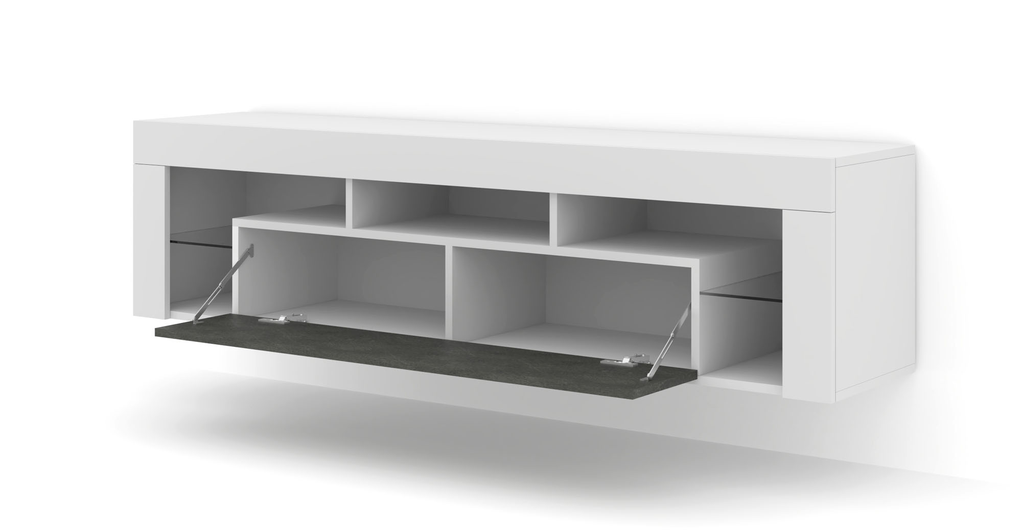 Struktura przechowywania w modelu KAYA została przemyślana tak, aby maksymalnie wykorzystać 160 cm szerokości. Centralnym punktem są otwarte wnęki z dwiema szklanymi półkami – to prestiżowe miejsce na dekoder, konsolę czy system audio. Szkło dodaje meblowi biżuteryjnego blasku i sprawia, że elektronika prezentuje się niezwykle nowocześnie. Dla kontrastu, szafka posiada również zamykany schowek przedzielony wewnątrz na dwie części. To idealna skrytka na wszystko, co chcesz zachować w porządku, ale poza zasięgiem wzroku gości – od dokumentów po kolekcje gier i filmów.