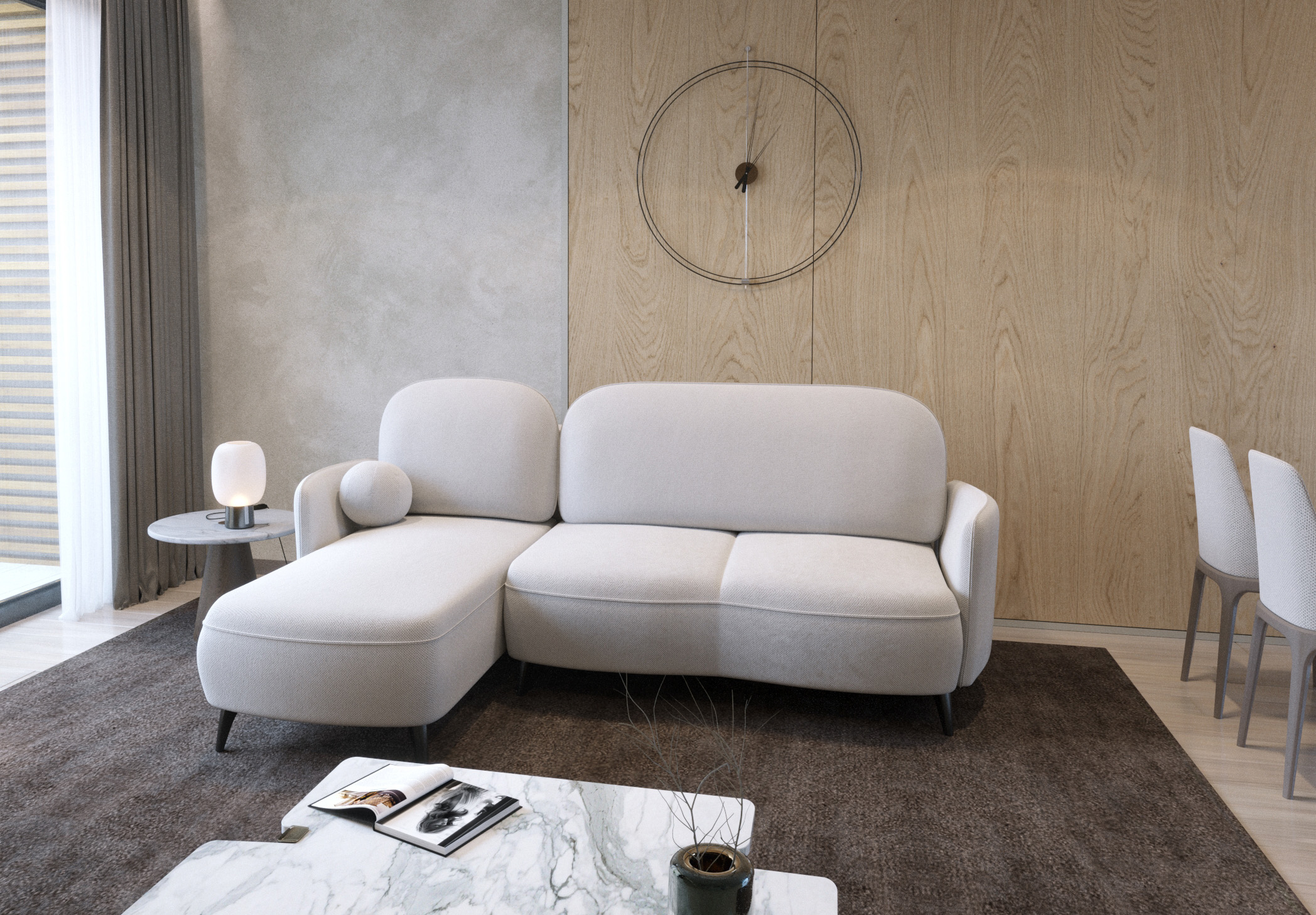 Solidna konstrukcja oparta na drewnie sosnowym i bukowym gwarantuje stabilność, która jest kluczowa dla mebli codziennego użytku. Całość osadzona została na smukłych, czarnych nóżkach o wysokości 12 cm, które nadają narożnikowi wizualnej lekkości i ułatwiają utrzymanie czystości pod meblem – bez problemu zmieści się tam większość robotów sprzątających. Minimalistyczne wykończenie w modnych odcieniach beżu sprawia, że narożnik CLOUD staje się uniwersalną bazą dla wielu aranżacji, od surowych wnętrz industrialnych po przytulne przestrzenie w stylu nowoczesnym.