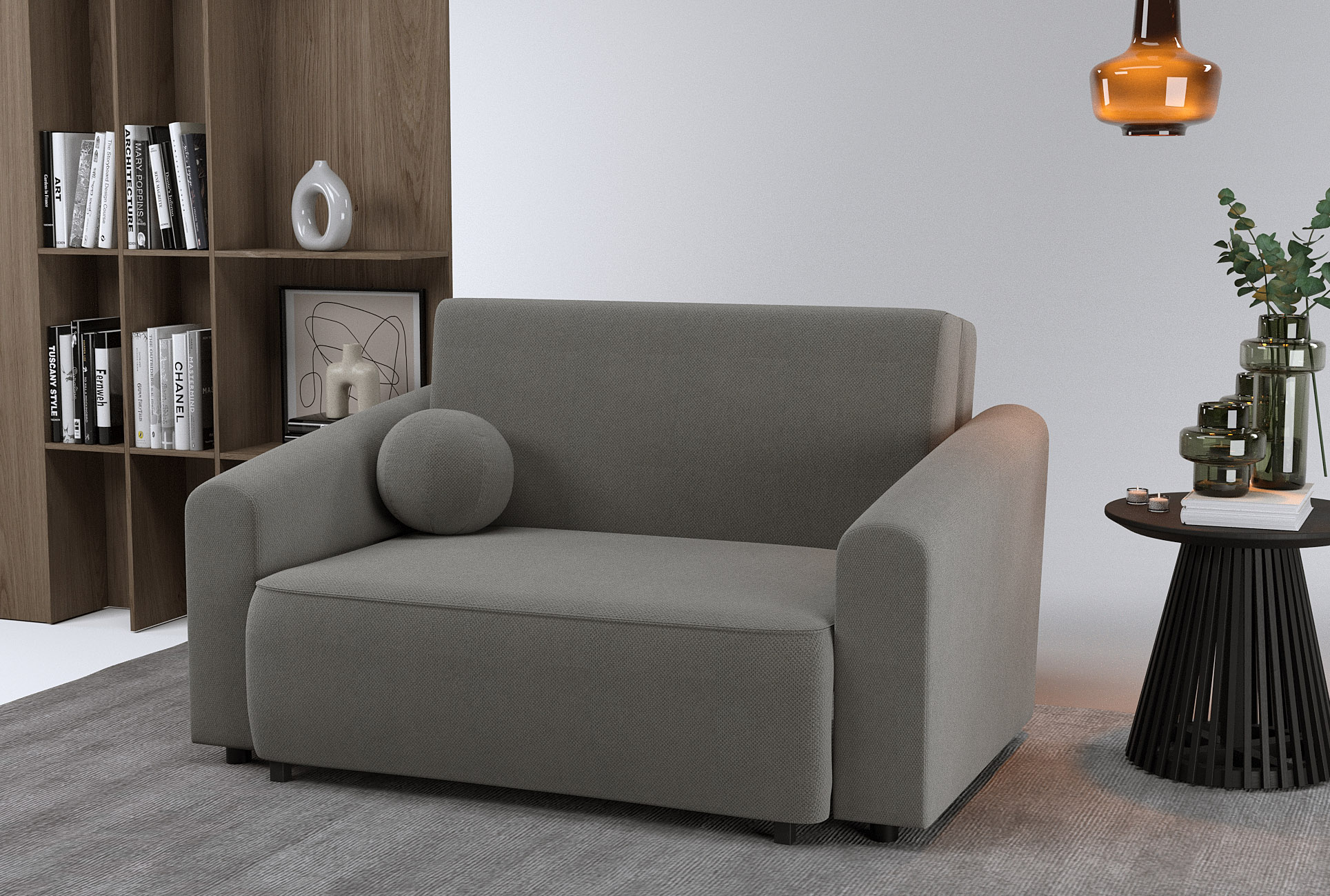 Sofa NESSO w odcieniu popielatym to inteligentne dopełnienie współczesnego salonu, które łączy luksusową strefę wypoczynku z praktyczną funkcją spania. Dzięki szerokiemu siedzisku opartemu na sprężynach falistych i solidnemu, drewnianemu stelażowi, mebel oferuje nieprzeciętny komfort i trwałość na lata. Innowacyjna tkanina z technologią WATER REPELLENT gwarantuje spokój podczas codziennego użytkowania, chroniąc popielatą dzianinę przed przypadkowymi plamami. Wyposażona w pojemny schowek na pościel i intuicyjny mechanizm rozkładania, sofa NESSO staje się fundamentem funkcjonalnego i stylowego wnętrza.