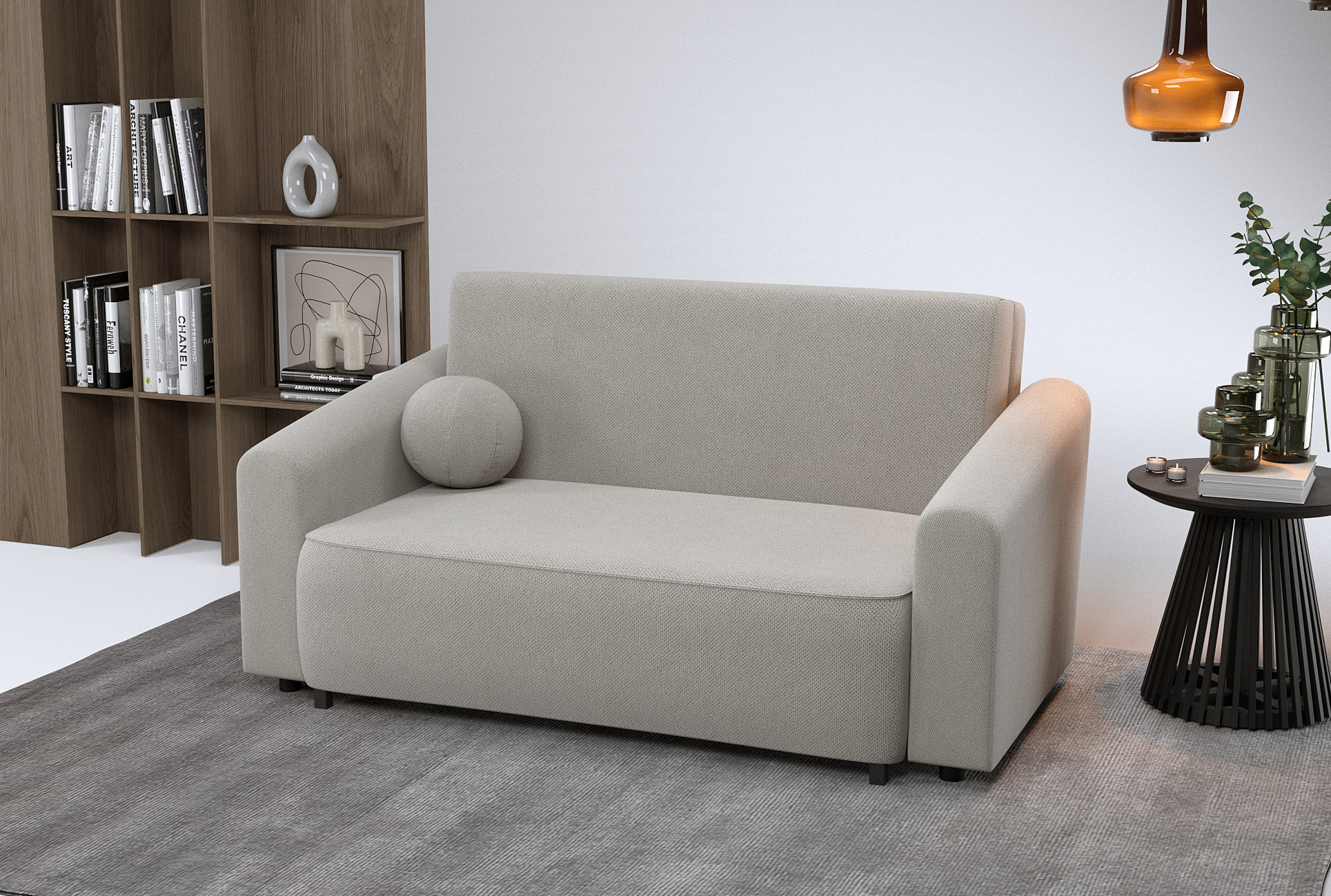 Dwuosobowa sofa NESSO to idealny kompromis między elegancją a codzienną praktycznością. Jej 130-centymetrowe siedzisko zapewnia wyjątkową wygodę podczas wspólnego odpoczynku, a po rozłożeniu oferuje komfortową powierzchnię spania zintegrowaną z pojemnikiem na pościel. Beżowa dzianina Curio, wzbogacona o barierę WATER REPELLENT, skutecznie chroni mebel przed zabrudzeniami, pozwalając cieszyć się jasną barwą bez obaw. Osadzona na solidnym, drewnianym stelażu, sofa NESSO gwarantuje stabilność i trwałość, stając się stylowym fundamentem każdego nowoczesnego salonu.