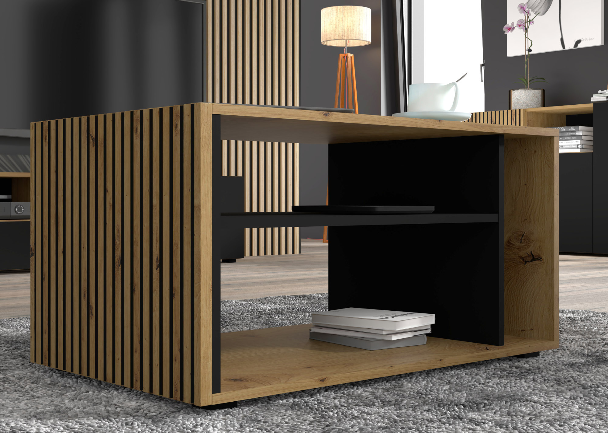 Strefa wypoczynkowa w salonie nie kończy się na wygodnej sofie – jej dopełnieniem jest inteligentnie zaprojektowany stolik kawowy. Model z kolekcji Auris to propozycja dla osób, które od mebli wymagają czegoś więcej niż tylko płaskiego blatu. Dzięki unikalnemu połączeniu ciepłego dekoru dąb artisan z matową czernią i strukturą pionowych lameli, stolik ten staje się wyrazistą dekoracją, która definiuje charakter całego pomieszczenia. To idealny wybór do wnętrz w stylu loftowym, industrialnym oraz nowoczesnym, gdzie liczy się gra faktur i precyzja wykonania.