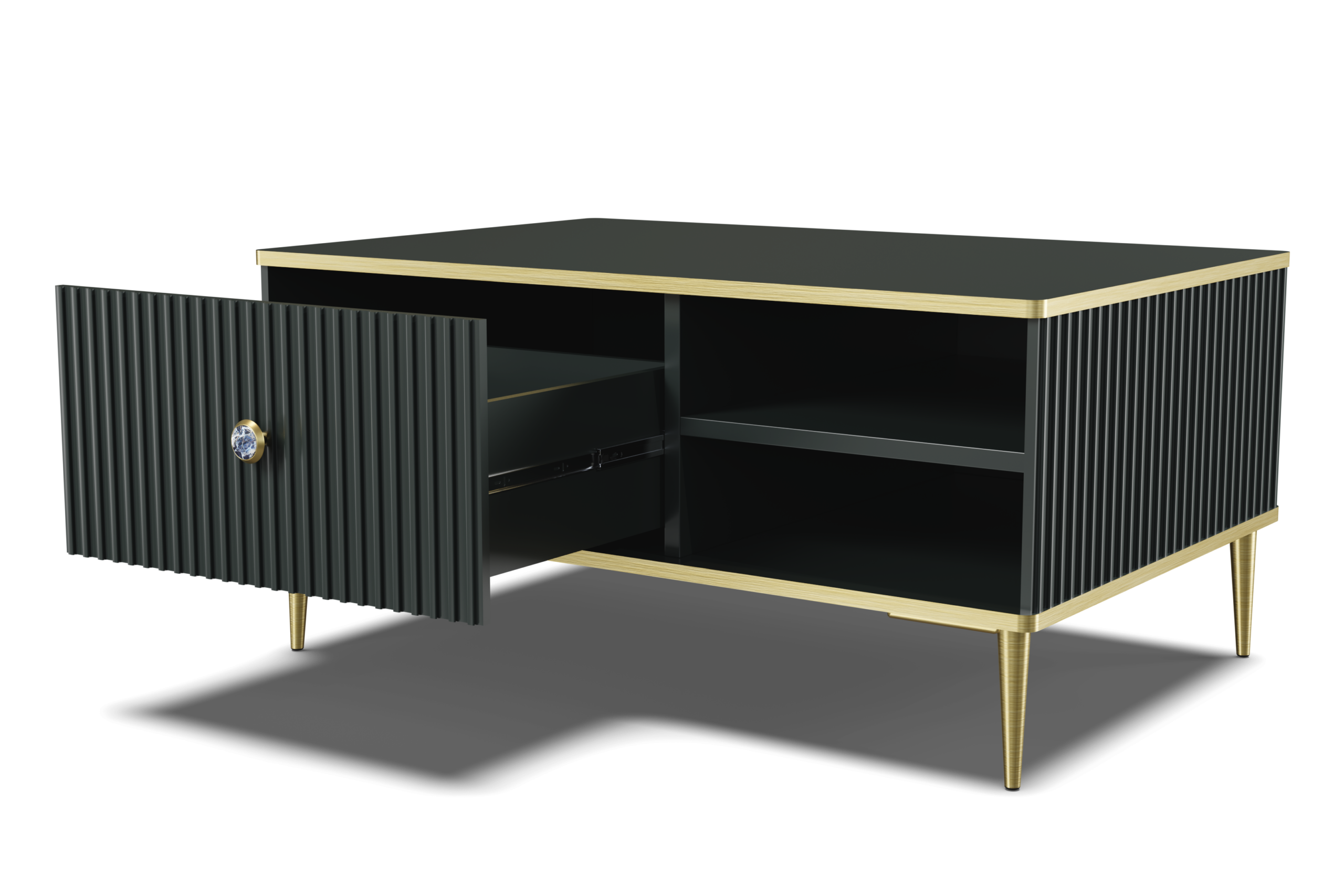 Czarny stolik kawowy Petra to kwintesencja nowoczesnego prestiżu, która wprowadza do strefy relaksu nastrojową elegancję i wyrafinowany szyk. Ta kompaktowa, rzeźbiarska bryła zachwyca precyzyjnymi, pionowymi frezowaniami zdobiącymi nie tylko front, ale i boki mebla, co nadaje jej spójny, luksusowy charakter. Głęboki mat czerni stanowi idealne tło dla biżuteryjnych akcentów w kolorze złota – smukłych nóżek, lśniącego uchwytu oraz dekoracyjnych obrzeży blatu. Wyposażony w szufladę i otwarte półki, stolik Petra perfekcyjnie łączy funkcjonalność z designem modern glamour, stając się wyrazistym punktem centralnym każdego luksusowego wnętrza.