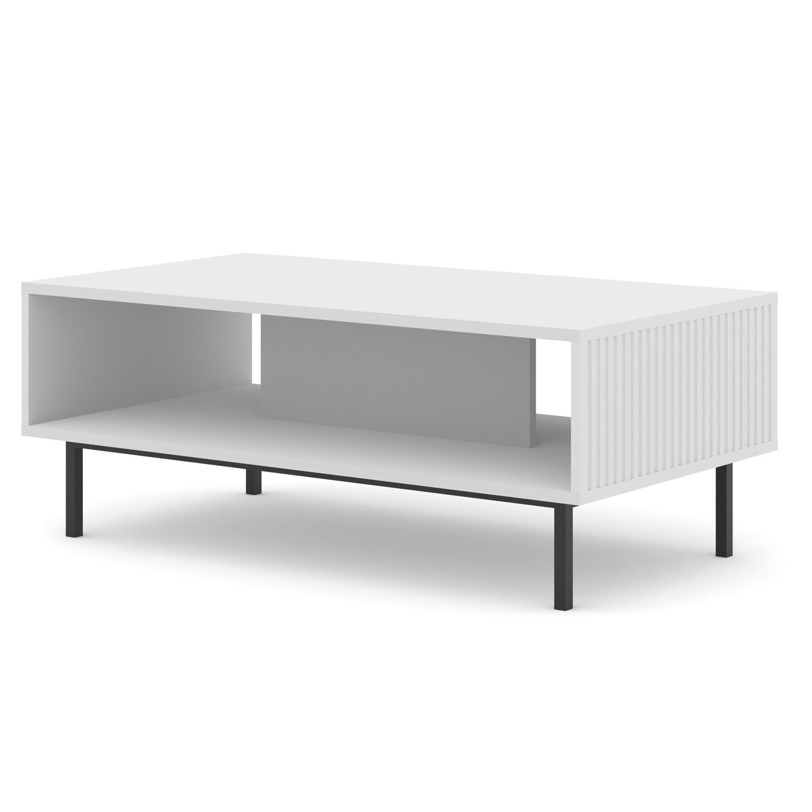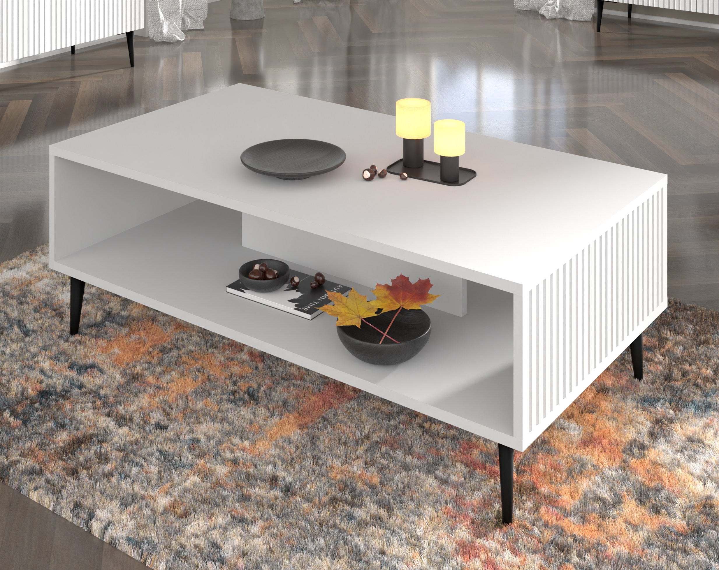 Kolekcja Ravenna w wersji na metalowych szpilkach to propozycja dla osób poszukujących mebli, które łączą minimalistyczną czystość z odważnym designem. Prezentowany stolik kawowy o szerokości 90 cm to mistrzowskie studium bieli i formy. Najbardziej charakterystycznym elementem projektu są fronty z płyty MDF – ich precyzyjne, pionowe frezowania sprawiają, że matowa powierzchnia żyje wraz z oświetleniem salonu, tworząc subtelną grę światła i cienia. To idealny wybór do jasnych apartamentów, gdzie mebel ma być nie tylko funkcjonalny, ale stanowić autonomiczną ozdobę wnętrza.