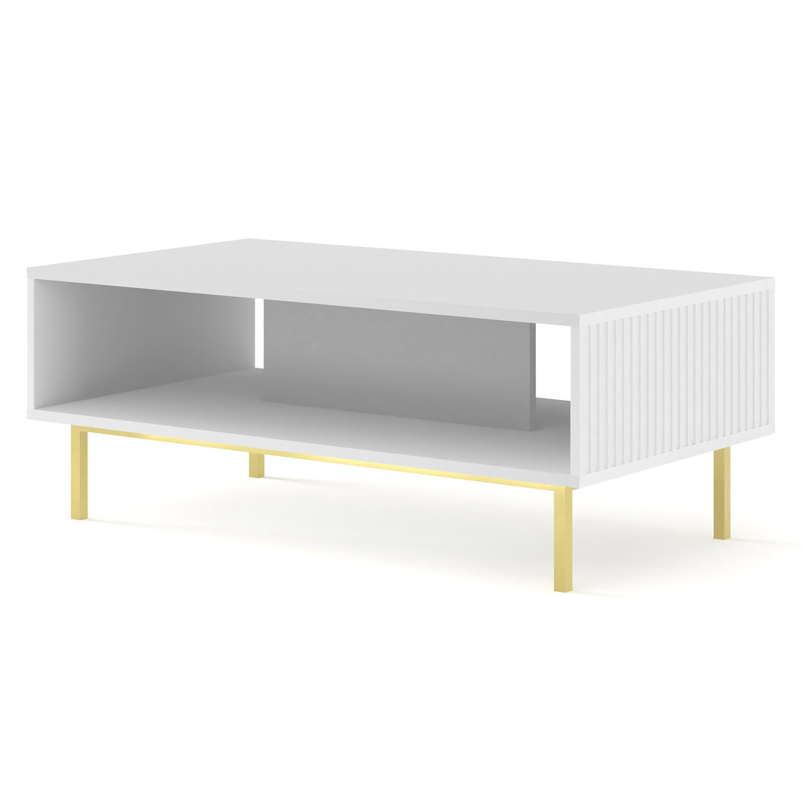 Stolik kawowy Ravenna to esencja nowoczesnej lekkości i wyrafinowanego stylu, która rozświetli serce Twojego salonu. Biała, matowa bryła wyróżnia się unikatowymi, rzeźbiarskimi frezowaniami na frontach, które nadają jej rzeźbiarskiej głębi i artystycznego sznytu. Osadzony na smukłych, metalowych szpilkach (dostępnych w kolorze złotym lub czarnym), mebel zachwyca wizualną zwiewnością, stając się biżuteryjnym dopełnieniem strefy wypoczynkowej. Wyposażony w praktyczną, obszerną półkę pod blatem, stolik Ravenna gwarantuje idealny porządek przy zachowaniu luksusowej estetyki, tworząc idealną bazę dla codziennych rytuałów przy kawie.