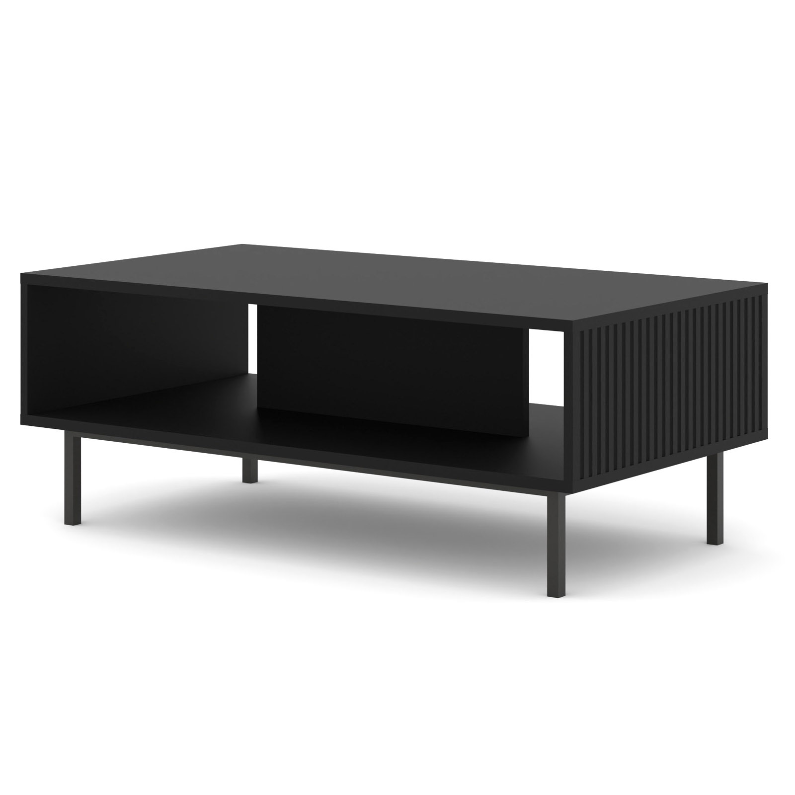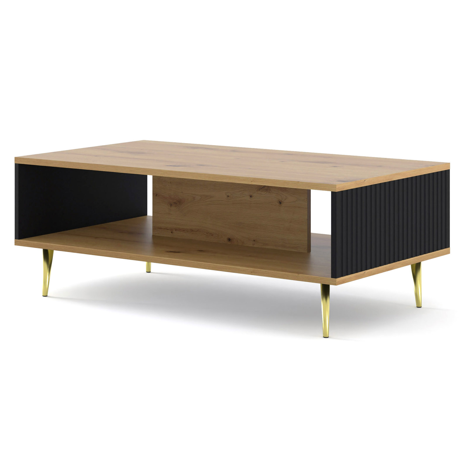 Stolik kawowy Ravenna w głębokiej, matowej czerni to esencja wieczorowej elegancji, która nada Twojemu salonowi luksusowego sznytu. Złote, metalowe nóżki stanowią biżuteryjny kontrast dla minimalistycznej bryły, czyniąc mebel centralnym punktem nowoczesnej aranżacji. Unikalne, frezowane fronty dodają całości artystycznej głębi, a szeroki blat i praktyczna półka dbają o nienaganny ład w strefie wypoczynku. To idealne połączenie…