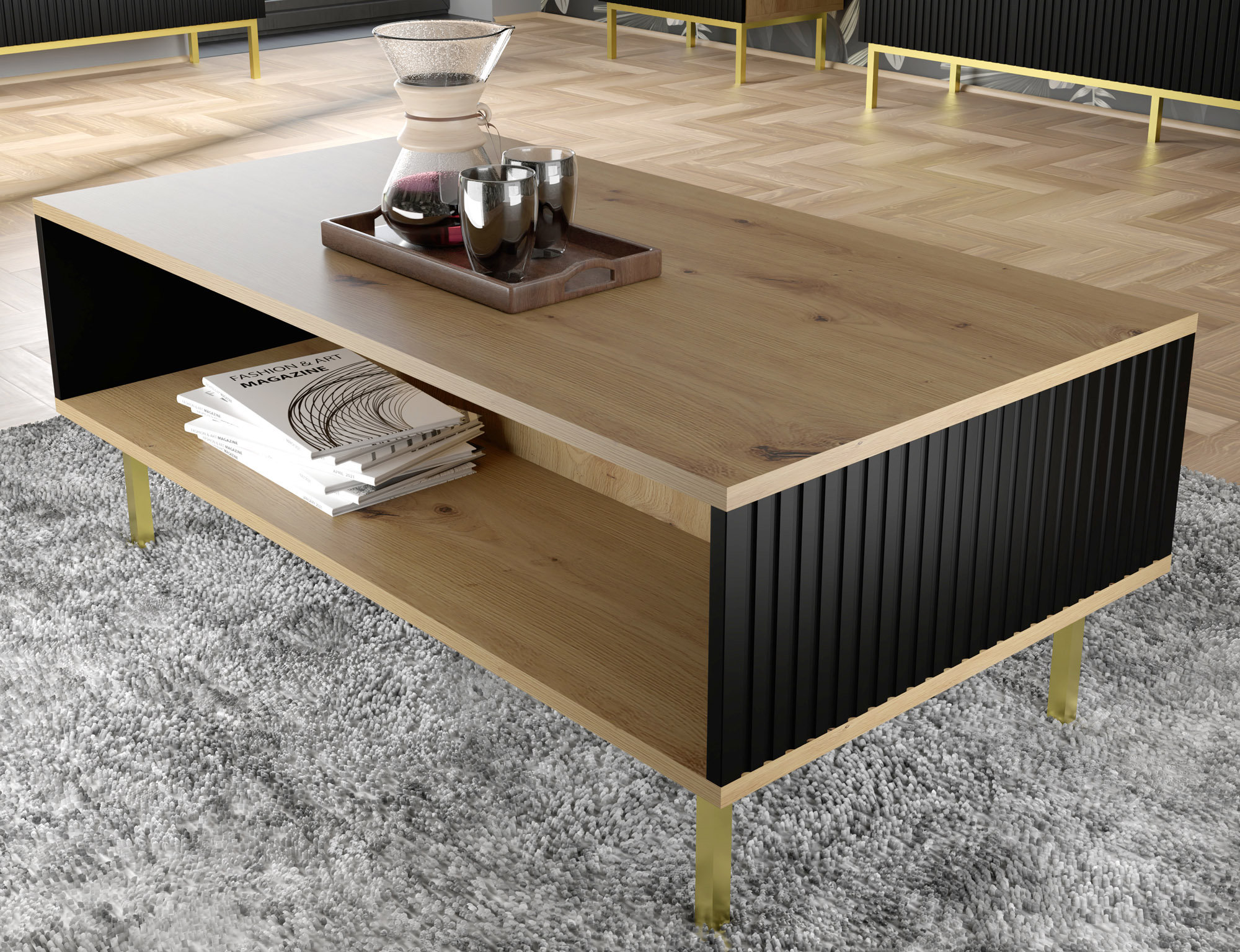Stolik kawowy RAVENNA B 90×60 cm dąb artisan / czarny mat szpilki złote
